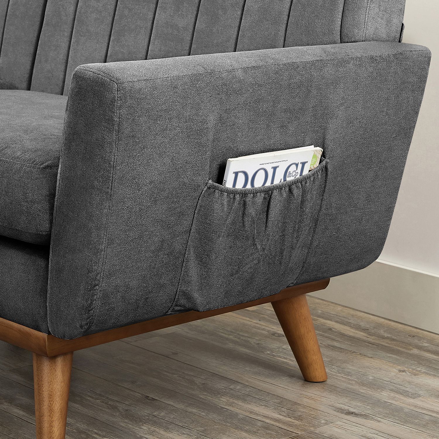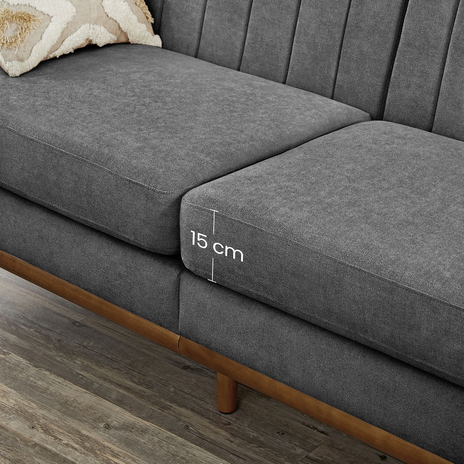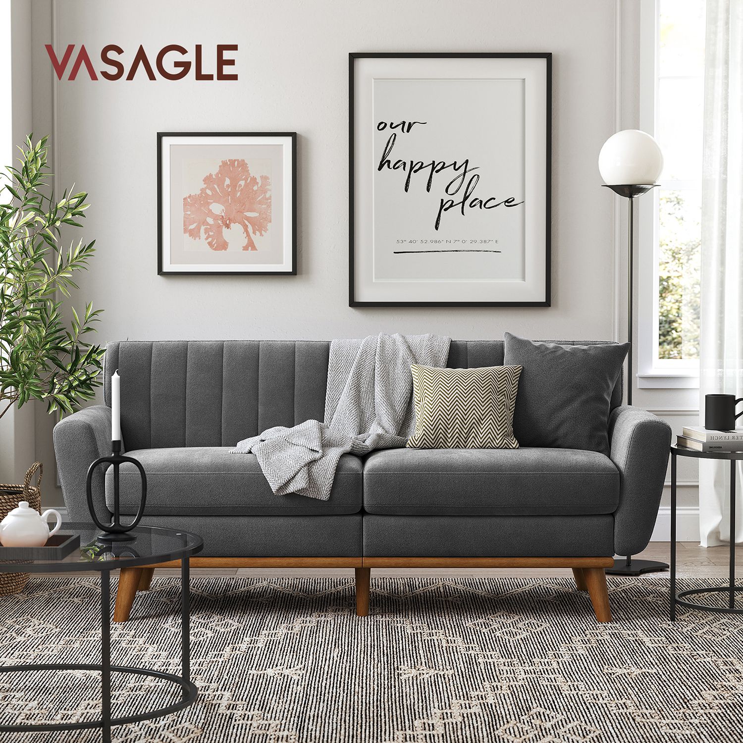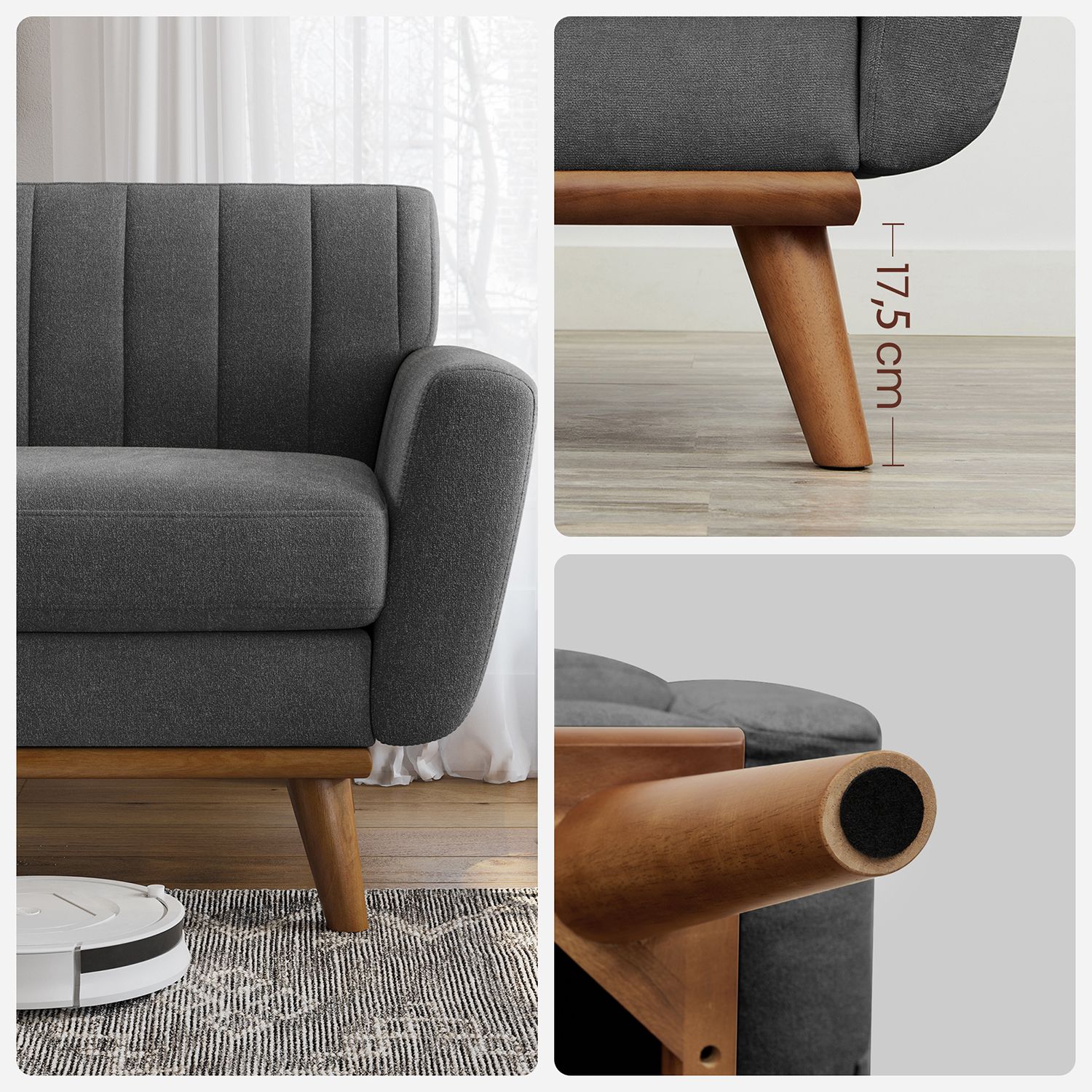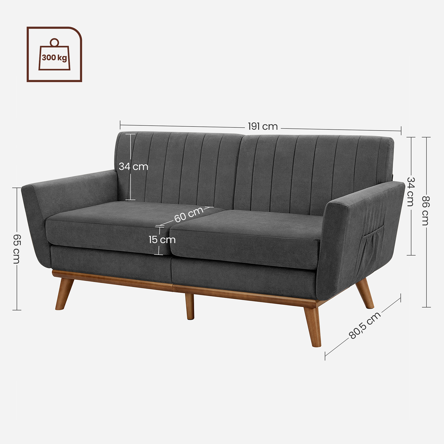 Denne sofa i mid-century modern stil er ikke kun behagelig, men ogs? et rigtigt blikfang og perfekt til alle, der foretr?kker et minimalistisk design. Den st?r p? et understel af massivt tr? med koniske ben og er betrukket med slidst?rkt polyesterstof, s? den kan holde i mange ?r.Komforten er helt sikkert taget i betragtning: Det ultratykke s?dehynde, det bl?de betr?k og den gener?se s?dedybde p? 60 cm giver dig masser af hygge. Du kan placere denne smarte sofa i din lejlighed, i hjemmekontoret eller p? kontoret. Produktdetaljer: – Farve: Gr? – Materiale: Polyesterstof, skumpolstring, krydsfiner, gummitr? – St?rrelse: 191 x 80,5 x 86 cm (L x B x H) – Siddedybde: 60 cm – Rygl?nsh?jde: 34 cm – Arml?nsh?jde (fra gulvet): 65 cm – V?gt: 44 kg – Maks. samlet statisk belastning: 300 kg Leveringsomfang:- 1 x sofa – 1 x tilbeh?rspakke – 1 x vejledning VASAGLE Bem?rkninger: – Dette produkt leveres i 2 pakker. Hvis du kun modtager 1 pakke, skal du vente med at samle sofaen, indtil du har modtaget den anden pakke. Saml sofaen, s? snart begge pakker er ankommet. – S?dehynden leveres i en vakuumpakke. Efter udpakning skal du l?gge det i solen p? et godt ventileret sted og banke det, s? det hurtigere genvinder sin oprindelige st?rrelse.