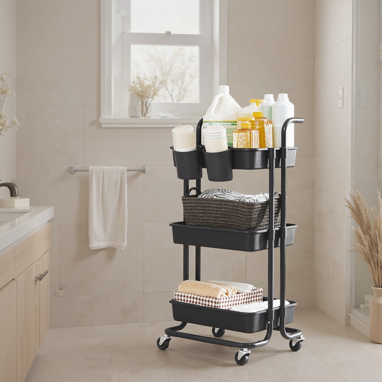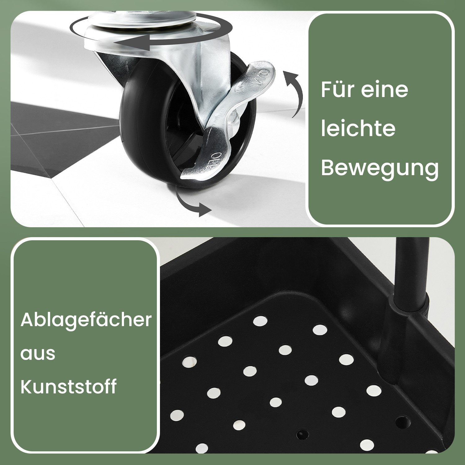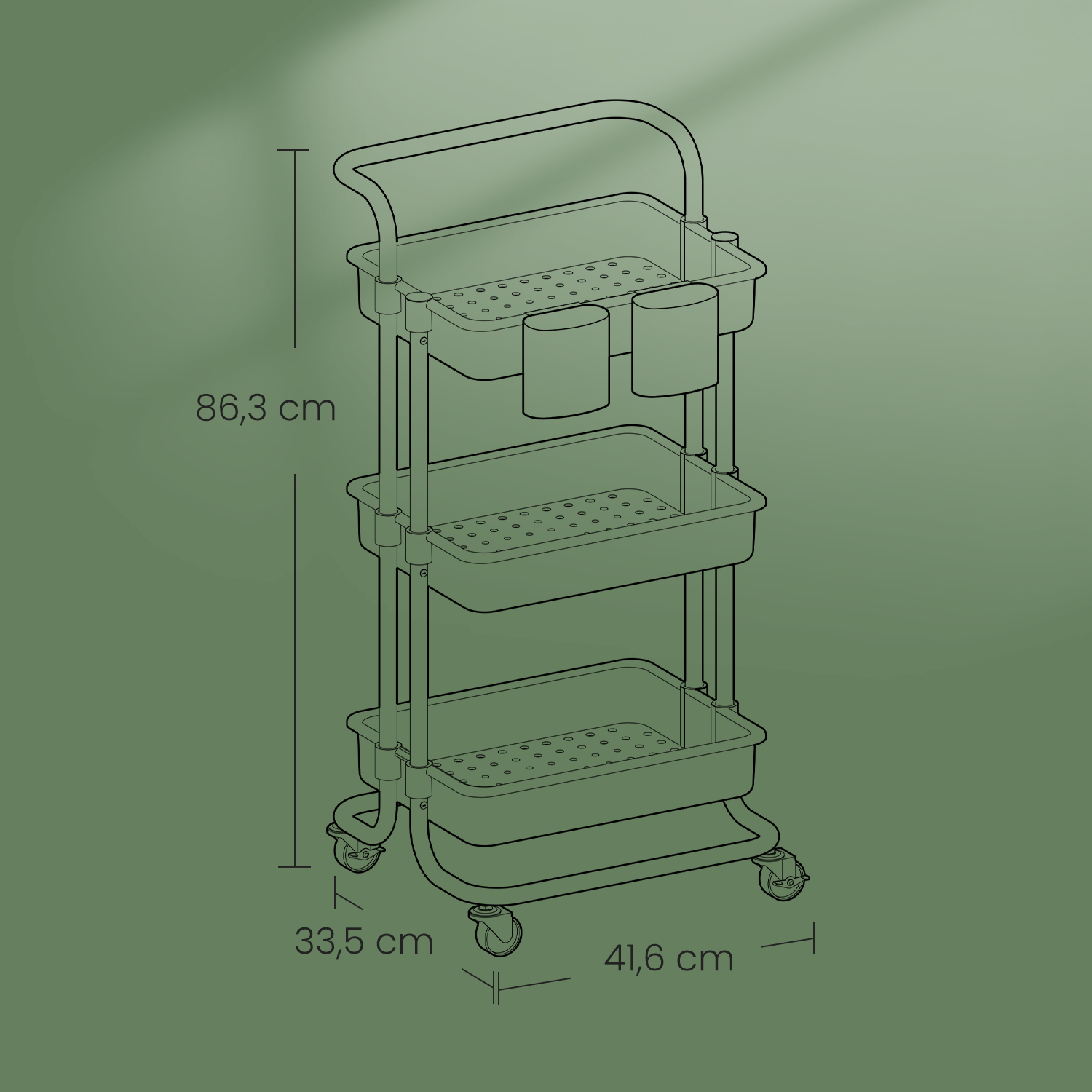 Robust st?lstel, 3 hylder af plast og 4 hjul i h?j kvalitet (2 af dem kan l?ses) ? rul denne hylde fra SONGMICS hen til det sted, hvor du har brug for mere opbevaringsplads. I vaskerummet: Skub denne hylde ind i vaskerummet for at opbevare vaskemiddel, skyllemiddel, reng?ringsmidler osv. p? en ordentlig m?de. I morgen er det vasket?jsdag! Men bare rolig, alle redskaber er allerede i vognen og venter p? at blive brugt! I k?kkenet: Krydderier i det ?verste hylde, frugt i det midterste og gr?ntsager i det nederste ? alt har sin egen plads! Endelig kan du rydde kaoset v?k fra dine arbejdsflader og bruge dem fornuftigt igen. P? kontoret: Du kan opbevare dine kontorartikler i dette reol og skabe orden p? skrivebordet. For at kunne arbejde produktivt er en ordentlig arbejdsplads A og O! Hvis dit kontor tr?nger til lidt gr?nt, kan du placere nogle sm? sukkulenter i det ?verste hylde p? dette reol. T?nk ud af boksen! Der er uendelige anvendelsesmuligheder for denne rullevogn! Rulle f?dselsdagsgaver som en overraskelse? Opbevare b?ger? Eller pr?sentere sm? planter… Hvad ellers? Forskellige genstande passer i denne serveringsvogn. Produktdetaljer:Farve: Sort Materiale: St?l, PP-plast St?rrelse: 41,6 x 33,5 x 86,3 cm (L x B x H) V?gt: 3 kg Maks. statisk belastning pr. niveau: 10 kg Leveringsomfang: 1 x rullebord 2 x lille oph?ngningshylde 1 x tilbeh?rspakke 1 x vejledning (DE, EN, FR, ES, IT)