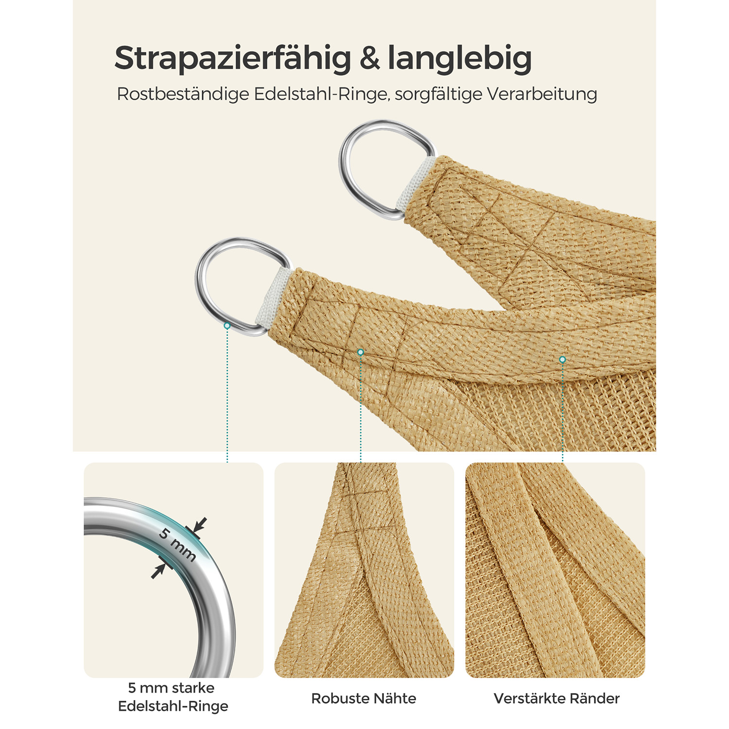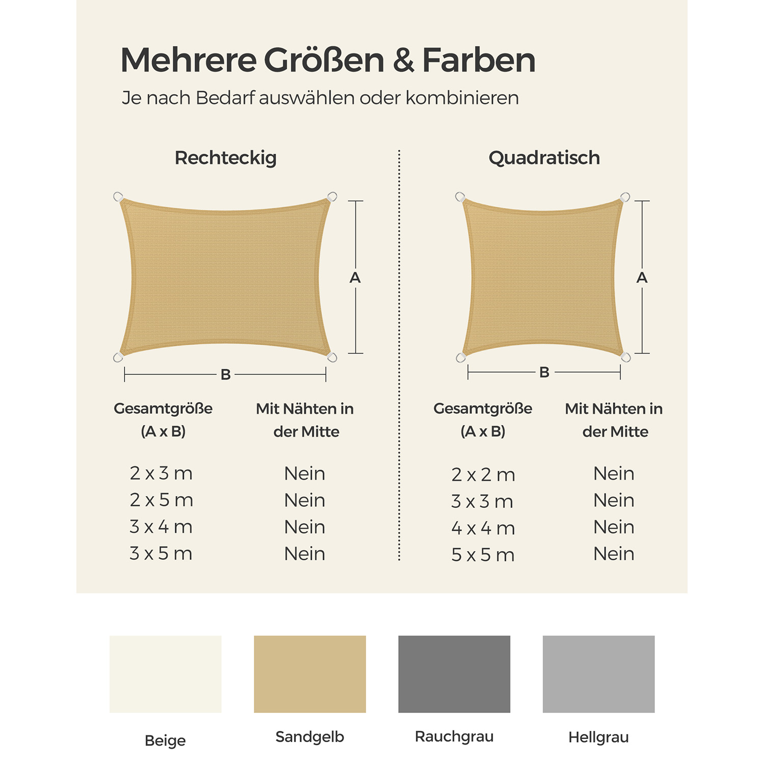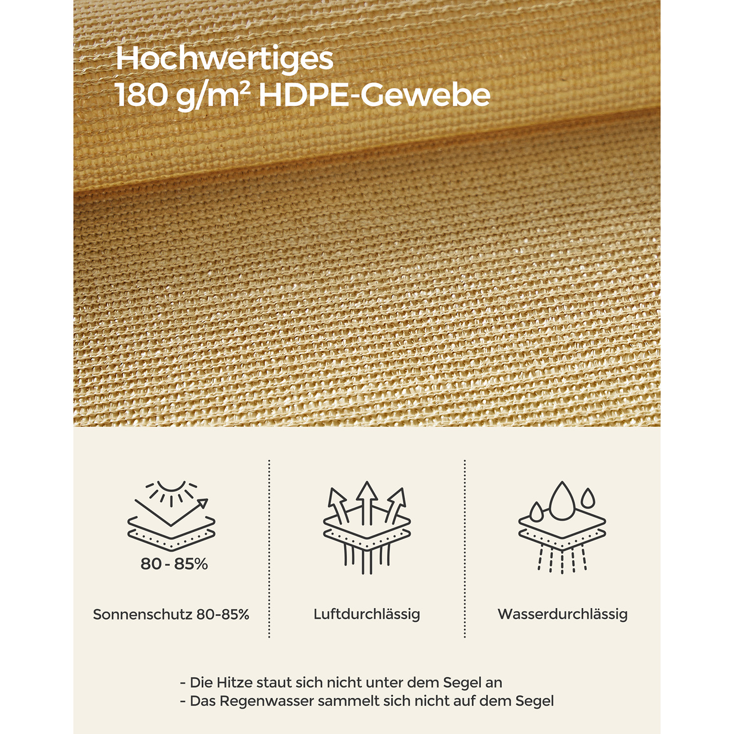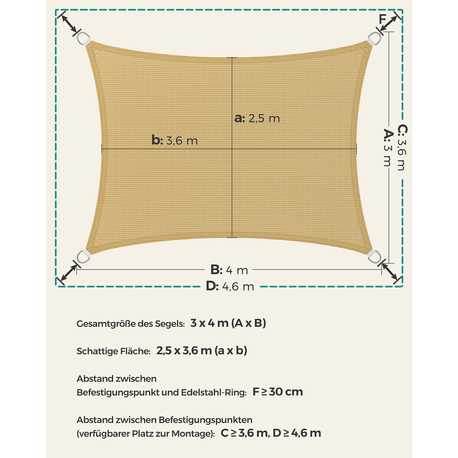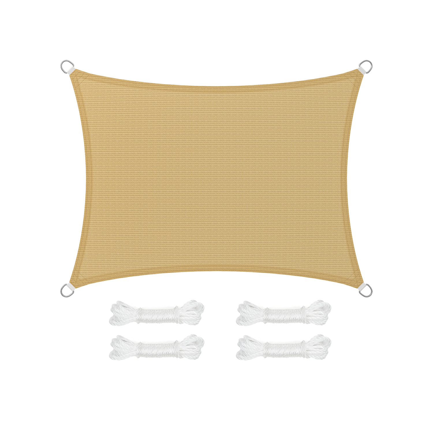Ideel til solbeskyttelse og skygge i haven, p? terrassen og p? altanen. Brug det i haven til bryllupper, fester, grillfester eller udflugter. Brug sejlet til din swimmingpool, gr?spl?ne, have, terrasse, g?rdhave og garage. Du kan ogs? bruge vores solsejl i indk?bscentret, b?rnehaven, forsamlingshuset, byggepladsen, forlystelsesparken, sportspladsen eller legepladsen. Skyggekoefficienten er 80-85 % og kan give en holdbar og robust skygge. Det er UV-resistent og permeabelt, s? der ikke kan ophobes varme under stoffet. Der er en naturlig regulering af temperaturen takket v?re det ?ndbare og permeable materiale. P? denne m?de kan der ikke dannes vandlommer, selv n?r det regner. Den konkave form p? vores skyggesejl g?r det meget stabilt og modstandsdygtigt over for rivning, da sp?ndingen fordeles j?vnt og der ikke kan opst? fald i stoffet. S?mene er forst?rket med et specielt b?nd af h?j kvalitet, hvilket g?r dem mere stabile i kanterne.Specifikationer: – Materiale: HDPE – Materialev?gt: 180 g/m? – Produktm?l: 3 x 4 m – V?gt med emballage: 2,425 kg Indhold i pakken: – 1 x Skyggesejl – 4 x Fastg?relsessnor For at du kan have gl?de af dit skyggesejl i lang tid, skal du v?re opm?rksom p? f?lgende:- Den optimale fastg?relse opn?s med en h?ldning p? 20? for at f? en let h?ldning.- Fjern solsejlet i tilf?lde af st?rk vind, storm og om vinteren.- Reng?r sejlet med et mildt reng?ringsmiddel eller vand. B?rst det ikke med en h?rd b?rste.- S?rg for, at forsiden og bagsiden er korrekt placeret, n?r du monterer det.