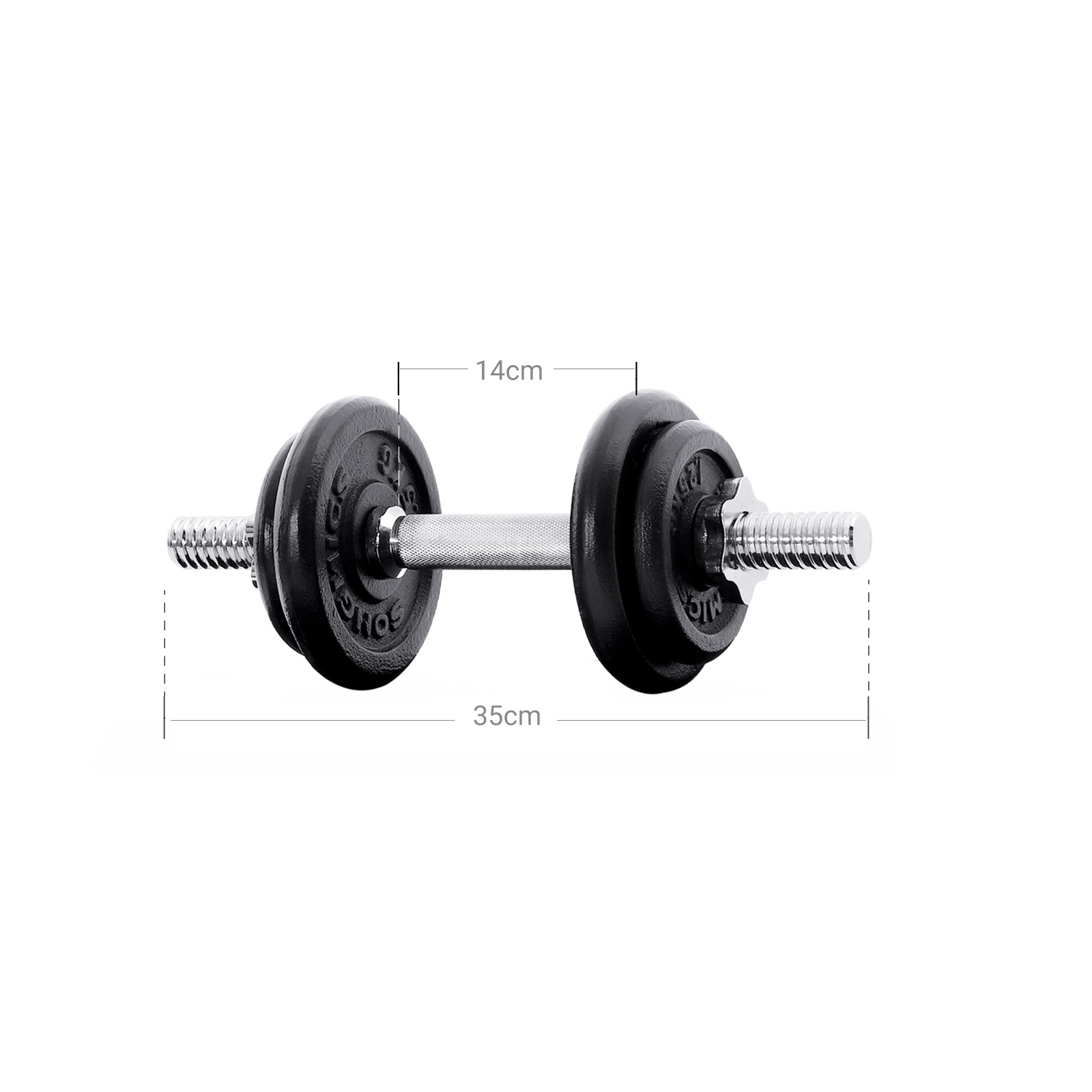 SONGMICS tilbyder altid fitnessudstyr af h?j kvalitet til dem, der arbejder p? at opn? deres ideelle kropsform. Vores helt nye h?ndv?gtss?t er udviklet til at give dig den optimale tr?ningsoplevelse uden begr?nsninger i tid og plads. Det giver dig mulighed for at: Tilpasse din egen tr?ningsrutine: Forskellige skiver g?r det nemmere for dig at justere v?gtene ved hj?lp af enkle kombinationer afh?ngigt af tr?ningsintensiteten, hvilket sparer plads til ekstra v?gte.Anbefalede frit valgbare kombinationer: 10 kg: 4 x 1,25 kg, 2 x stang, 4 x stjernefastg?relse 15 kg: 4 x 2,5 kg, 2 x stang, 4 x stjernefastg?relse 20 kg: 4 x 2,5 kg, 4 x 1,25 kg, 2 x stang, 4 x stjernefastg?relse 25 kg: 8 x 2,5 kg, 2 x stang, 4 x stjernefastg?relse 30 kg: 8 x 2,5 kg, 4 x 1,25 kg, 2 x stang, 4 x stjernefastg?relse Skift nemt til v?gtstangen: Med den medf?lgende v?gtstangsforbindelse kan du p? et ?jeblik f? en v?gtstang. Den giver dig flere muligheder for at opbygge muskler i forskellige dele af kroppen og dermed opn? en bedre tr?ningsoplevelse.Produktdetaljer:Farve: SortMateriale: Pulverlakerede st?bejernsskiver, galvaniserede jernst?nger, jernstjernebeslagStang: L?ngde ? 35 cm; ? ? 30 mm Gribel?ngde: 14 cm L?ngde p? forbindelsesr?r: 30 cm Leveringsomfang: 8 x 2,5 kg skive 4 x 1,25 kg skive 2 x stang 4 x stjerneformet l?s 1 x forbindelsesr?r 1 x tilbeh?rspakke SONGICs bem?rkninger:F?r brug af h?ndv?gte skal du p?f?re en rustbeskyttende olie p? overfladen. Af sikkerhedsm?ssige ?rsager m? h?ndv?gte ikke opbevares p? h?je steder, hvorfra de kan rulle ned. B?rn m? ikke lege med h?ndv?gte. L?g h?ndv?gte forsigtigt fra dig efter tr?ning for at undg? skader.