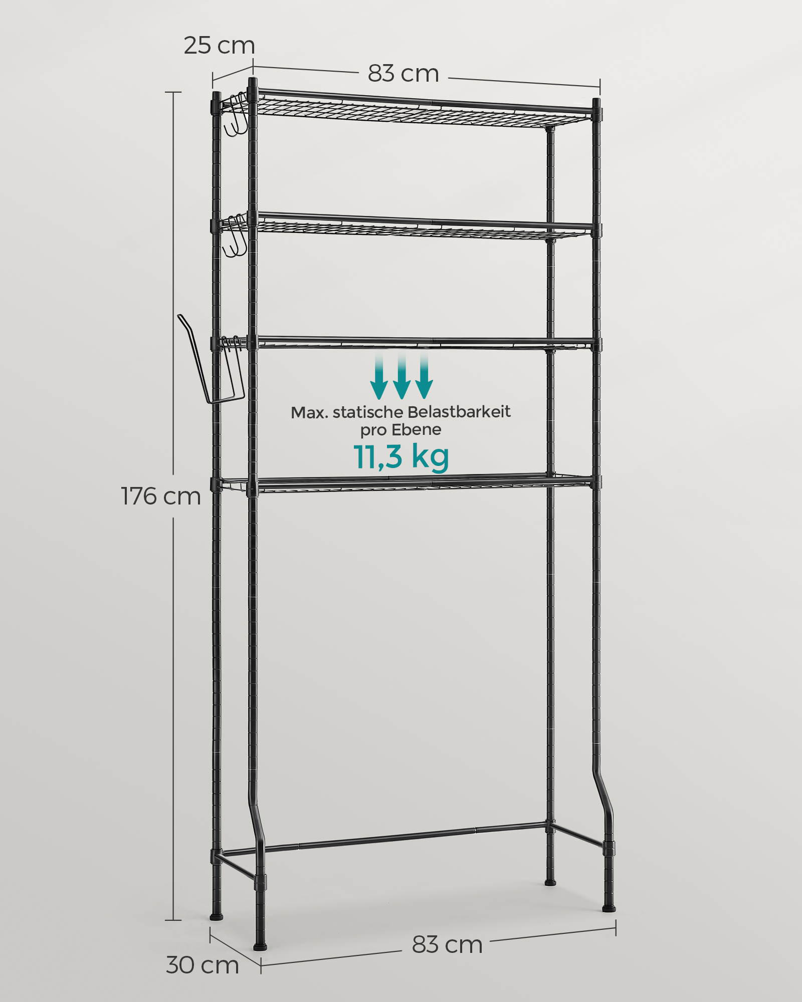 SONGMICS 4-etagers toiletreol, badev?relsesreol, vaskemaskinehylde, justerbare hylder, med kroge, toiletrulleholder, pladsbesparende, 30 x 83 x 176 cm
