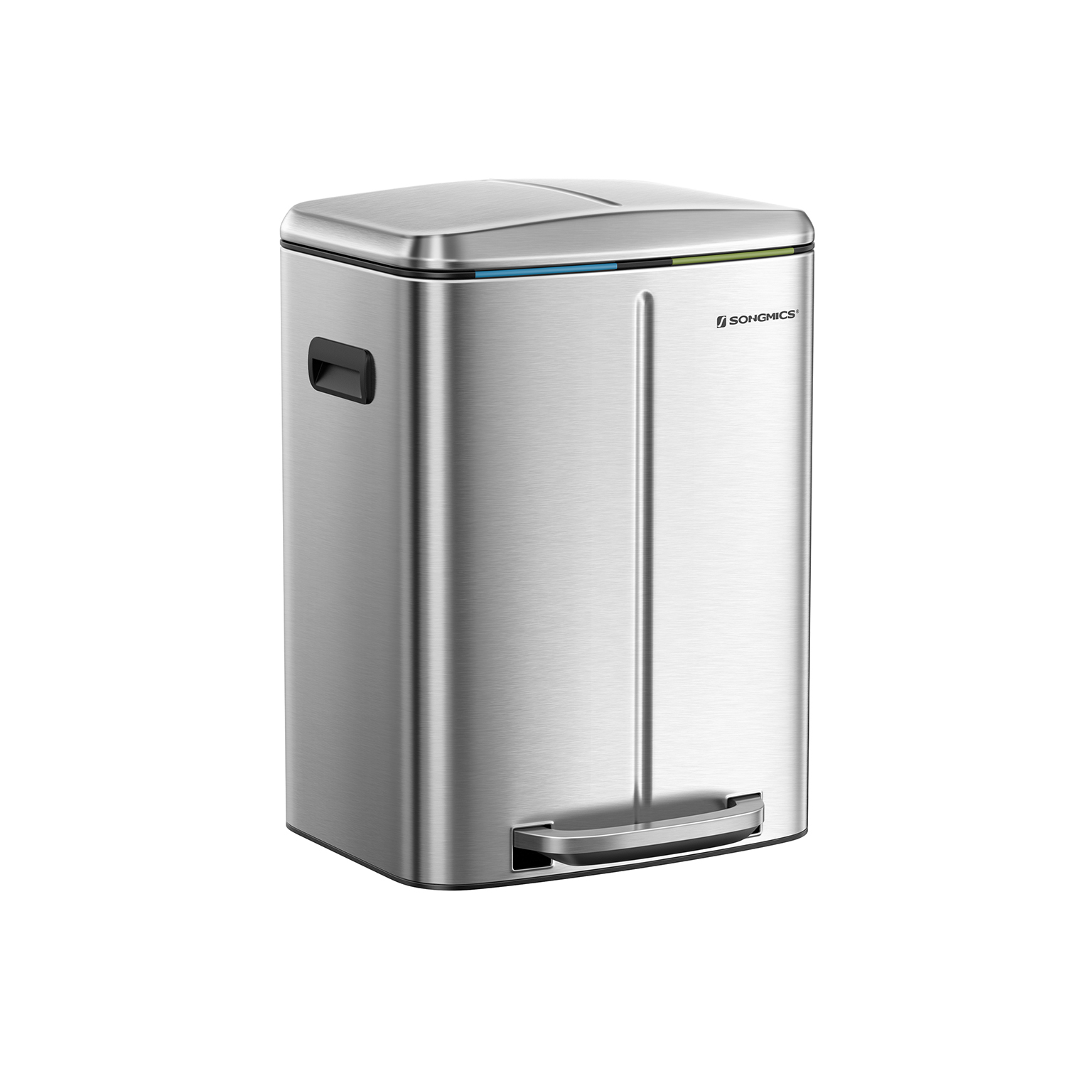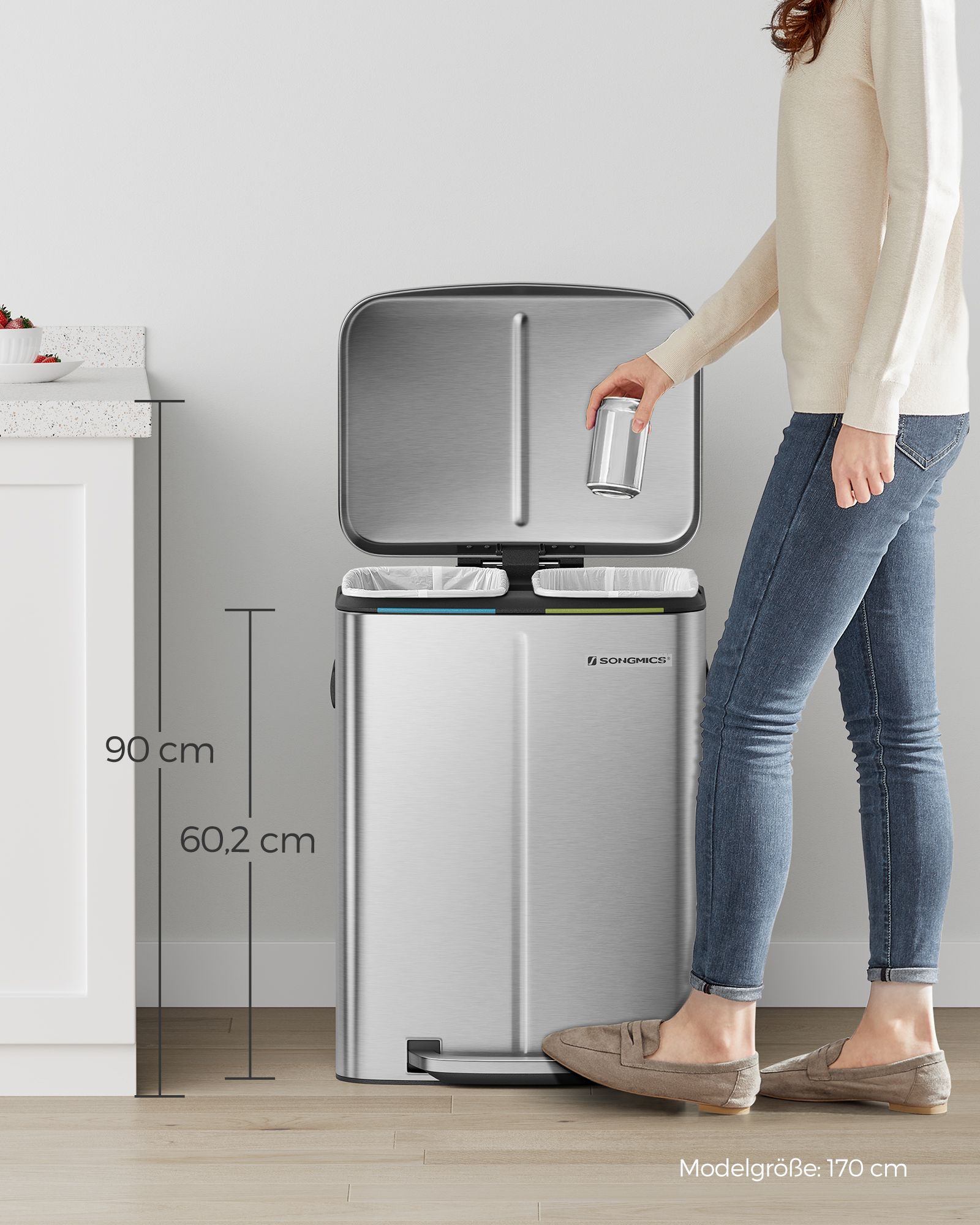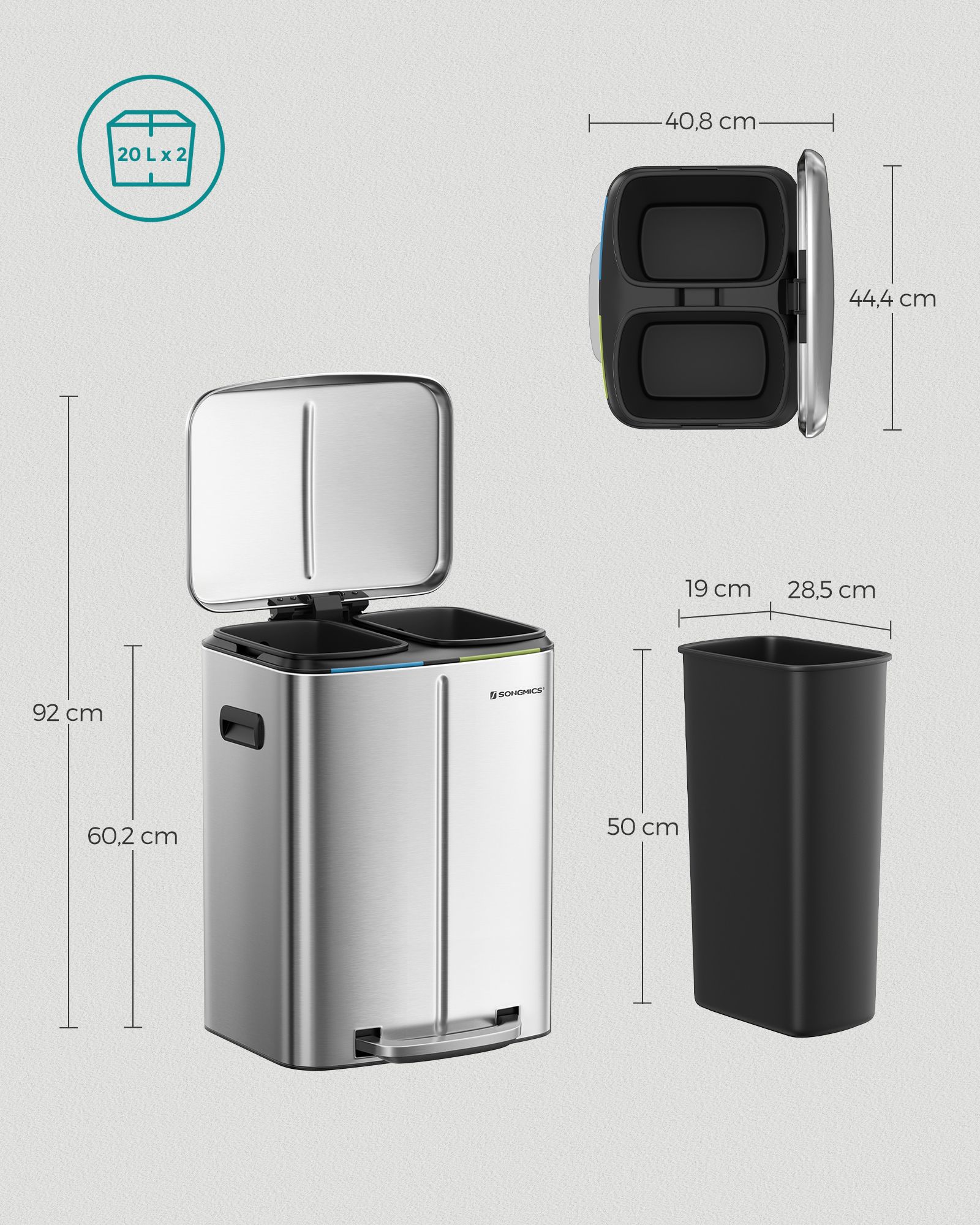 Genbrug kan ogs? v?re nemt: Med denne pedalb?tte med 2 separate rum kan du nemt sortere dit affald, f.eks. restaffald og bioaffald. Alt, du skal g?re, er at tr?de p? pedalen og smide affaldet i den indvendige spand. Du beh?ver ikke engang at r?re skraldespanden med h?nden, hvilket sikrer god hygiejne. En “hvalpe- og b?rnesikker” skraldespand: Roder din hund ofte i skraldespanden? R?kker dine sm? ofte h?nden ned i den ?bne skraldespand? Hvis ja, vil du sikkert gerne s?tte en stopper for det. Her kommer vores pedalsandkasse ind i billedet! F?rst n?r du tr?der p? pedalen, ?bnes l?get. Produktdetaljer: Farve: S?lvfarvet St?rrelse: 44,5 x 36 x 60 cm (L x B x H?St?rrelse p? inderspand: 19 x 28,5 x 50 cm (L x B x H?Samlet h?jde (med ?bent l?g): 92 cmV?gt: 7,1 kgLeveringsomfang:1 x skraldespandSONGMICS Bem?rkninger:T?r produktet af med en bl?d, fugtig klud og brug om n?dvendigt et mildt reng?ringsmiddel.