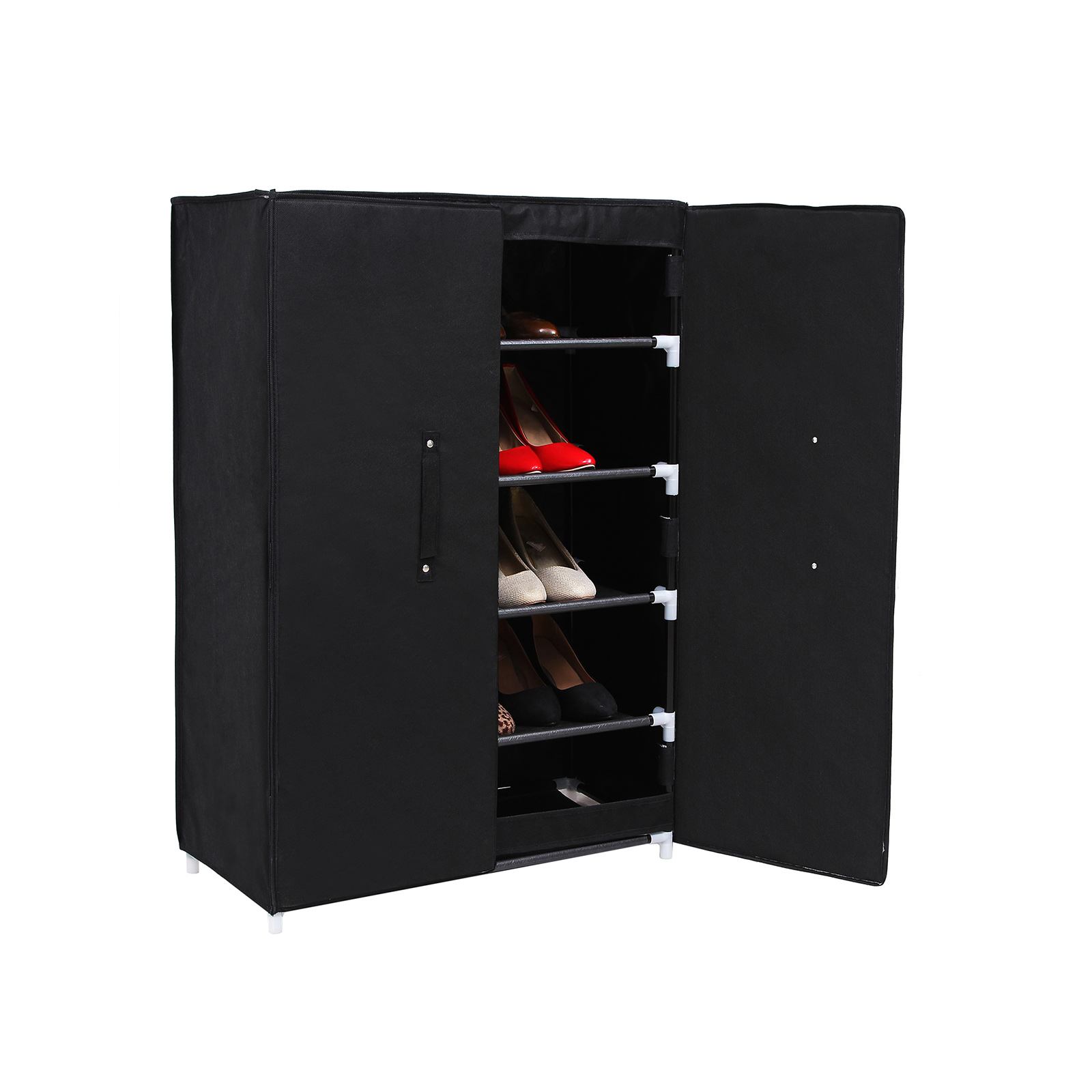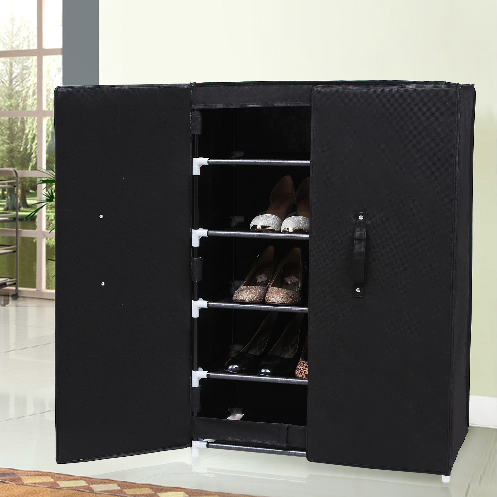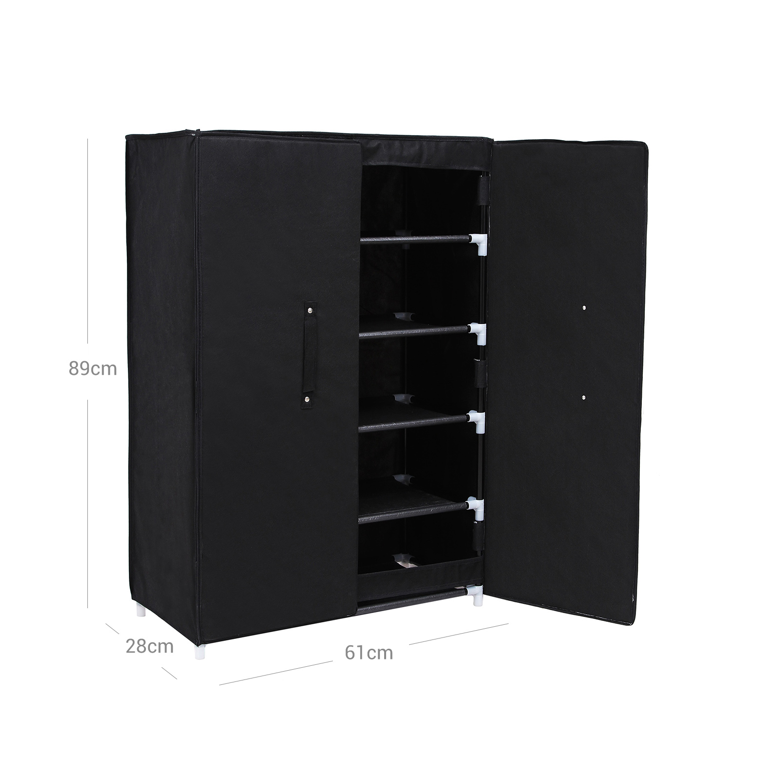 Uanset om det er i garderoben, i entr?en eller i sovev?relset: det smarte skoskab passer ind i alle omgivelser. D?ren med h?ndtag og magneter beskytter dine sko mod st?v og snavs. S? ligger dine sko aldrig mere spredt rundt omkring, men st?r p?nt p? din nye reol. Alt er p?nt og overskueligt. Produktdetaljer: – Farve: sort – M?l: 61 x 89 x 28 cm (B x H x D) – H?jde p? hvert rum: 17 cm – Emballagem?l: 96 x 36 x 6,5 cm – V?gt: 2,3 kg Bem?rkninger: 1. Produktet skal beskyttes mod direkte sollys, da det ellers kan forkorte levetiden. Opbevar det k?ligt og t?rt for at undg? skimmel. 2. Undg? at pakke produktet ud og samle det med magt. 3. Hvis du st?der p? problemer under samlingen, bedes du kontakte vores kundeservice. Vi hj?lper dig gerne med at l?se problemerne eller tilbyder dig gratis reservedele. 4. Hvis du vil opbevare st?vler, ankelst?vler, snest?vler eller klodsede sko i skabet, skal du enten l?gge dem ned eller blot udelade en eller to hylder ved samlingen, hvilket ikke vil p?virke stabiliteten. 5. Overfladen af fleece-stof kan ikke vaskes med vand. Leveringsomfang: 1 x skoskab med vejledning
