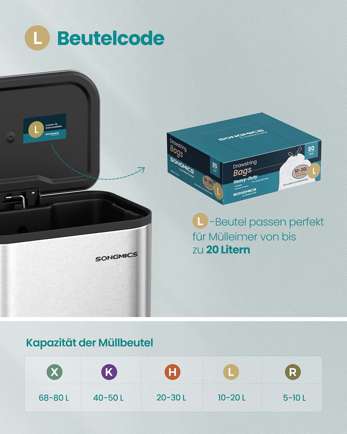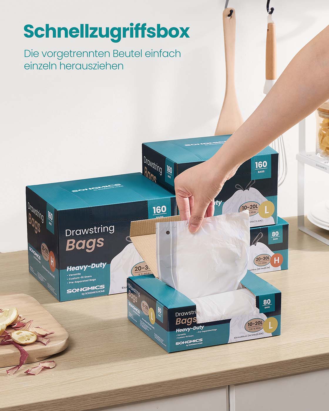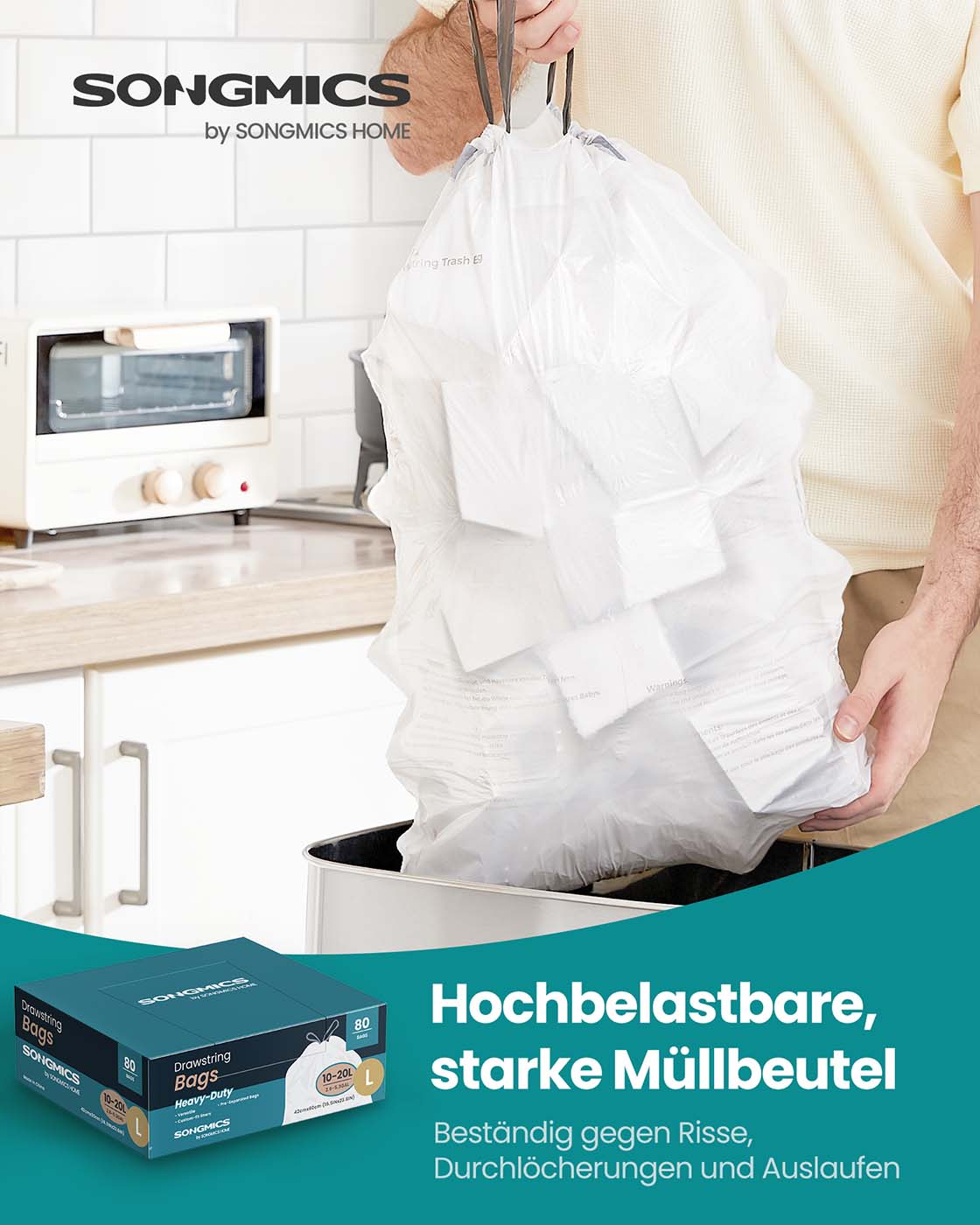 SONGMICS affaldsposer 20 L, affaldss?kke med snor, i alt 80 stk., kode L, h?j belastbarhed, hurtigadgangsboks, cremehvid KRB021A02