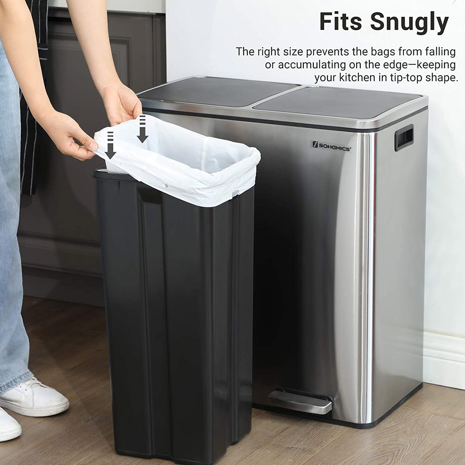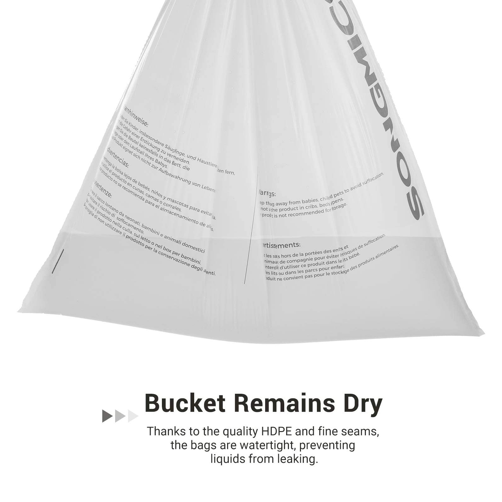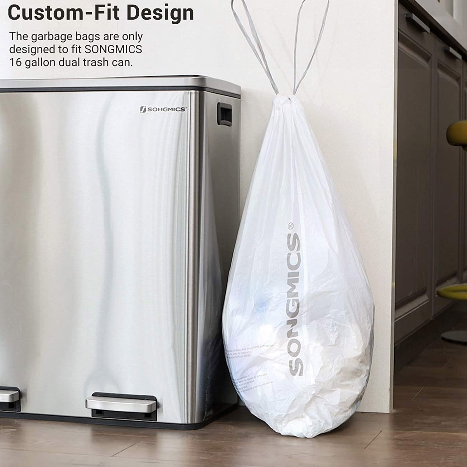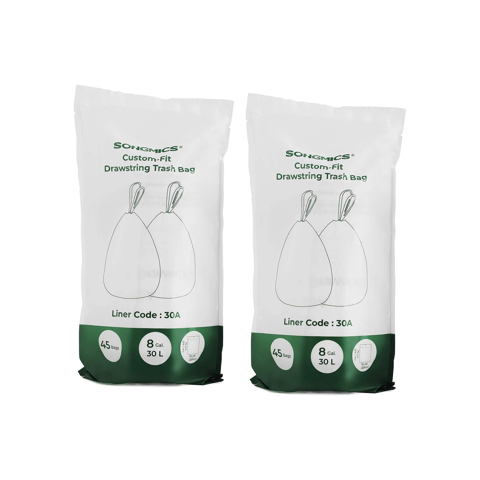 Ikke for store, ikke for sm? ? lige tilpas: Har du sv?rt ved at v?lge det rigtige model blandt det store udvalg af forskellige affaldsposer til din skraldespand? Vi hj?lper dig! Disse affaldsposer er specielt designet til SONGMICS’ 60 L dobbelt skraldespand og 30 L skraldespand. Endelig beh?ver du ikke l?ngere bruge meget tid p? at finde de rigtige affaldsposer! Hvordan g?r disse poser k?kkenarbejdet lettere? De er udviklet til SONGMICS dobbelt skraldespande med 60 liters kapacitet og skraldespande med 30 liters kapacitet og passer perfekt ind i dem. Den optimale st?rrelse forhindrer, at poserne glider eller hindrer lukningen af l?get i omr?det omkring skraldespandens ?verste kant.De praktiske h?ndtag (tr?kb?nd) hj?lper dig med at lukke affaldsposerne og transportere dem uden problemer. B?de poser og h?ndtag er fremstillet af robust, rivfast HDPE-plast. Takket v?re den robuste plast og de velforarbejdede s?mme er disse poser vandt?tte og meget belastbare.Poserne har ingen ubehagelige lugte. Produktdetaljer: Farve: Hvid Materiale: HDPE (h?jdensitetspolyethylen) St?rrelse pr. pose: 52 x 74 cm (L x H) St?rrelse pr. rulle: 8 x 23 cm (? x H)Kapacitet pr. pose: 30 LGewicht samlet: 1,5 kgLeveringsomfang:2 x rulle affaldsposer (90 stk. i alt)SONGMICS Bem?rkninger:Hold produktet v?k fra b?rn og k?ledyr. Fare for kv?lning! Vi frar?der at bruge produktet til opbevaring af f?devarer. Hold produktet v?k fra varmekilder.