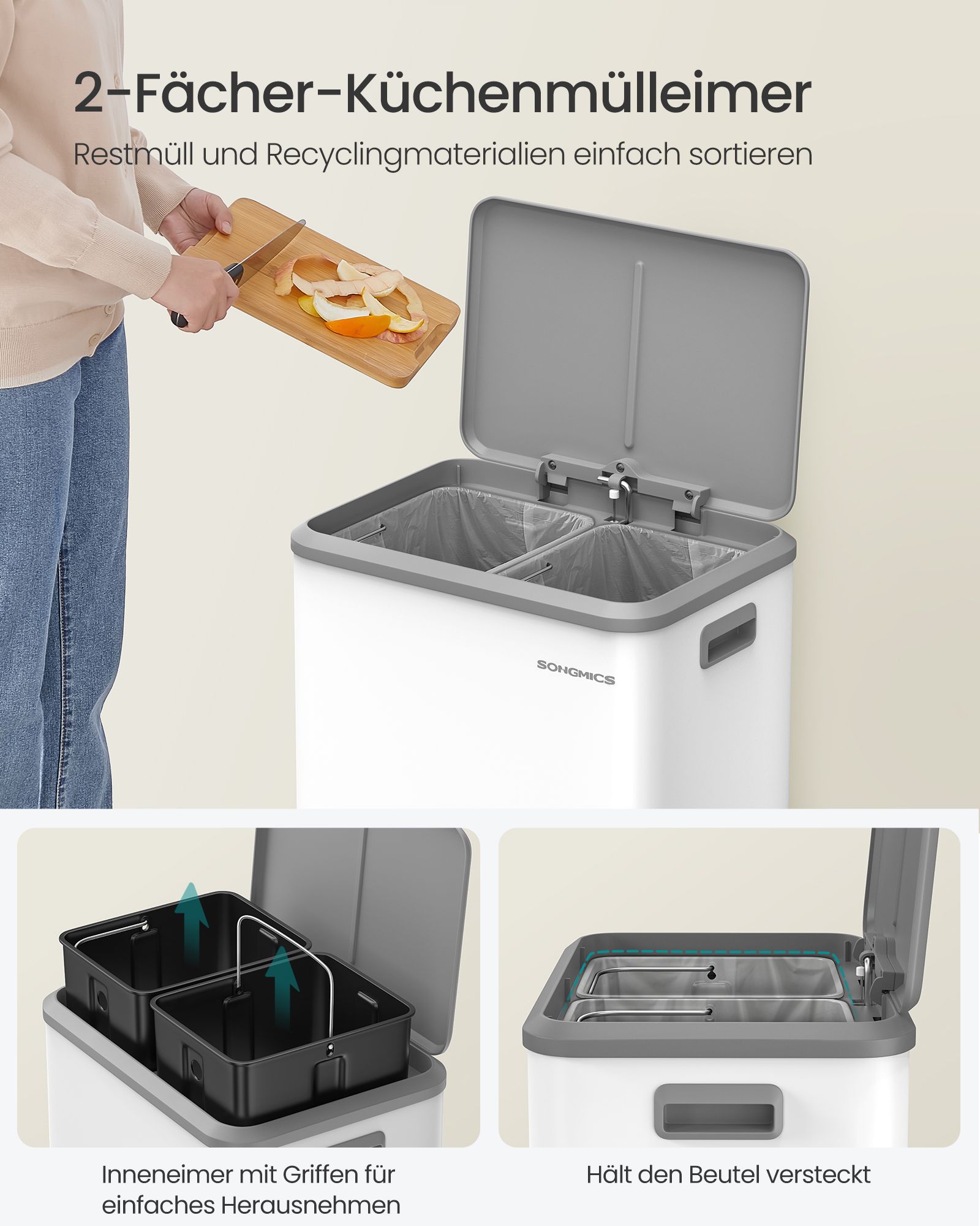 SONGMICS affaldssorteringssystem 2 rum til genbrug og restaffald skyhvid