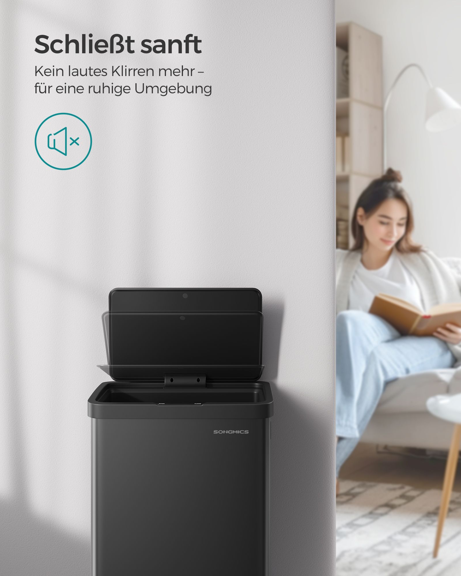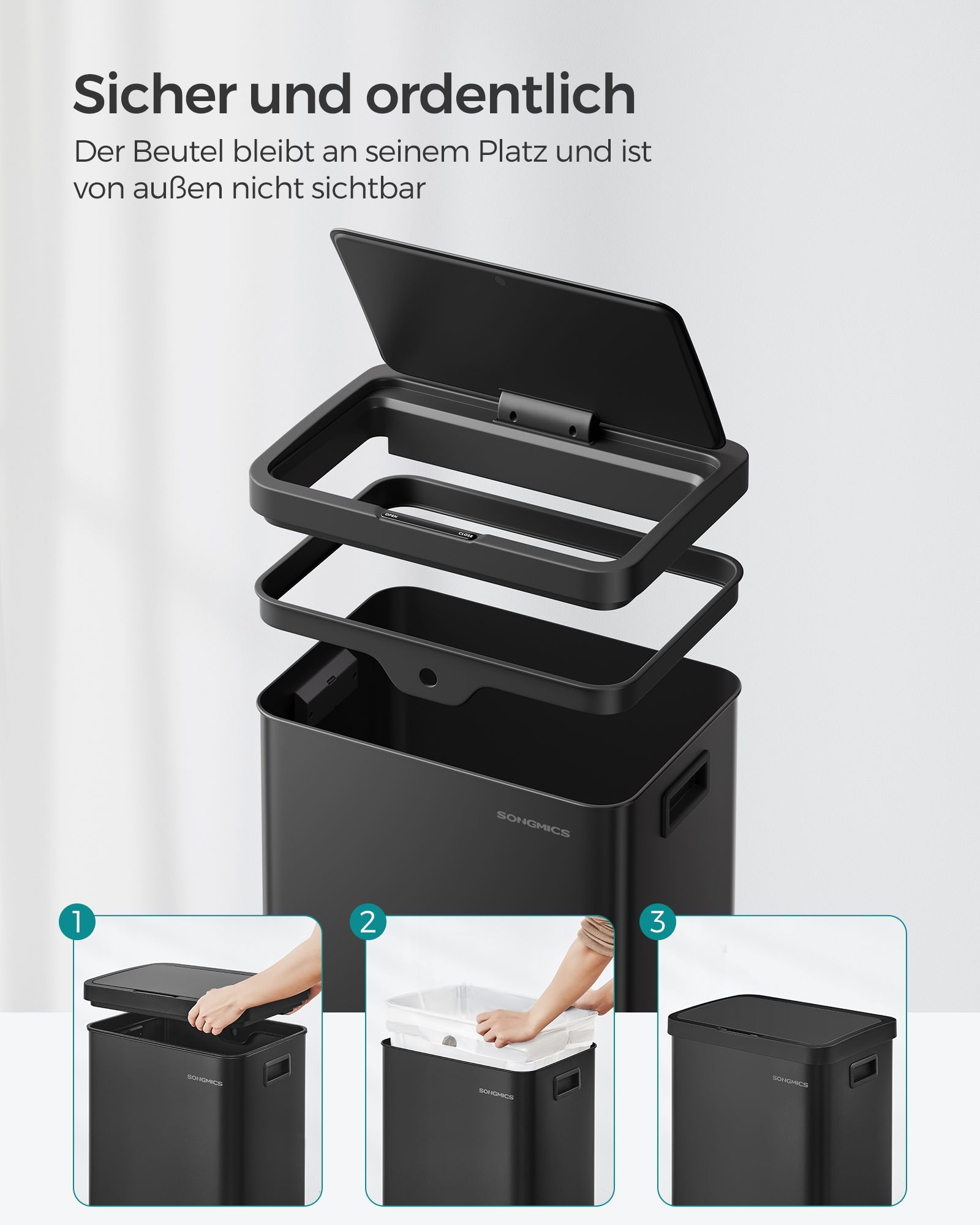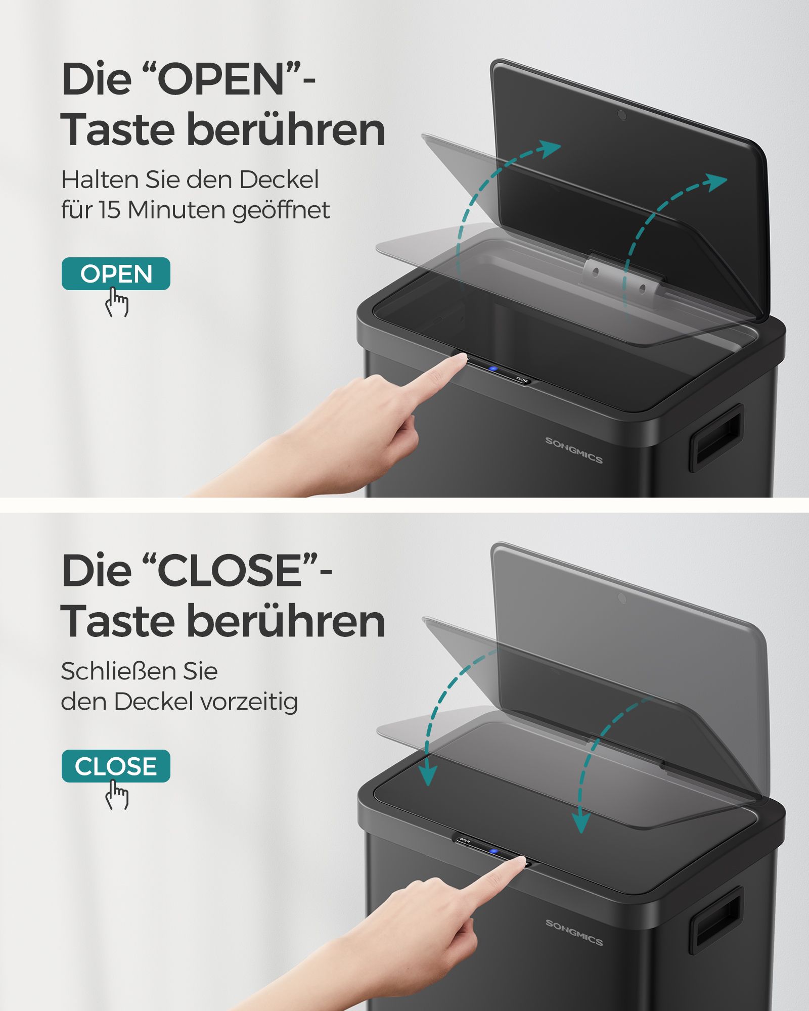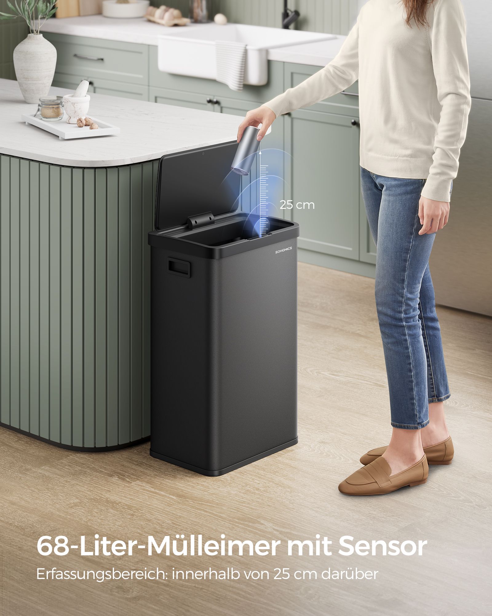 SONGMICS skraldespand med bev?gelsessensor, k?kkenaffaldsspand 68 l, automatisk, softclose-l?g, hold-?ben-funktion, st?l, 15 affaldsposer inkluderet