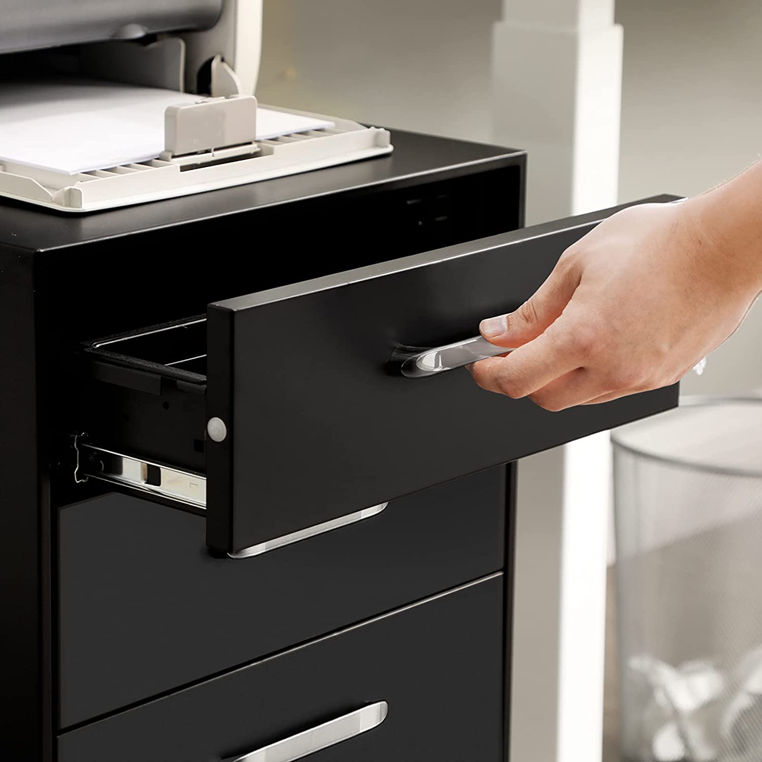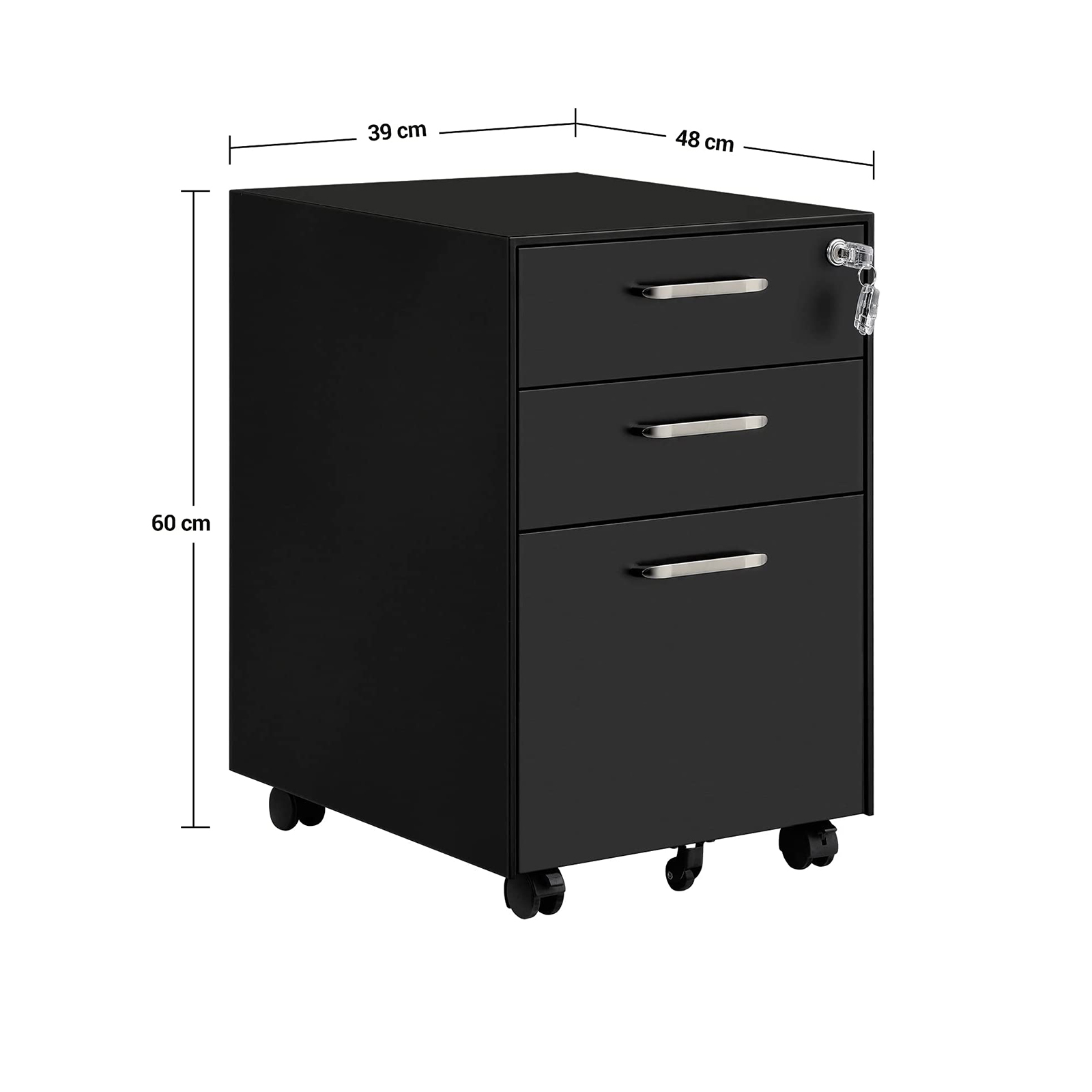 Optimer dit kontorarbejde: Er dit skrivebord d?kket af stakke af dokumenter? Opbevar dem p?nt i denne rullecontainer fra SONGMICS! 3 skuffer, en h?ngemappe og et udtageligt rum til kontorartikler sikrer, at alle dine kontorartikler kan opbevares overskueligt og hurtigt kan findes igen.Stabil, praktisk og fleksibel: Du beh?ver ikke bekymre dig om stabiliteten af dette arkivskab! Hver metallskuffe kan b?re op til 15 kg og er udstyret med premium-udtr?k, der g?r det nemt at tr?kke dem ud og skubbe dem ind. Vil du flytte skabet til et andet rum? Skabets 5 hjul, hvoraf 2 kan l?ses, g?r arbejdet for dig. Uanset om du arbejder p? kontoret eller hjemmefra, kan du med dette arkivskab sige farvel til kaos p? skrivebordet og ?ge din produktivitet. Produktdetaljer: Farve: Sort Materiale: St?l, metalh?ndtag St?rrelse: 39 x 48 x 60 cm (L x B x H) V?gt: 18,5 kg Maks. statisk belastning pr. skuffe: 15 kg Leveringsomfang: 1 x rullecontainer 1 x skuffeorganizer til kontorartikler 1 x h?ngemappe 1 x tilbeh?rspakke 1 x vejledning SONGDen maksimale belastning pr. skuffe er 15 kg. Undlad at fylde skufferne med tungere genstande. B?rn m? ikke klatre op p? produktet eller lege med det for at undg? skader som f?lge af v?ltning.
