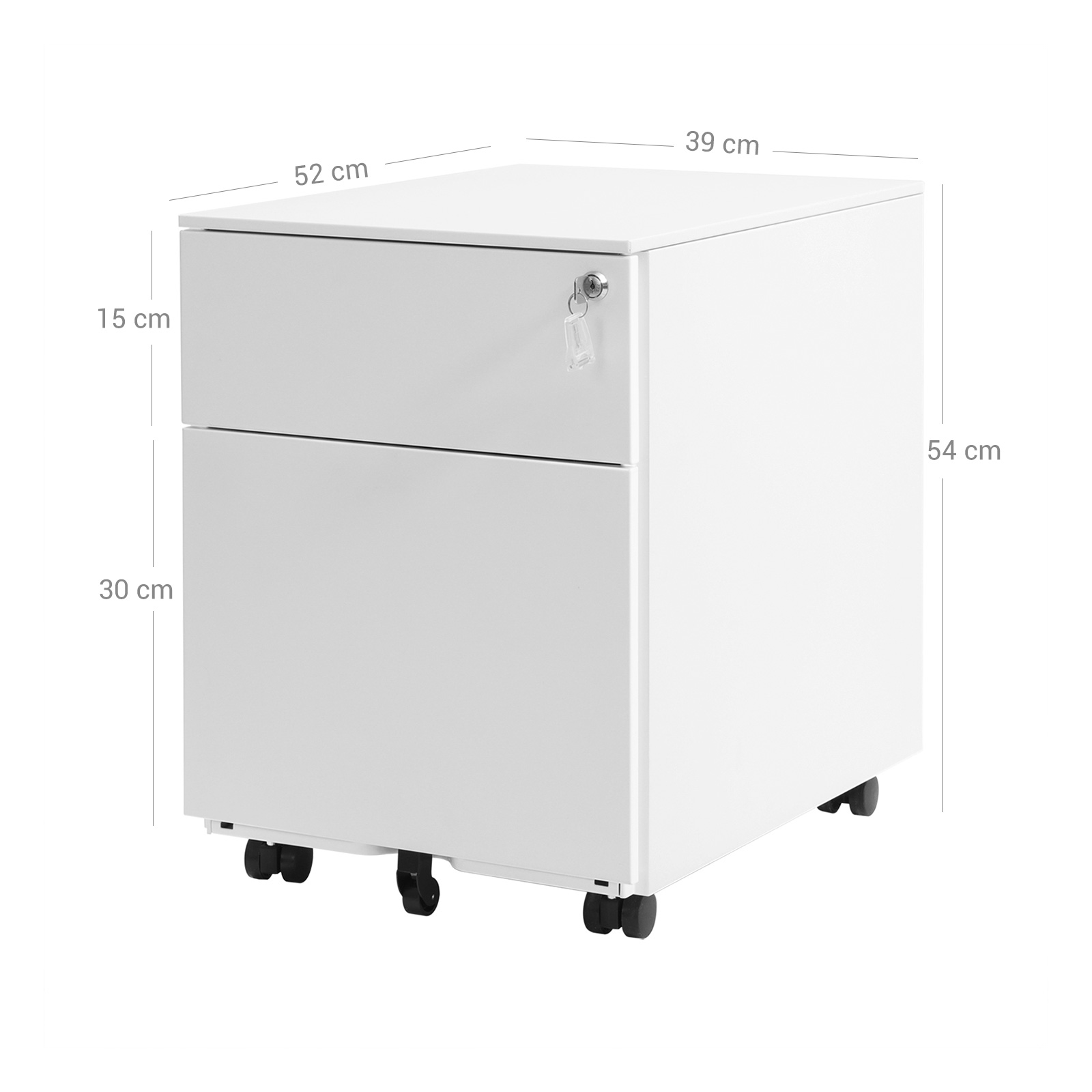 Alle vigtige dokumenter samlet p? ?t stedRullecontaineren har plads til forskellige dokumenter og kontorartikler. I den ?verste skuffe er der en ekstra hylde, der kan bruges til kuglepenne og kontorartikler. S? er alt samlet p? ?t sted. Af de 4 hjul, der kan dreje 360 grader, kan 2 l?ses fast, s? containeren st?r stabilt og sikkert p? plads. Justerbar h?ngemappeskuffe Den nederste skuffe kan bruges som h?ngemappe i DIN A4. Hvis du har st?rre eller mindre dokumenter, f.eks. i Legal Size, F4 eller Letter Size, kan h?ngemappen tilpasses ved hj?lp af skuffeinddelere. Der er monteret en rulle p? den nederste skuffe, s? det er lettere at tr?kke h?ngeregistreringssystemet ud, og s? intet kan b?jes, hvis skuffen st?r ?ben i l?ngere tid. Sikker l?sning og passer perfekt under skrivebordet L?sen, der er udstyret med 2 n?gler, l?ser 2 skuffer samtidigt, s? alle dine dokumenter er sikkert opbevaret i skabskommoden. Med en h?jde p? 54 cm passer rullecontaineren ogs? under almindelige skriveborde og sparer endnu mere plads. SONGMICS Bem?rk: – V?r forsigtig, n?r du monterer rullerne. Produktdetaljer:- Farve: sort (OFC50BK), hvid (OFC50WT) – Materiale: st?l – M?l: 39 x 54 x 52 cm (B x H x D) – V?gt: 15,22 kg Leveringsomfang: – 1 x rullecontainer – 1 x tilbeh?rspose – 1 x vejledning (DE, EN, FR, IT, ES)