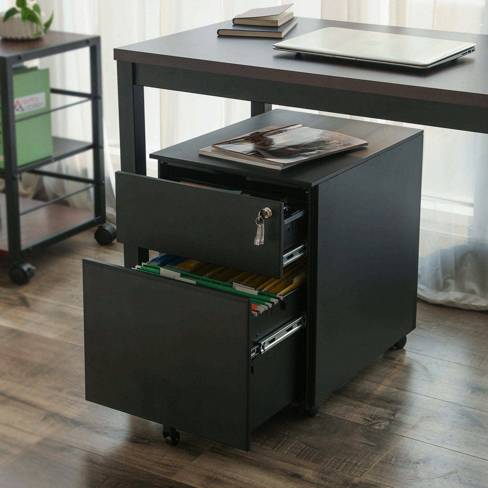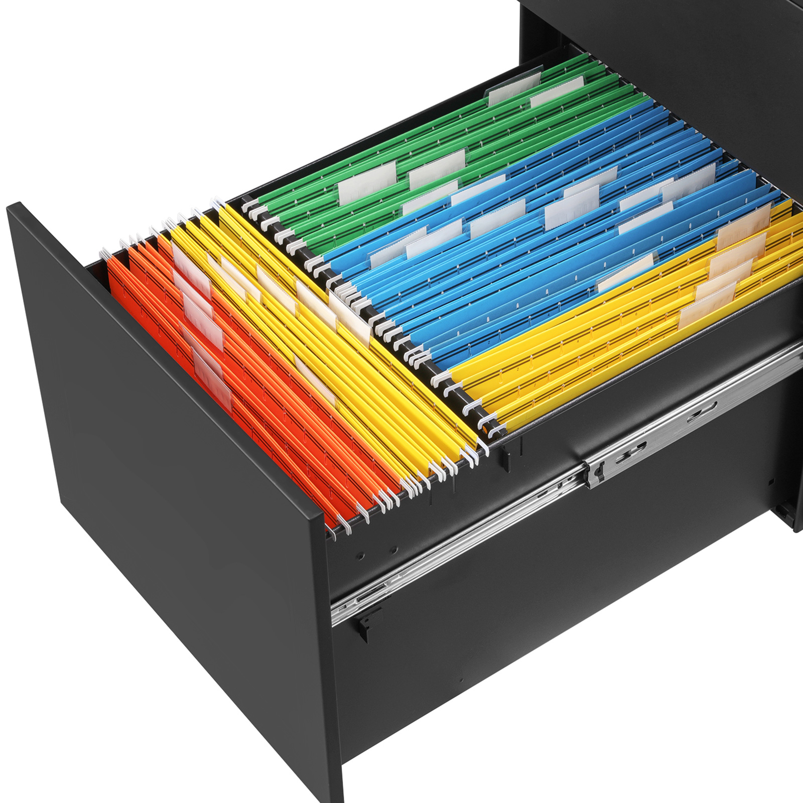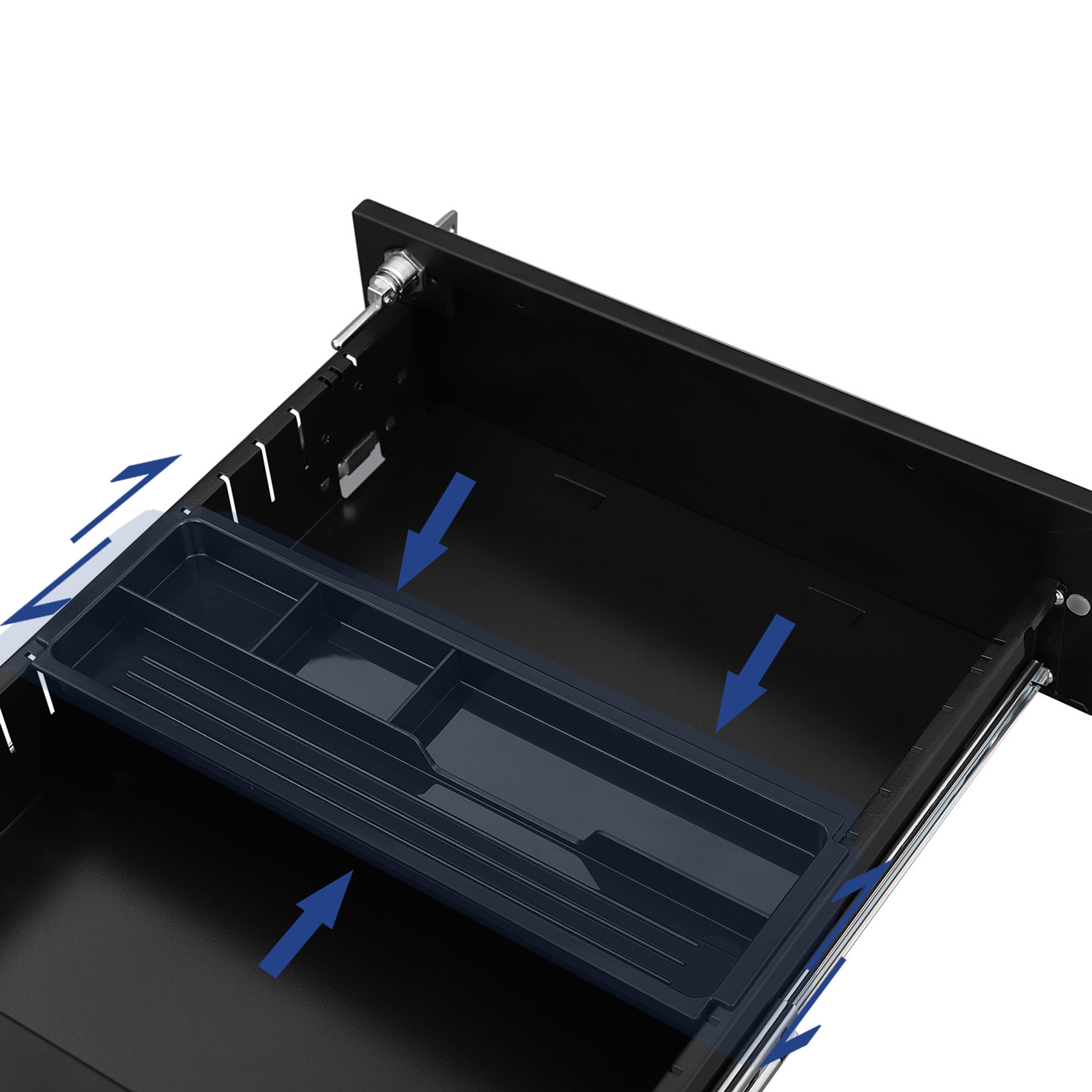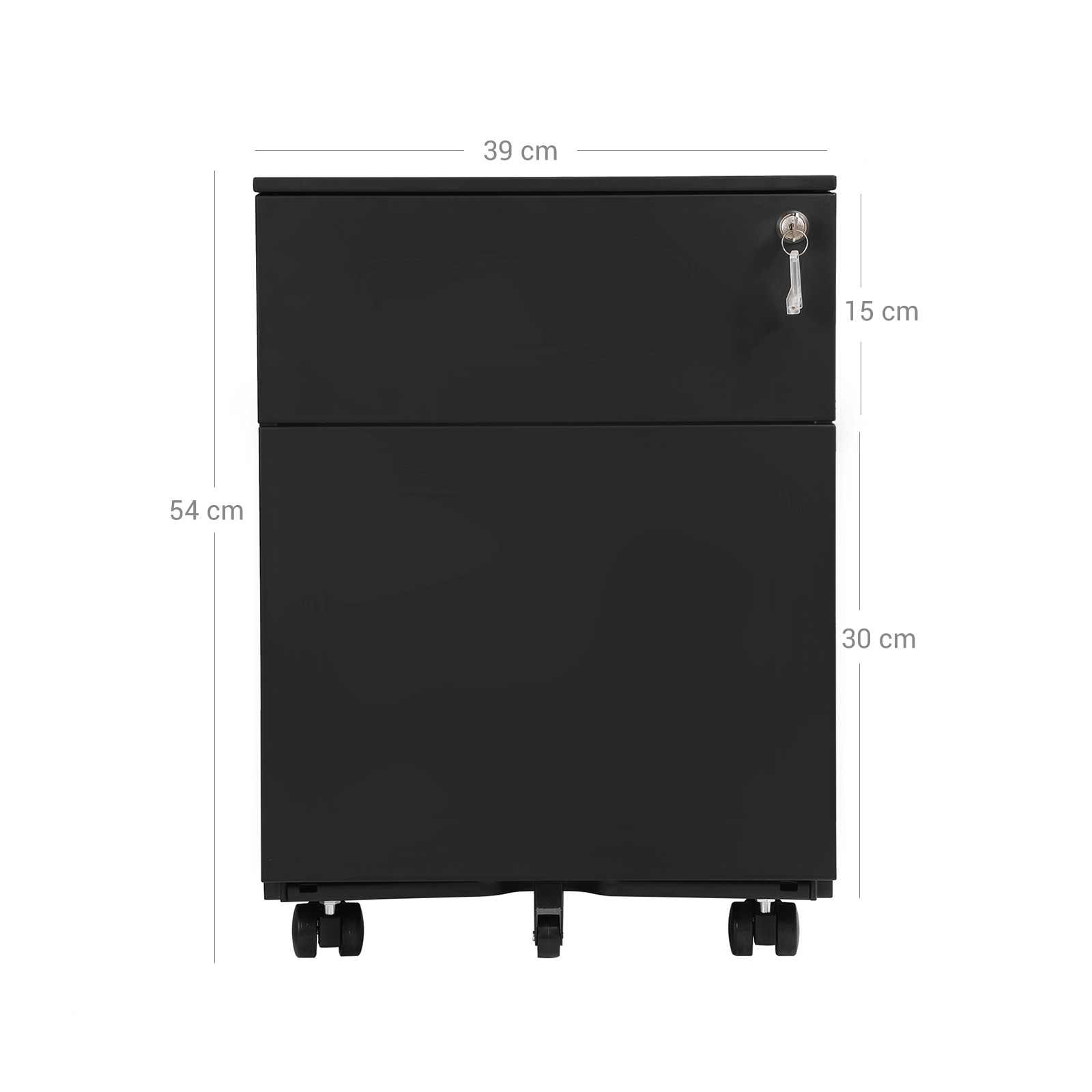 Alle vigtige dokumenter samlet p? ?t stedRullecontaineren har plads til forskellige dokumenter og kontorartikler. I den ?verste skuffe er der en ekstra hylde, der kan bruges til kuglepenne og kontorartikler. S? er alt samlet p? ?t sted. Af de 4 hjul, der kan dreje 360 grader, kan 2 l?ses fast, s? containeren st?r stabilt og sikkert p? plads. Justerbar h?ngemappeskuffe Den nederste skuffe kan bruges som h?ngemappe i DIN A4. Hvis du har st?rre eller mindre dokumenter, f.eks. i Legal Size, F4 eller Letter Size, kan h?ngemappen tilpasses ved hj?lp af skuffeinddelere. Der er monteret en rulle p? den nederste skuffe, s? det er lettere at tr?kke h?ngeregistreringssystemet ud, og s? intet kan b?jes, hvis skuffen st?r ?ben i l?ngere tid. Sikker l?sning og passer perfekt under skrivebordet L?sen, der er udstyret med 2 n?gler, l?ser 2 skuffer samtidigt, s? alle dine dokumenter er sikkert opbevaret i skabskommoden. Med en h?jde p? 54 cm passer rullecontaineren ogs? under almindelige skriveborde og sparer endnu mere plads. SONGMICS Bem?rk: – V?r forsigtig, n?r du monterer rullerne. Produktdetaljer:- Farve: sort (OFC50BK), hvid (OFC50WT) – Materiale: st?l – M?l: 39 x 54 x 52 cm (B x H x D) – V?gt: 15,22 kg Leveringsomfang: – 1 x rullecontainer – 1 x tilbeh?rspose – 1 x vejledning (DE, EN, FR, IT, ES)