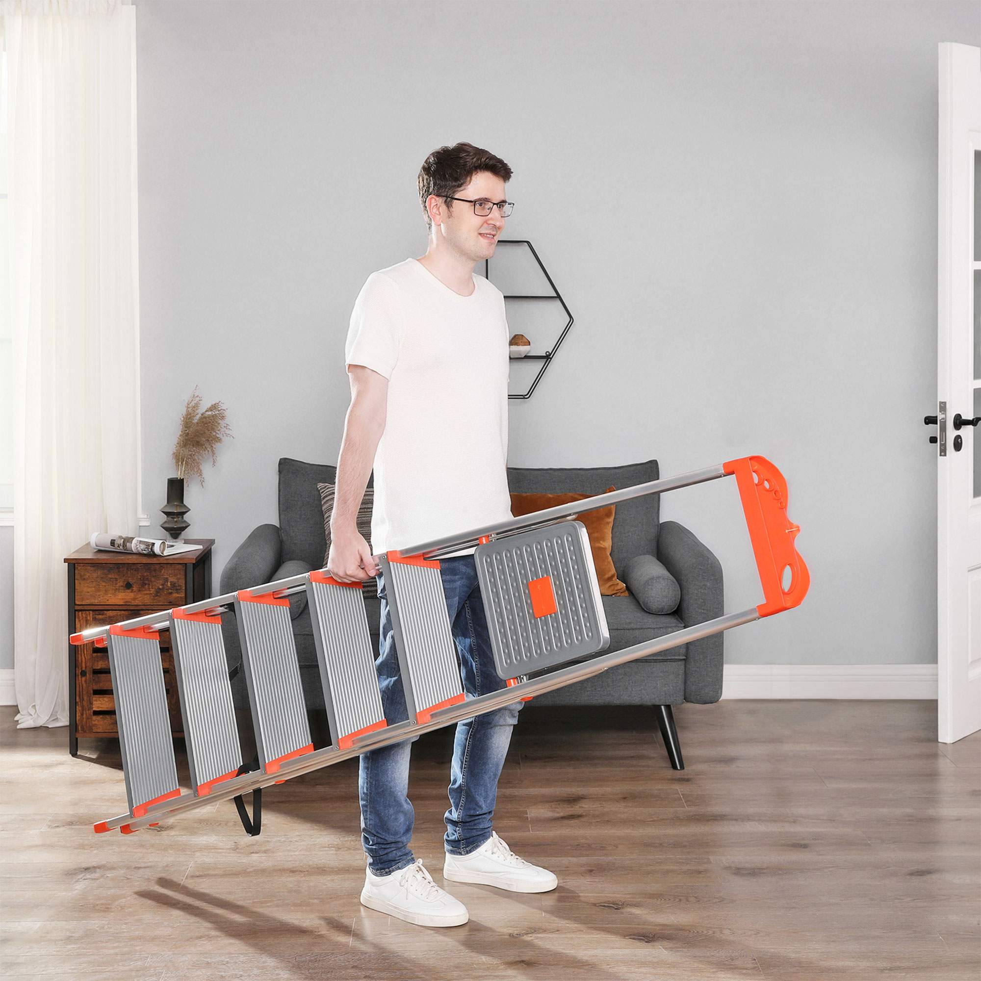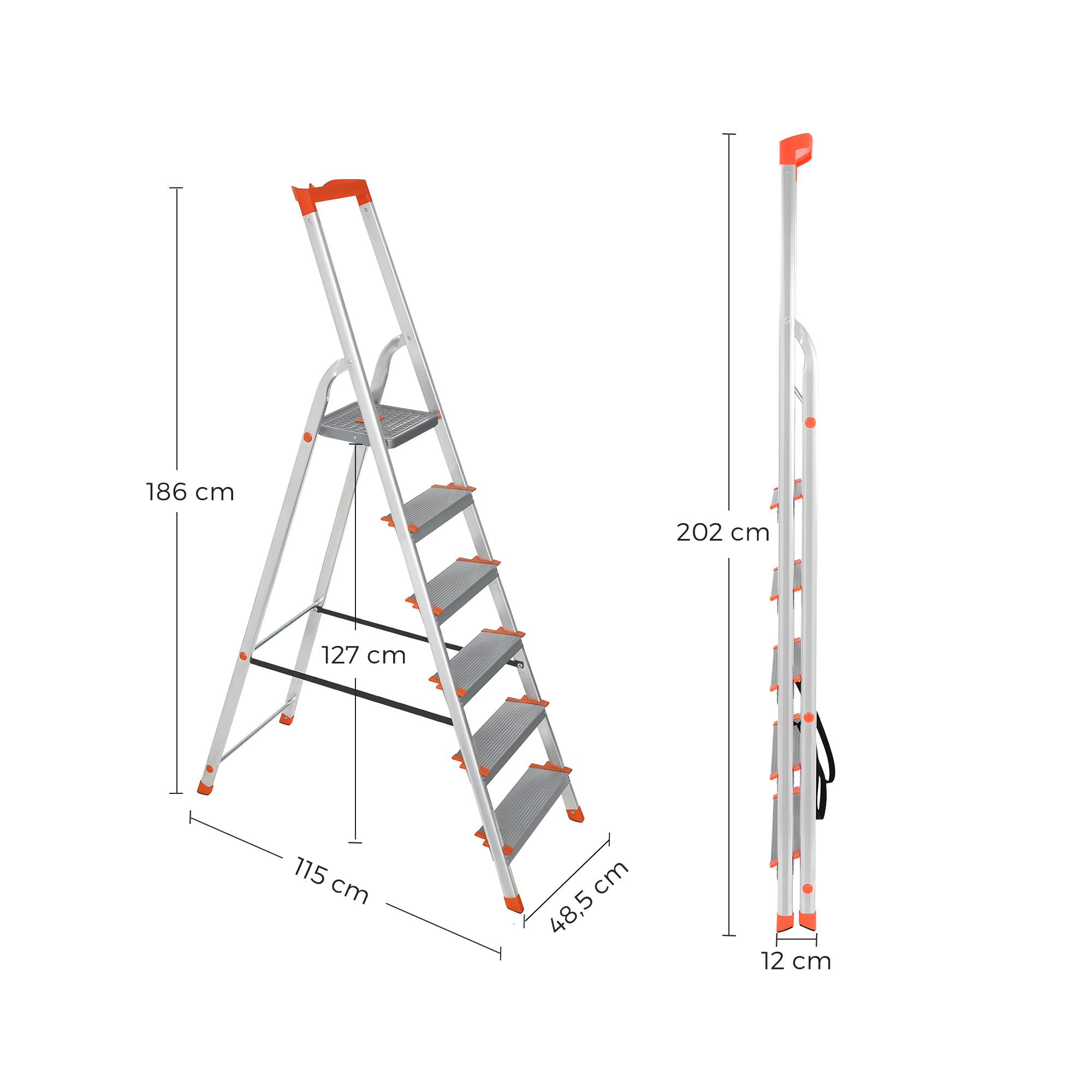 Produktdetaljer: Farve: Gr?-orange Materiale: Aluminium, plast St?rrelse sammenklappet: 48,5 x 12 x 202 cm (L x B x H) St?rrelse udklappet: 48,5 x 115 x 186 cm (L x B x H) V?gt: 6,2 kg Maks. statisk belastning: 150 kg Leveringsomfang: 1 x husholdningsstige 1 x vejledning (DE, EN, FR, ES, IT) SONGMICS Bem?rkninger:S?rg for, at stigen er ubeskadiget, inden du bruger den. Brug ikke stigen, hvis der er olie eller vand p? gulvet. Gravide og personer med skader eller andre fysiske begr?nsninger b?r ikke bruge denne stige.