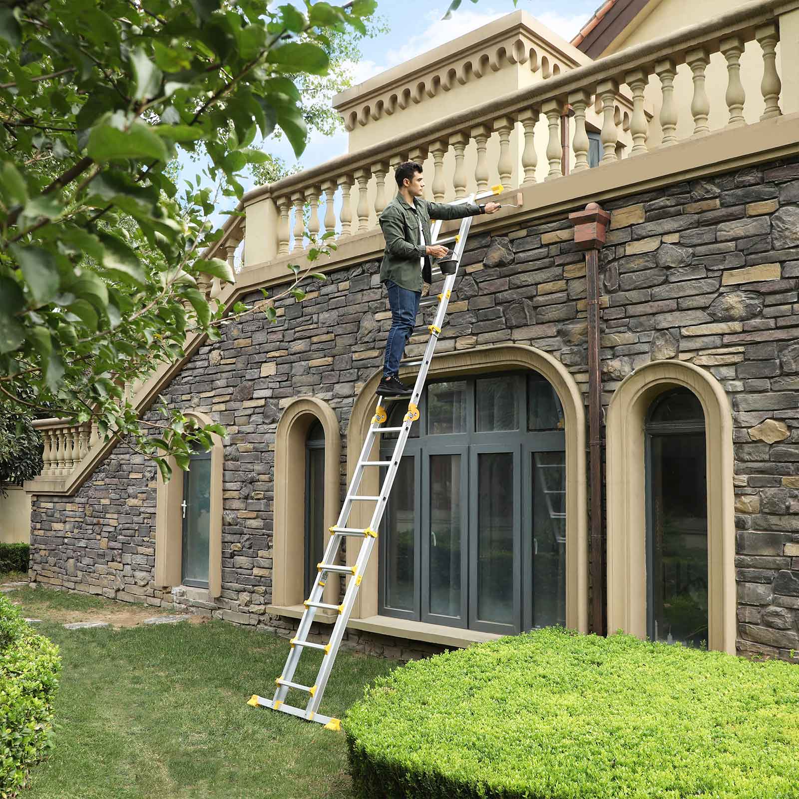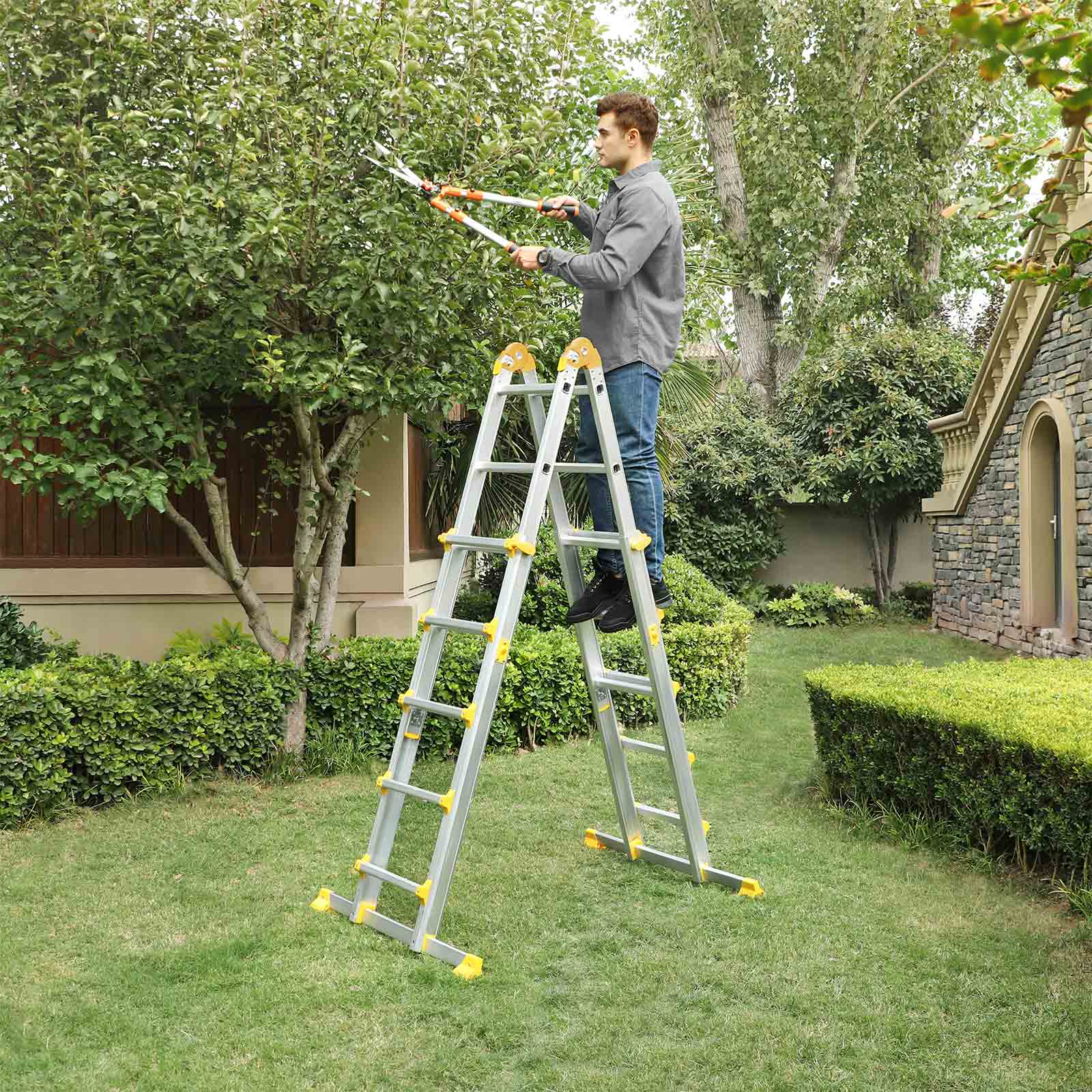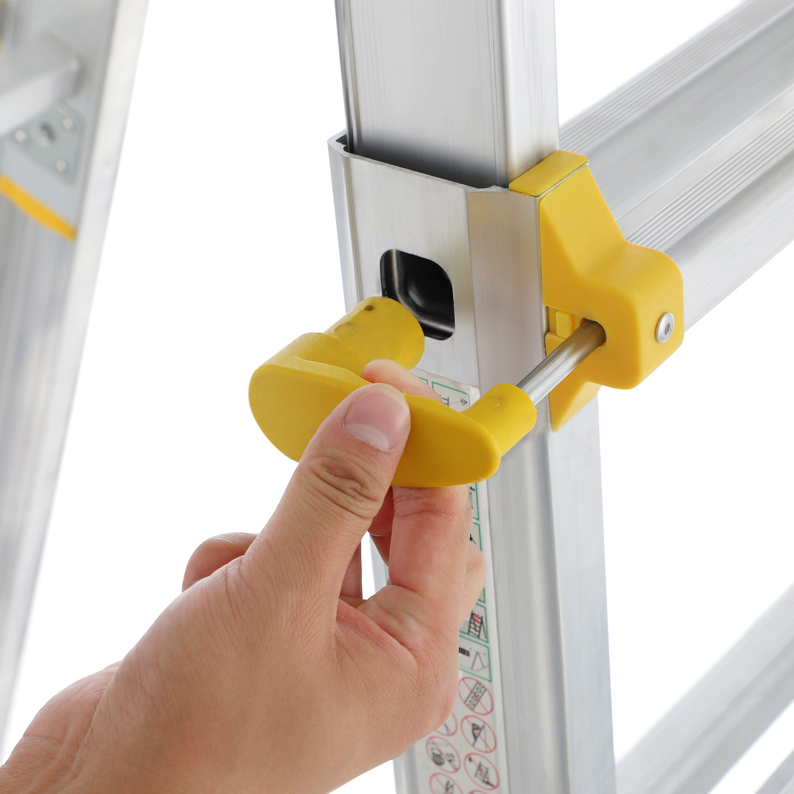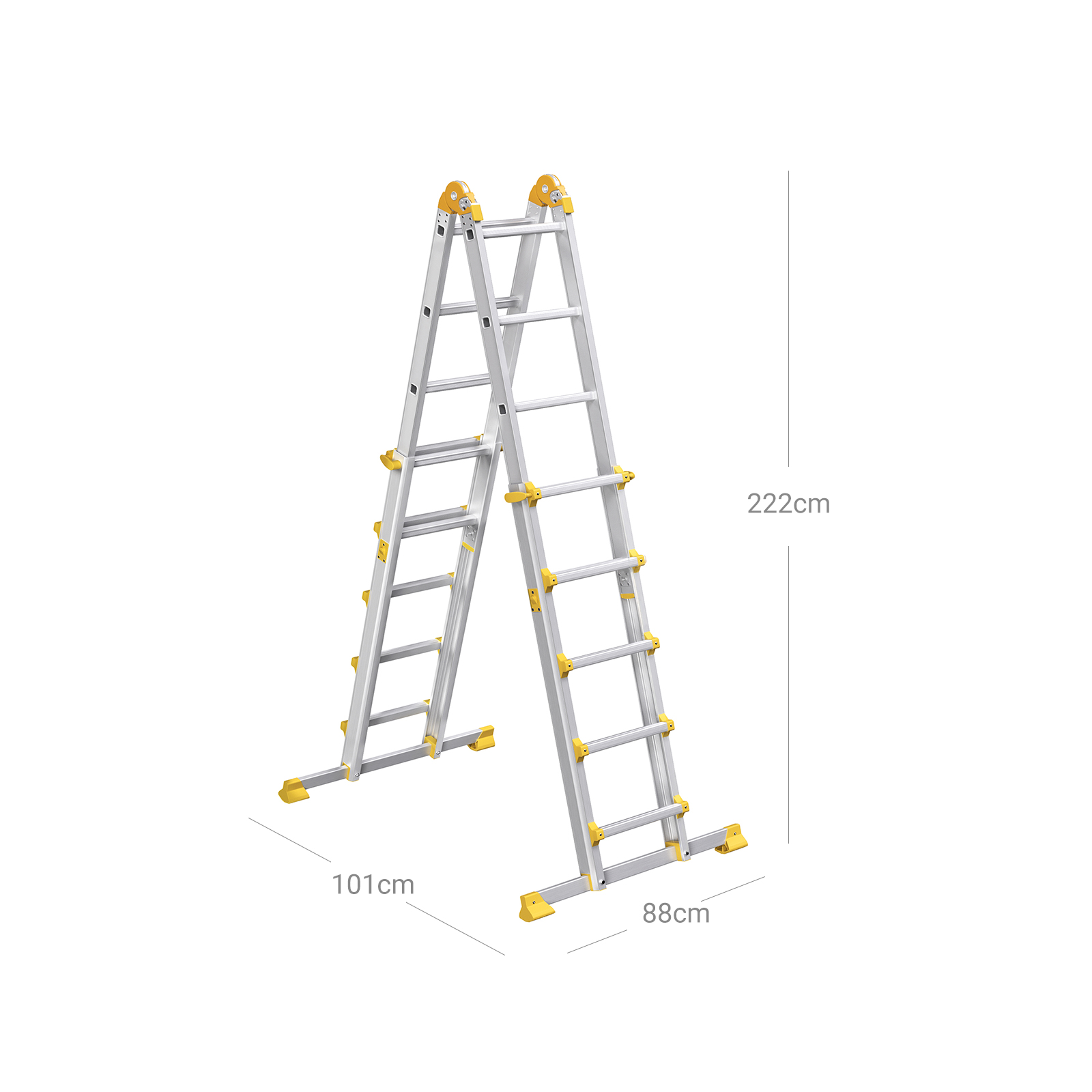 Fordele ved Songmics folde-stige: Kan bruges som forl?ngerstige og som l?nestige. Sikkerhedsl?se p? samlingen og p? trinene for st?rre sikkerhed. Skridsikre riller p? trinene forhindrer udskridning. Skridsikre gummif?dder for st?rre stabilitet. F?rsteklasses aluminium giver robusthed. Aluminiumstigen vejer kun 16 kg. Sammenklappelig, for nem transport og pladsbesparende opbevaring. B?reevne op til 150 kg. Produktdetaljer: Farve: S?lvgul Materiale: Aluminium St?rrelse sammenfoldet: 41,5 x 21,5 x 149,5 cm (L x B x H). Maksimal h?jde som lige l?nestige: 4,6 m Maksimal h?jde som A-formet trappestige: 2,2 m V?gt: 16 kg. Maks. statisk b?reevne: 150 kg. Indhold i kassen: 1 x stige, 1 x brugsanvisning (tysk, engelsk, fransk, spansk, italiensk). Songmics bem?rkninger: B?rn m? ikke bruge produktet. Brug ikke produktet, hvis der er olie p? gulvet. Brug ikke produktet p? uj?vnt eller glat underlag. S?rg for, at l?sene er sikret f?r brug for at undg? at glide.