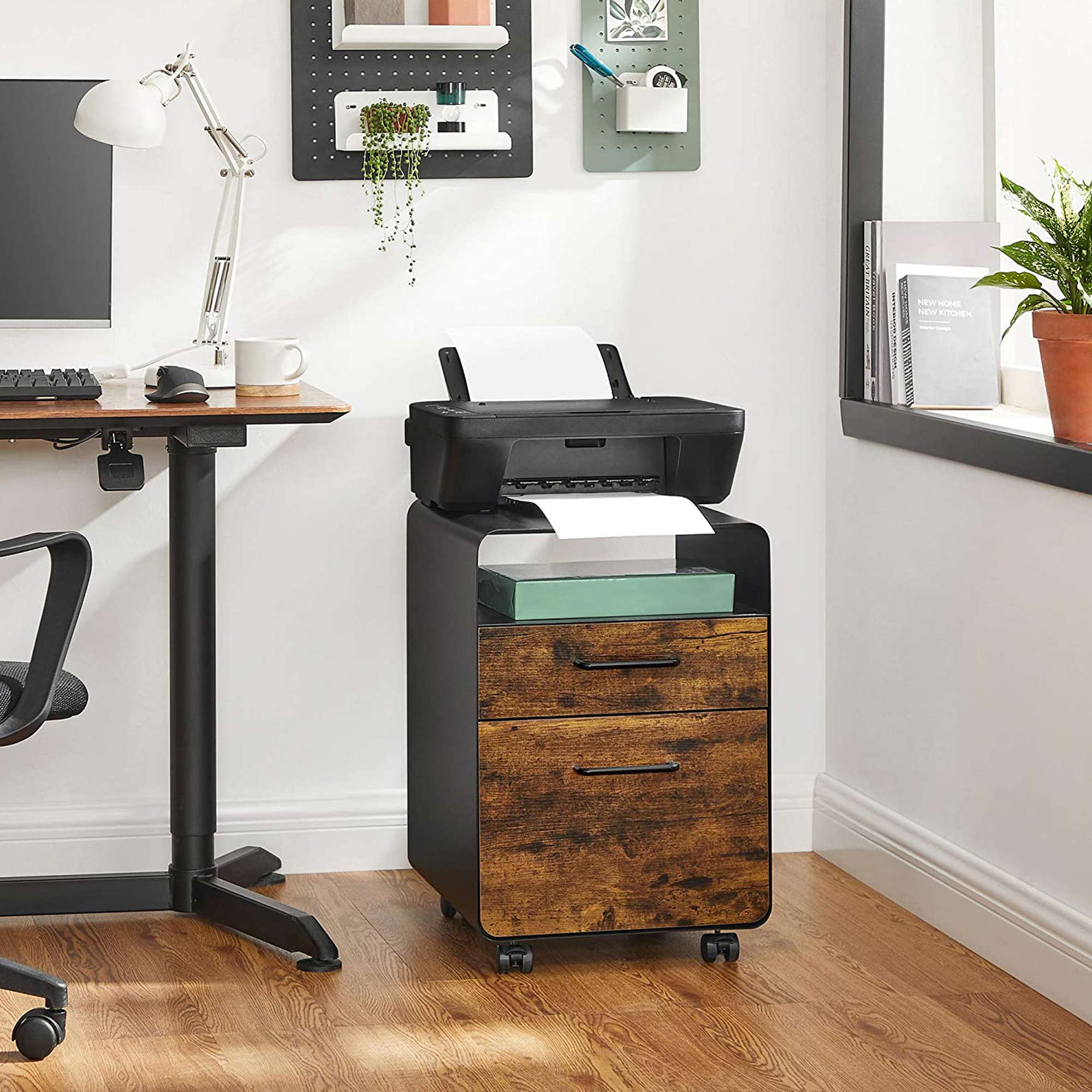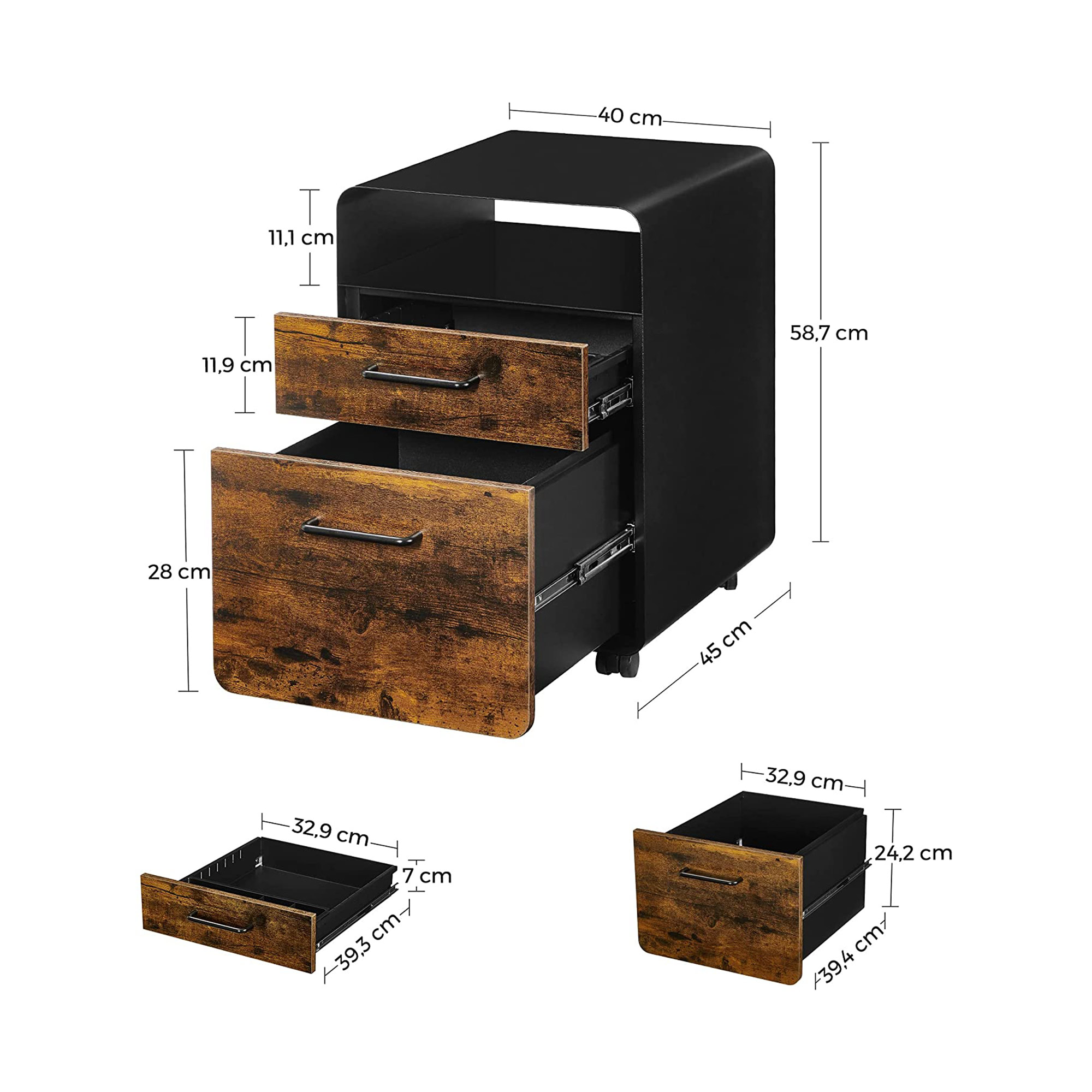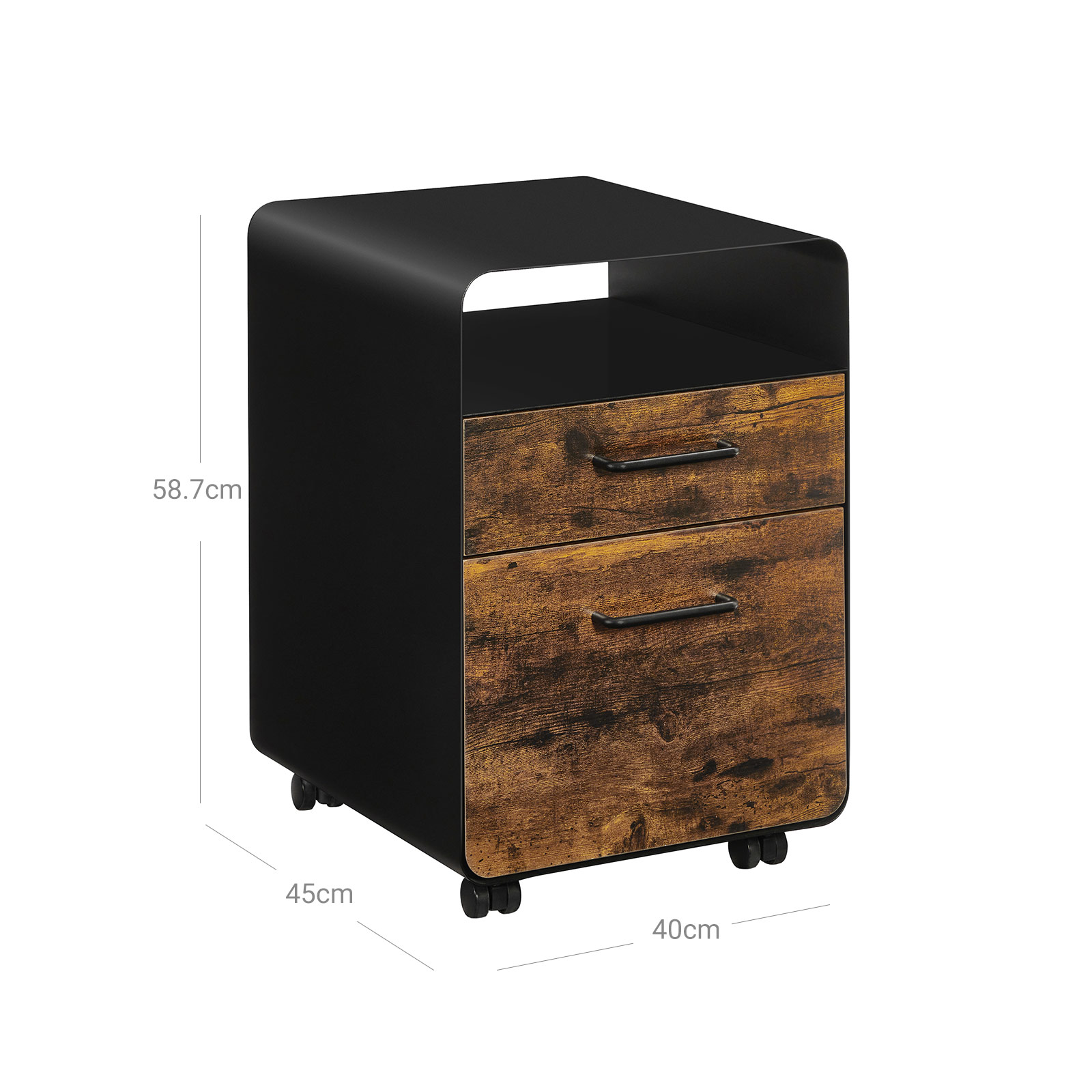 Tilf?j den n?dvendige opbevaringsplads: Ligger dine papirer spredt ud over dit skrivebord? Spild ikke mere tid p? at lede. S?t denne SONGMICS arkivskab op! En glat hylde ?verst, et ?bent rum, 2 skuffer, en h?ngemappe og en skuffeindsats ? forvandl dit hjemmekontor til et sandt opbevarings- og pr?sentationsvidunder med dette skab. Kan du lide denne stil? De tr?farvede skuffer og det sorte st?lstel udg?r tilsammen et vidunderligt arkivskab, der b?de er trendy og tidl?st. Produktdetaljer: Farve: Vintagebrun-sort Materiale: St?l, sp?nplade St?rrelse: 40 x 45 x 58,7 cm (L x B x H) V?gt: 22,5 kg Maks. statisk belastning pr. skuffe: 15 kg Maks. statisk belastning af det ?bne rum: 20 kg Maks. statisk belastning af overfladen: 50 kg Leveringsomfang: 1 x arkivskab 1 x skuffeorganizer til kontorartikler 1 x h?ngemappe 1 x tilbeh?rspakke 1 x vejledning SONGMICS Bem?rkninger:Af sikkerhedsm?ssige ?rsager er det forbudt for b?rn at klatre op p? produktet eller lege med det. Dette produkt har ikke en ekstra rulle p? den nederste skuffe, der beskytter mod v?ltning. Af sikkerhedsm?ssige ?rsager m? begge skuffer ikke ?bnes samtidigt.