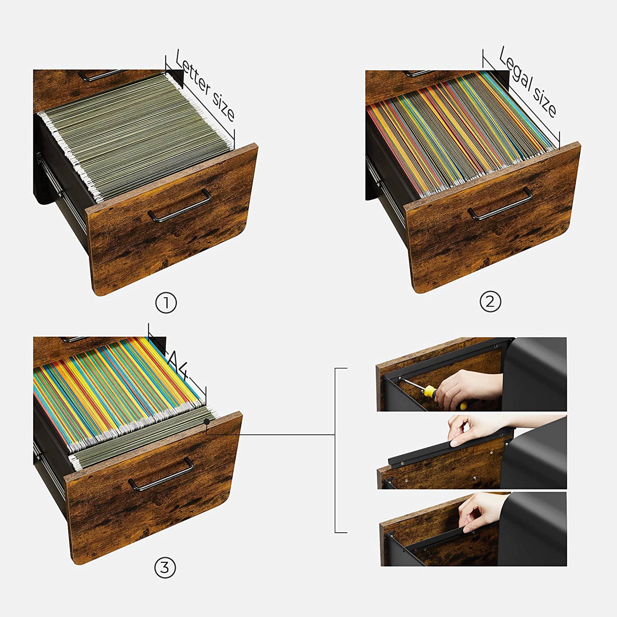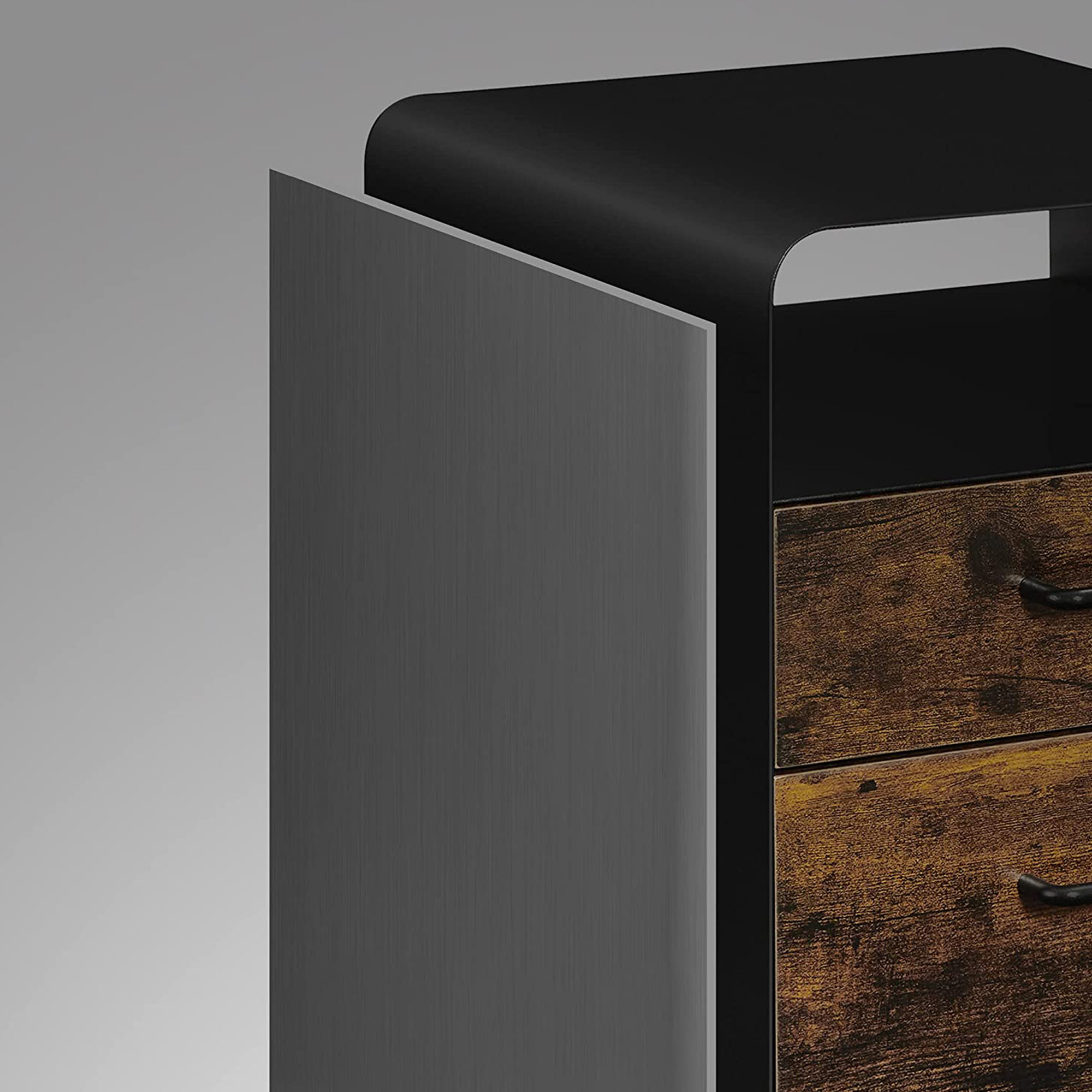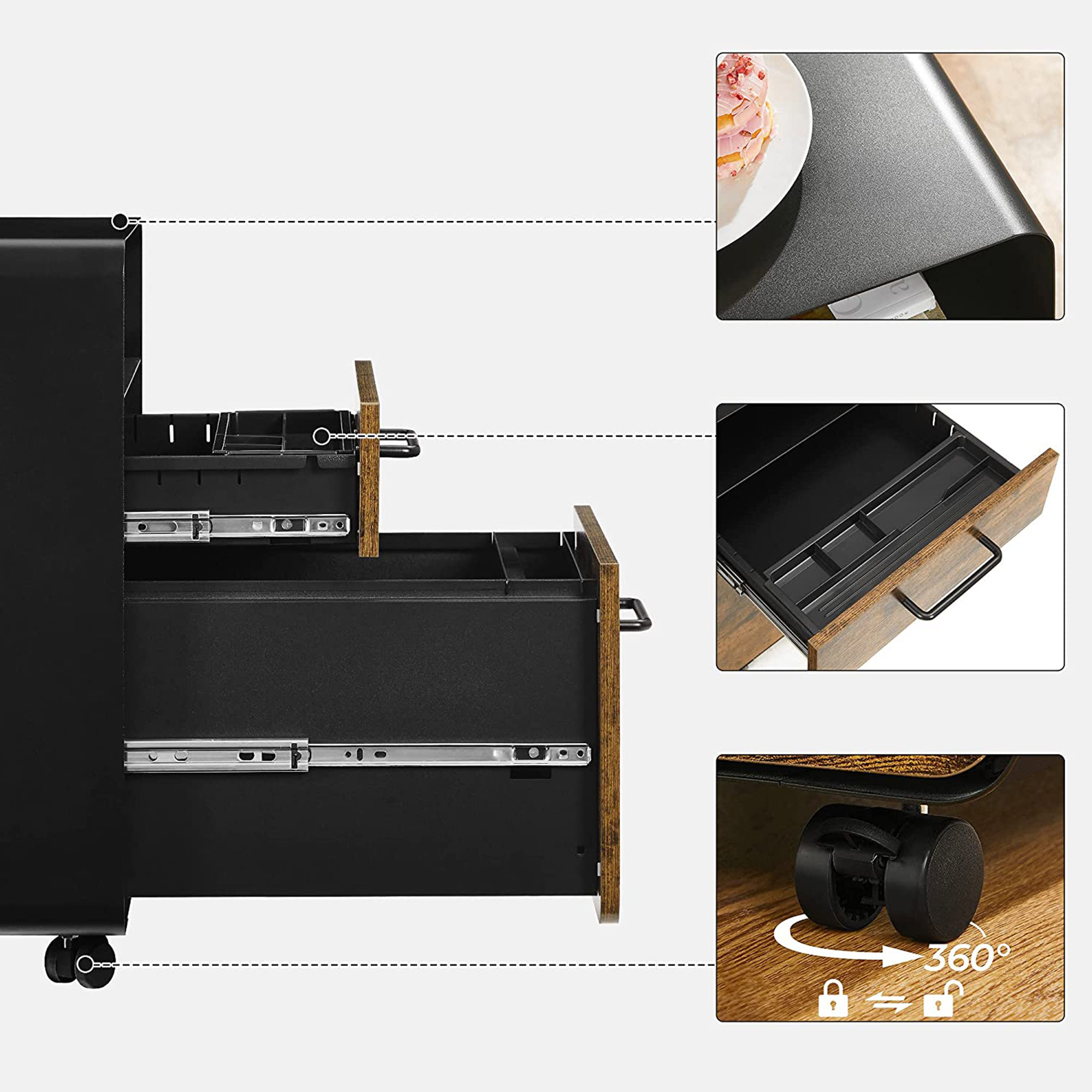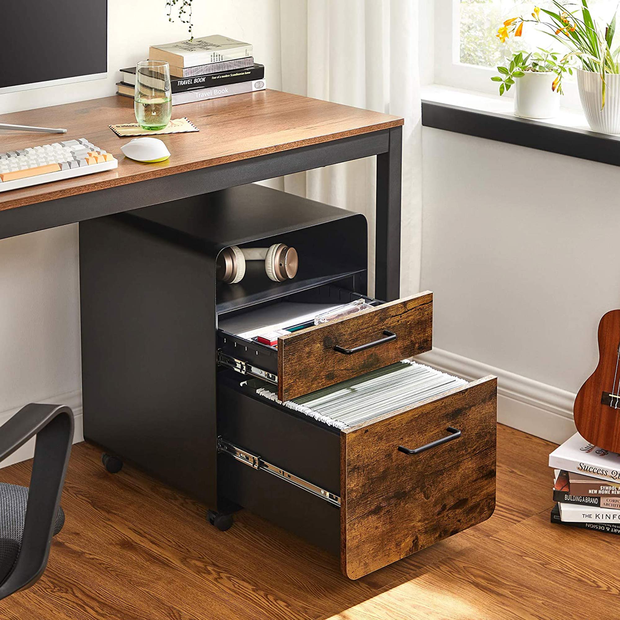 Tilf?j den n?dvendige opbevaringsplads: Ligger dine papirer spredt ud over dit skrivebord? Spild ikke mere tid p? at lede. S?t denne SONGMICS arkivskab op! En glat hylde ?verst, et ?bent rum, 2 skuffer, en h?ngemappe og en skuffeindsats ? forvandl dit hjemmekontor til et sandt opbevarings- og pr?sentationsvidunder med dette skab. Kan du lide denne stil? De tr?farvede skuffer og det sorte st?lstel udg?r tilsammen et vidunderligt arkivskab, der b?de er trendy og tidl?st. Produktdetaljer: Farve: Vintagebrun-sort Materiale: St?l, sp?nplade St?rrelse: 40 x 45 x 58,7 cm (L x B x H) V?gt: 22,5 kg Maks. statisk belastning pr. skuffe: 15 kg Maks. statisk belastning af det ?bne rum: 20 kg Maks. statisk belastning af overfladen: 50 kg Leveringsomfang: 1 x arkivskab 1 x skuffeorganizer til kontorartikler 1 x h?ngemappe 1 x tilbeh?rspakke 1 x vejledning SONGMICS Bem?rkninger:Af sikkerhedsm?ssige ?rsager er det forbudt for b?rn at klatre op p? produktet eller lege med det. Dette produkt har ikke en ekstra rulle p? den nederste skuffe, der beskytter mod v?ltning. Af sikkerhedsm?ssige ?rsager m? begge skuffer ikke ?bnes samtidigt.