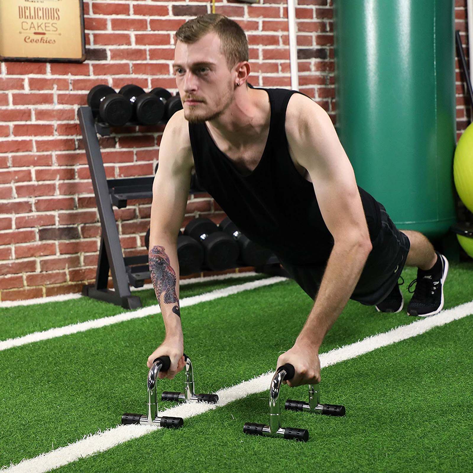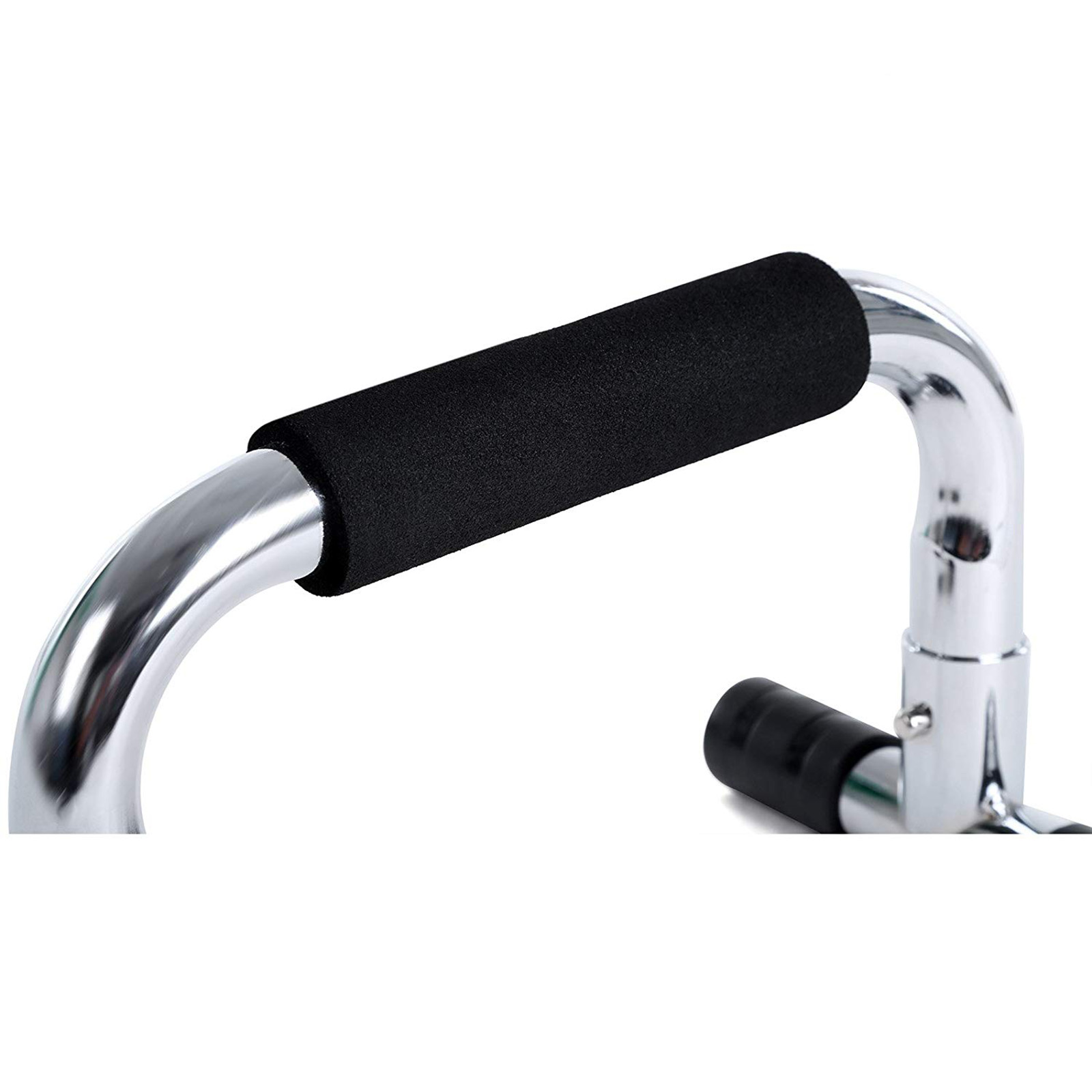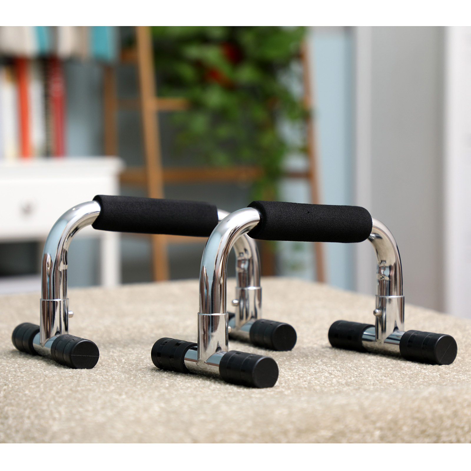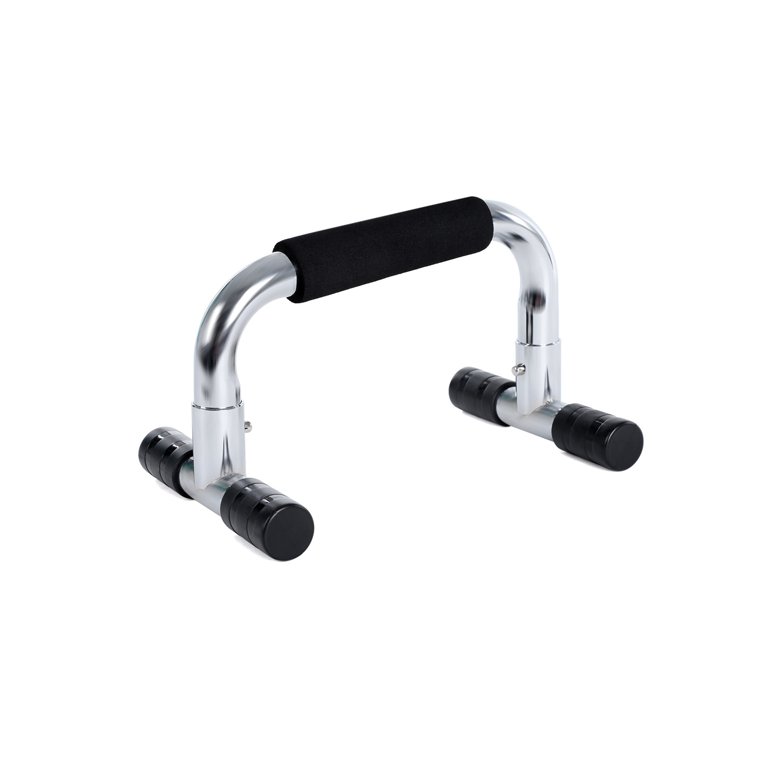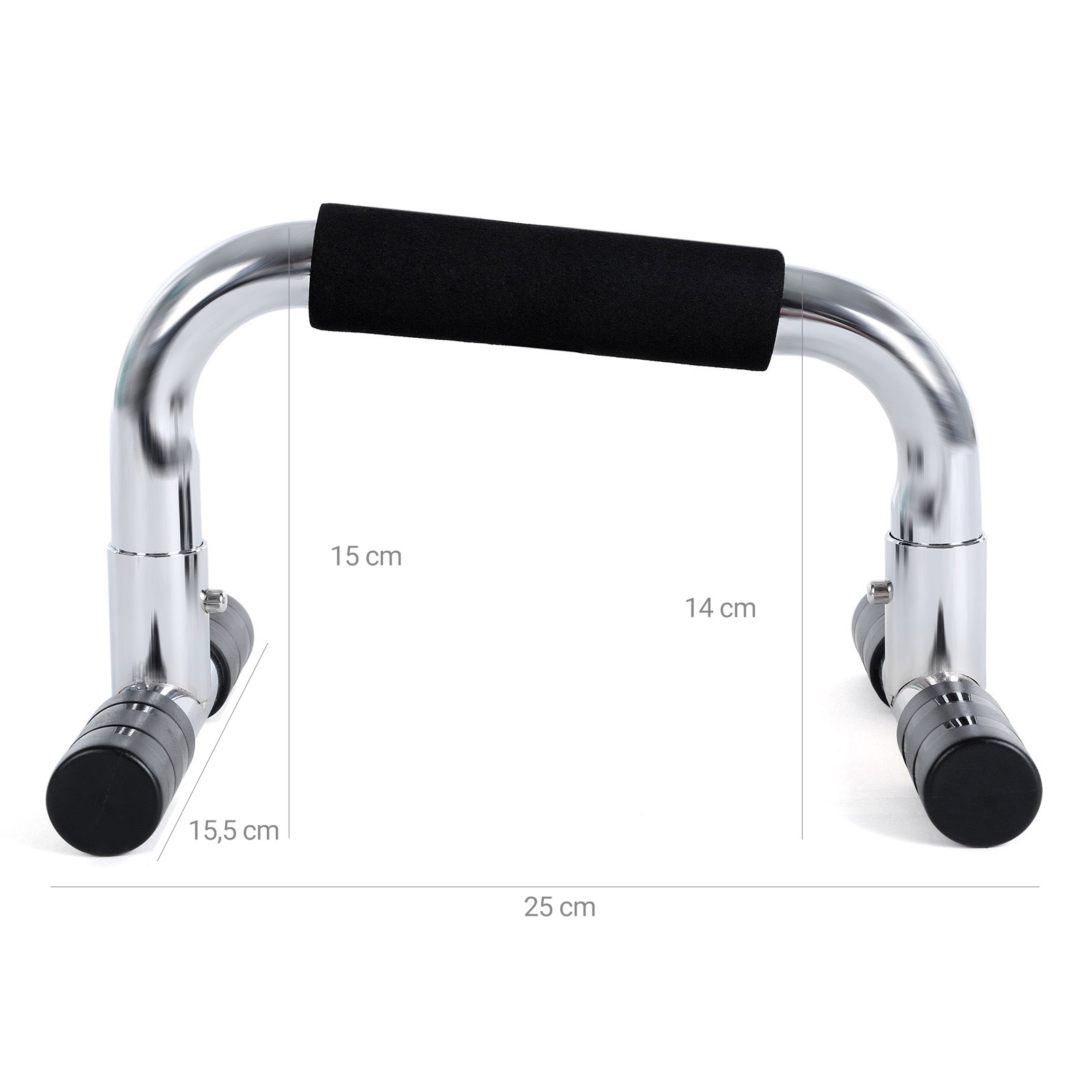S?rlig h?ldningsvinkel: Den s?rlige h?ldningsvinkel fordeler v?gten j?vnt p? h?ndleddene og beskytter dem. H?ndtagsbekl?dning af fortykket skum: Bekl?dningen ligger behageligt i h?nderne, absorberer sved og er slidst?rk og skridsikker. H-formet struktur: Denne struktur er stabil og sikker, s? man nemt kan holde balancen.Bem?rkninger: F?r brug skal du sikre dig, at fjederknapperne er korrekt fastgjort i hullerne i f?dderne. Begyndere b?r undg? h?j tr?ningsintensitet for ikke at belaste musklerne for meget.Produktdetaljer: Materiale: forkromet st?lr?r + h?jdensitetsskum + plast M?l: 25 x 14 x 17 cm (B x H x D) V?gt: ca. 1 kg Leveringsomfang: 1 par armb?jningsgreb 1 x vejledning (DE, EN, FR, IT, ES)