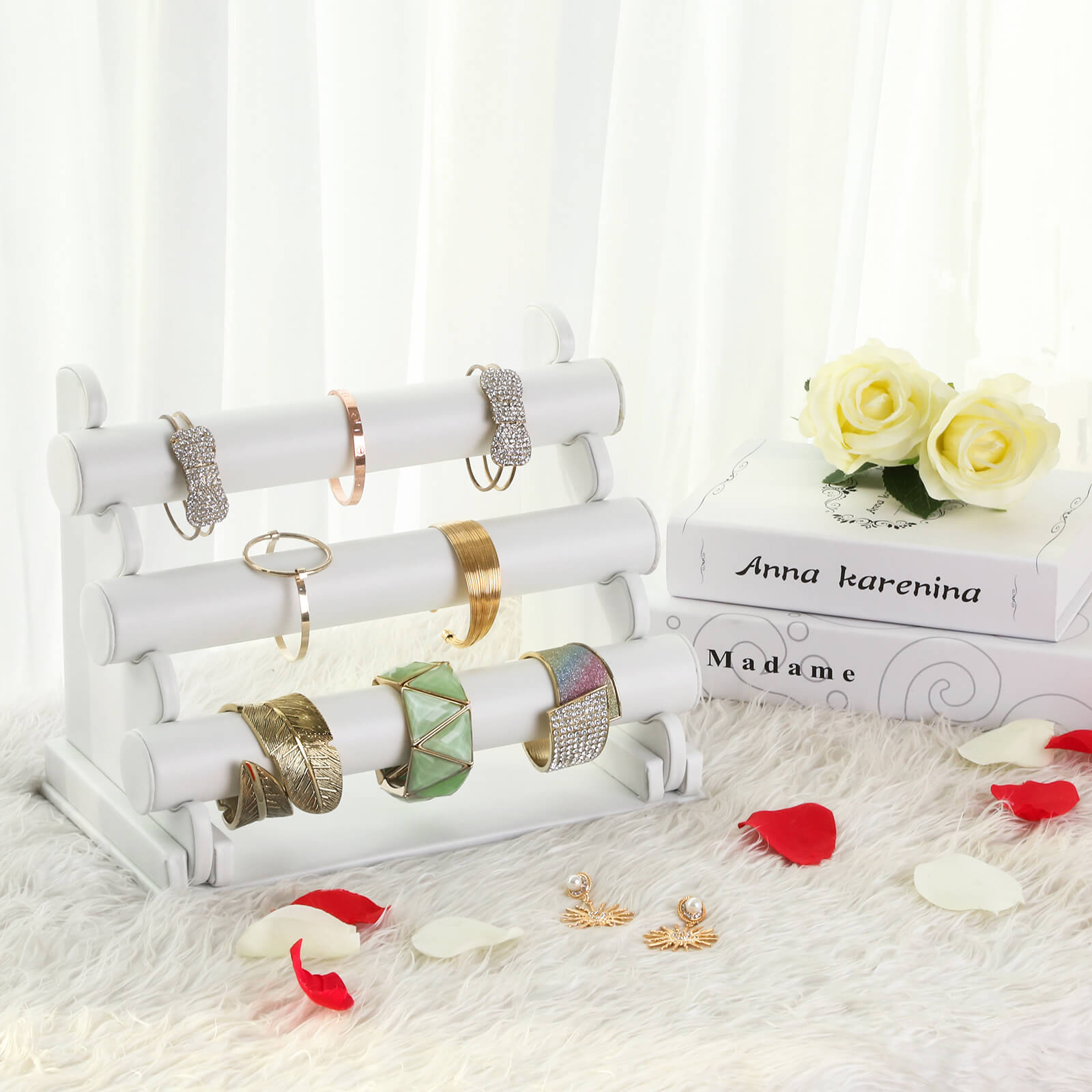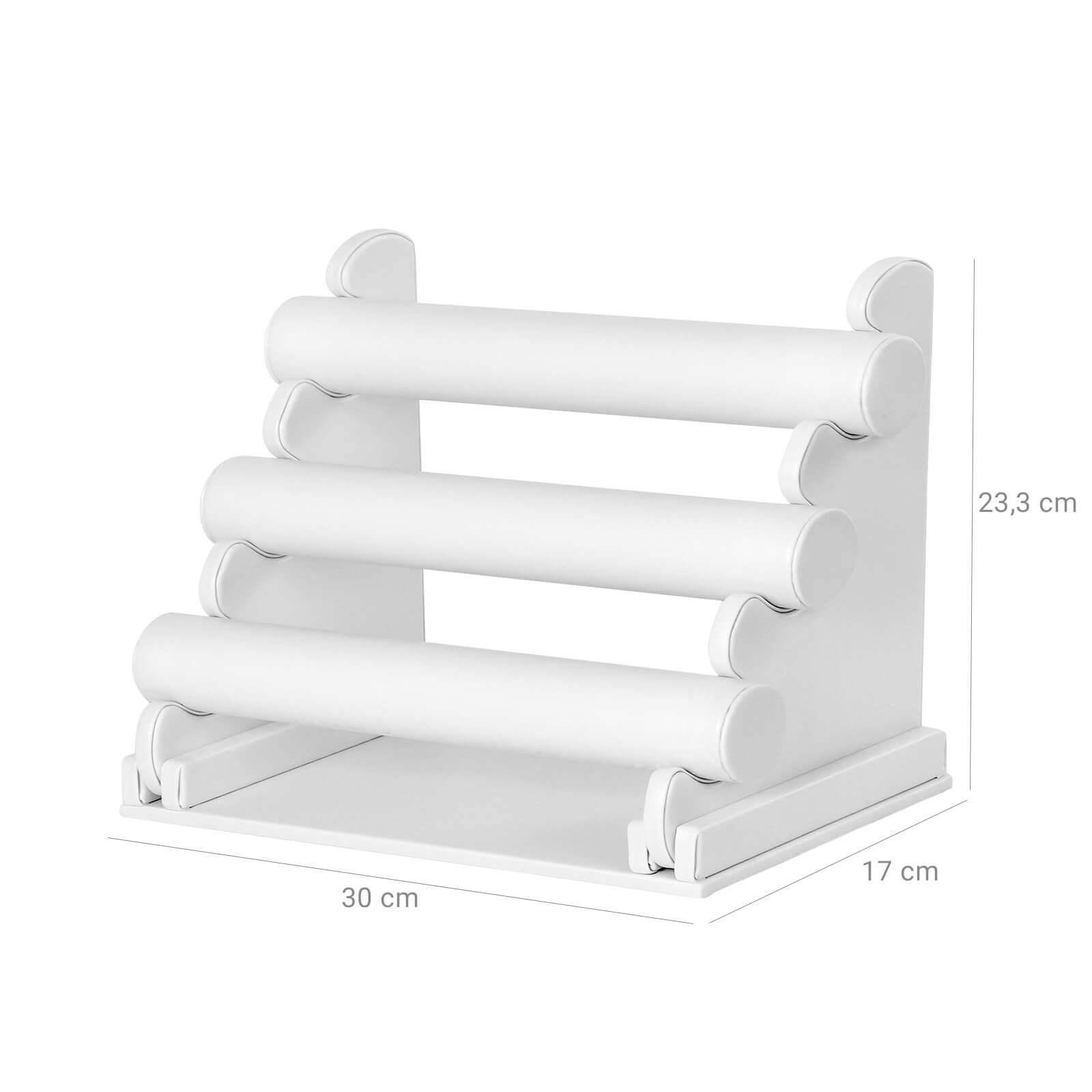 Produktdetaljer: – En smuk, elegant og tidl?s smykkestativ! Denne elegante smykkestativ overbeviser ikke kun med sit elegante design, men ogs? med sin h?je funktionalitet. Med 3 aftagelige ruller er stativet velegnet til organisering, opbevaring og pr?sentation af dine armb?nd, ure og k?der. – Det eksklusive armb?ndsstativ bringer orden i ethvert armb?ndschaos og f?r armb?ndene til at fremst? eksklusive og elegante. Et must for alle smykkefans! Bem?rkninger: – Der kan opst? trykm?rker under transporten, men disse forsvinder efter f? timer og p?virker ikke brugen. – Rullens omkreds er 11,9 cm. F?r k?bet bedes du m?le l?ngden af dine smykker for at udelukke, at st?rrelsen ikke er tilstr?kkelig. Leveringsomfang: – 1 x smykkestativ (uden smykker)