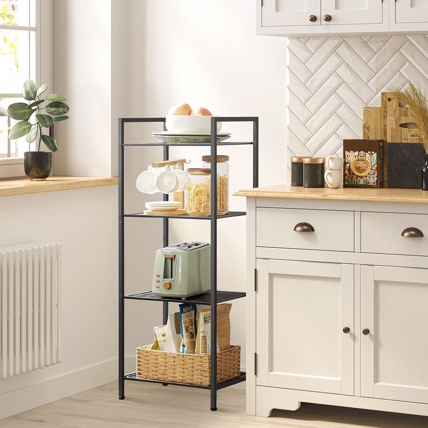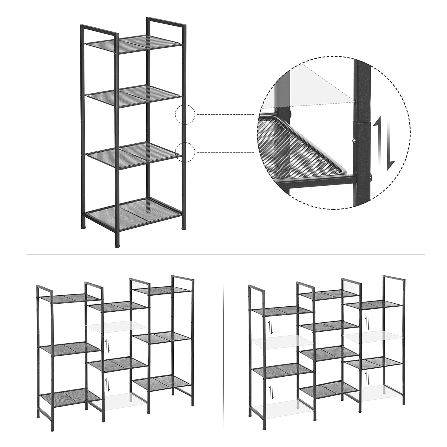 SONGMICS badev?relsesreol af metal, k?kkenreol, 4 hylder, badev?relsesreol, stativreol, plantehylde, udvidelig, justerbare hylder, industrielt design, til badev?relse, k?kken, sort BSC034B01