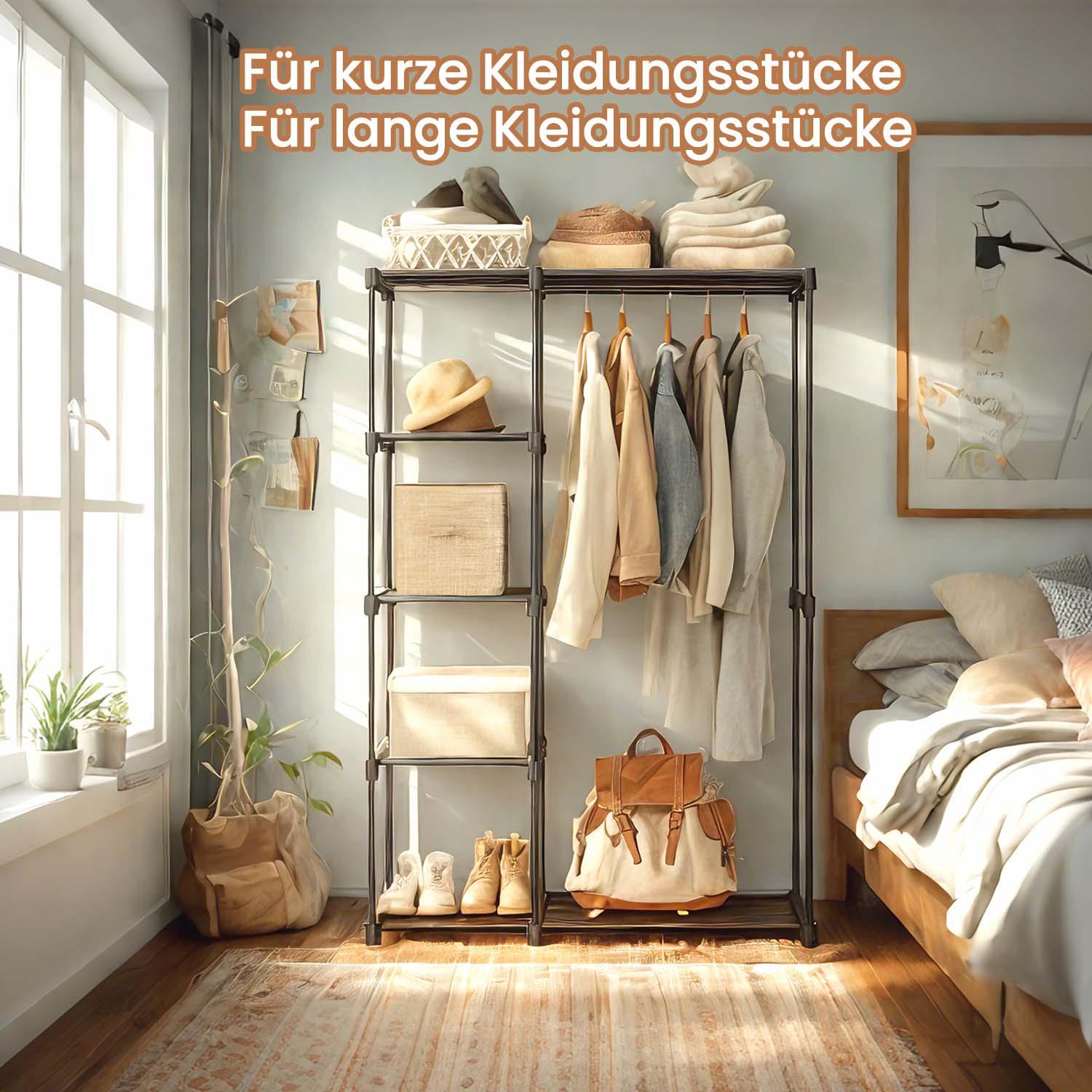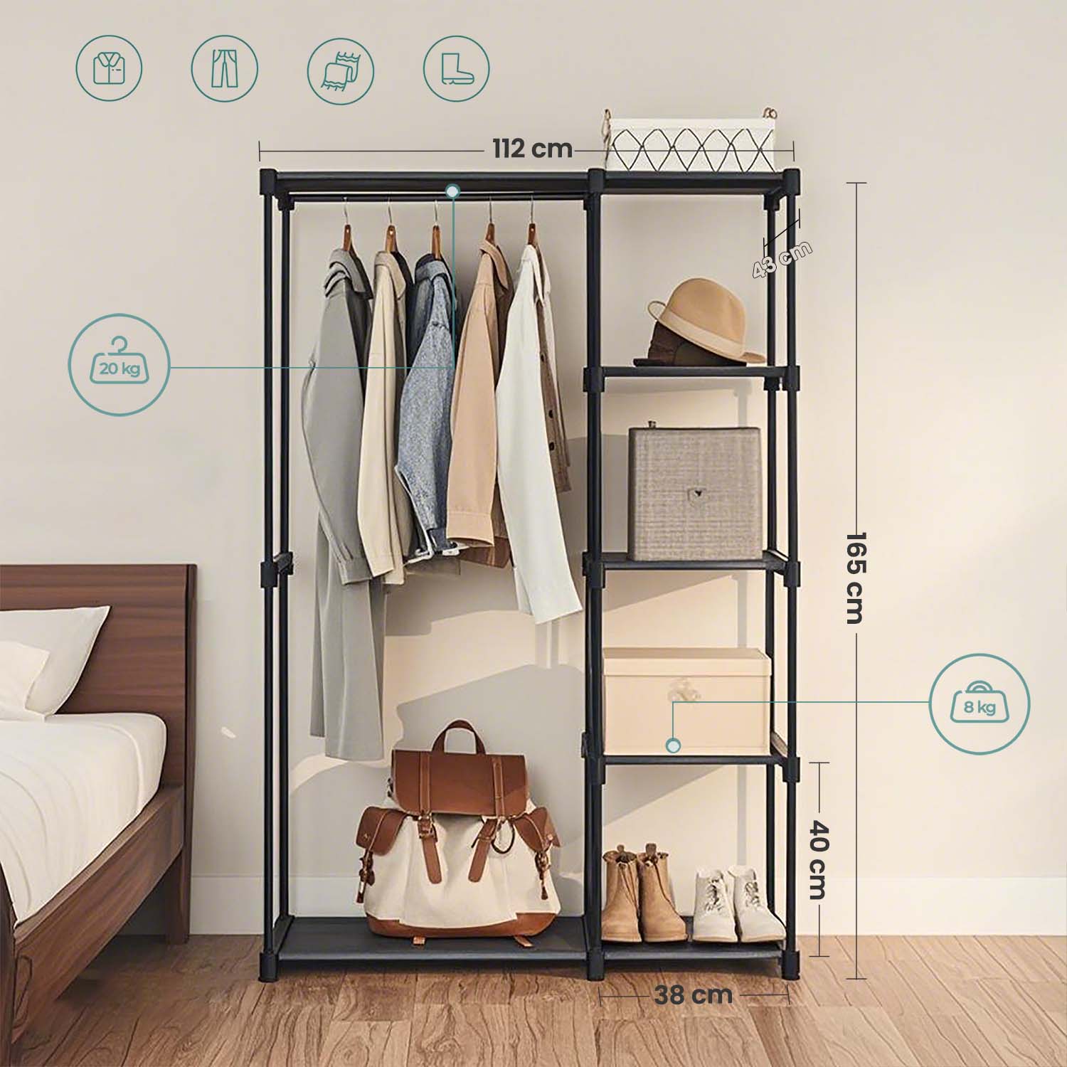 SONGMICS Garderobeskab, fritst?ende garderobe, sammenklappelig, t?jstativ med t?jst?nger, garderobestativ, opbevaring, p?kl?dningsv?relse, sovev?relse, stabil, 112 x 43 x 165 cm, sort RYG24BK