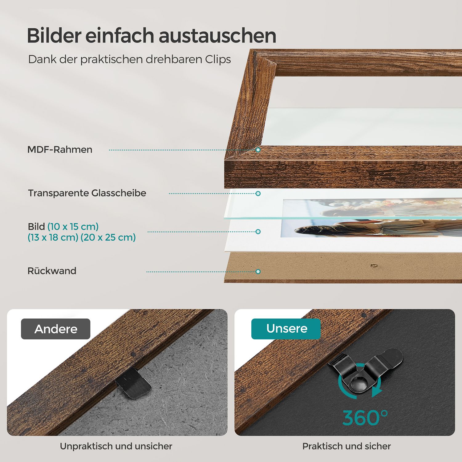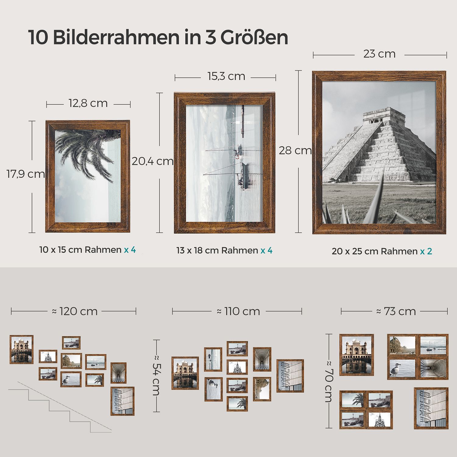 SONGMICS billedramme 16 passepartouts, s?t med 10 fotorammer, to 20 x 25 cm, fire 13 x 18 cm, fire 10 x 15 cm, til oph?ngning, til opstilling, MDF, glas, 12 sporl?se v?gkroge