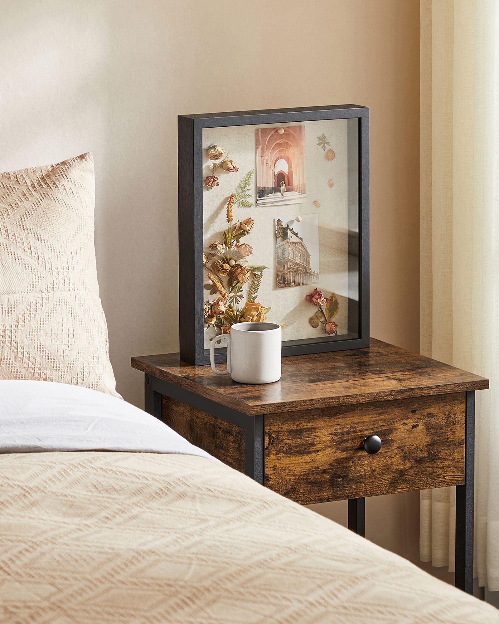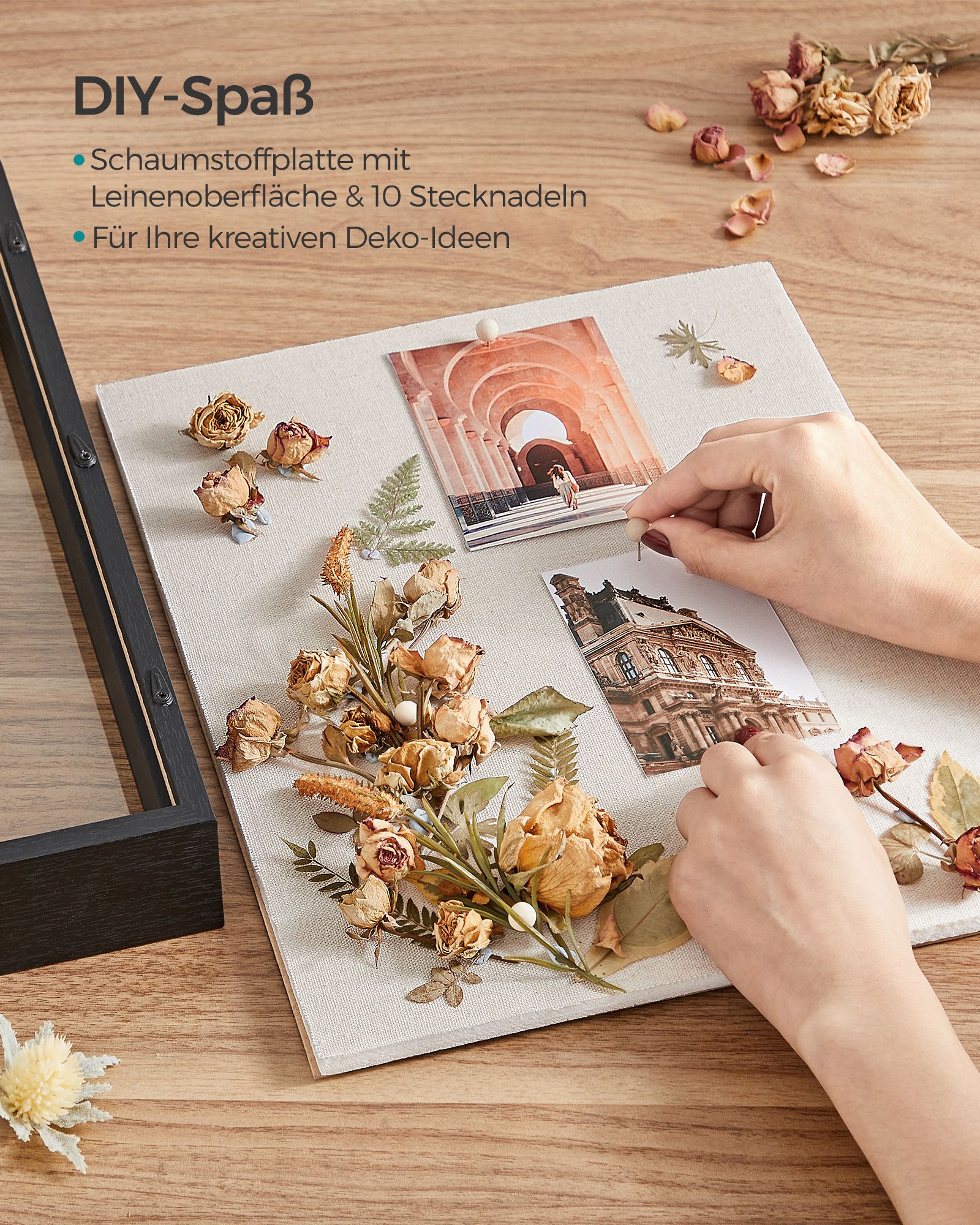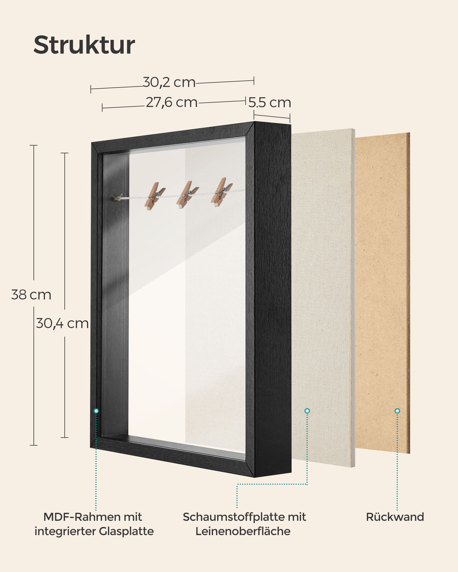 SONGMICS billedramme 3D, kasse, fotoramme med snor, sm? t?jklemmer og n?le, DIY, linnedoverflade og polstring p? indersiden, glasplade, af MDF, hvid RPF007W01