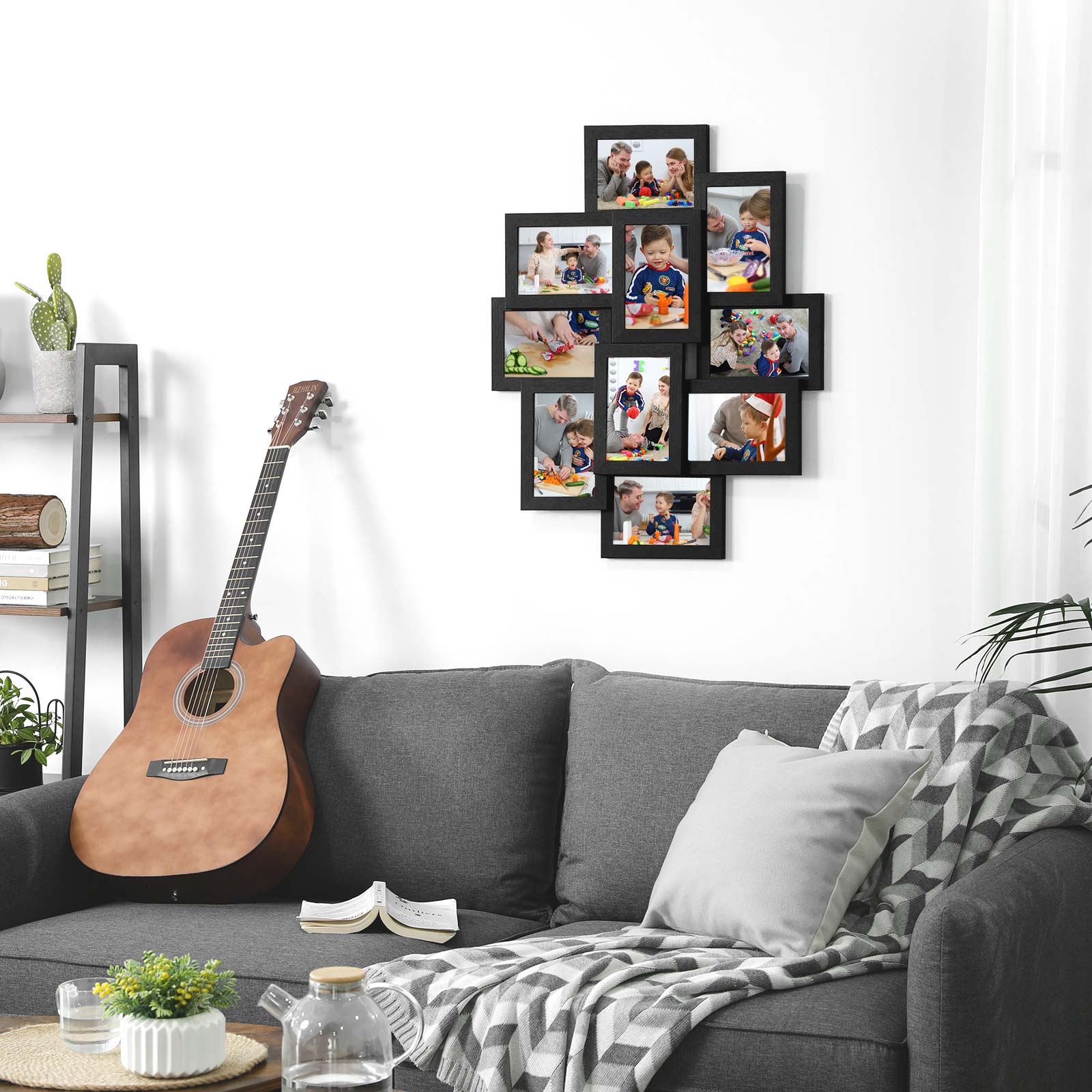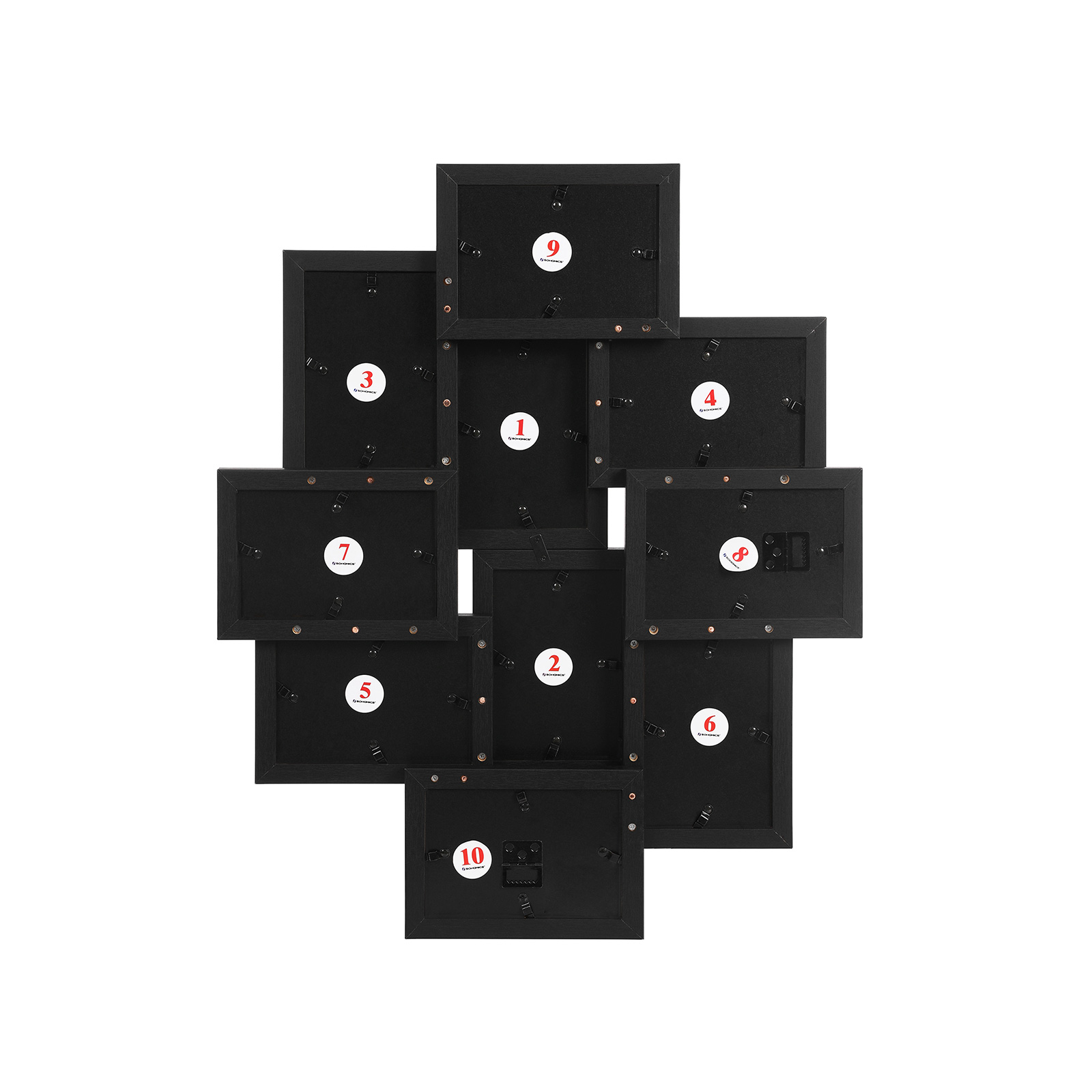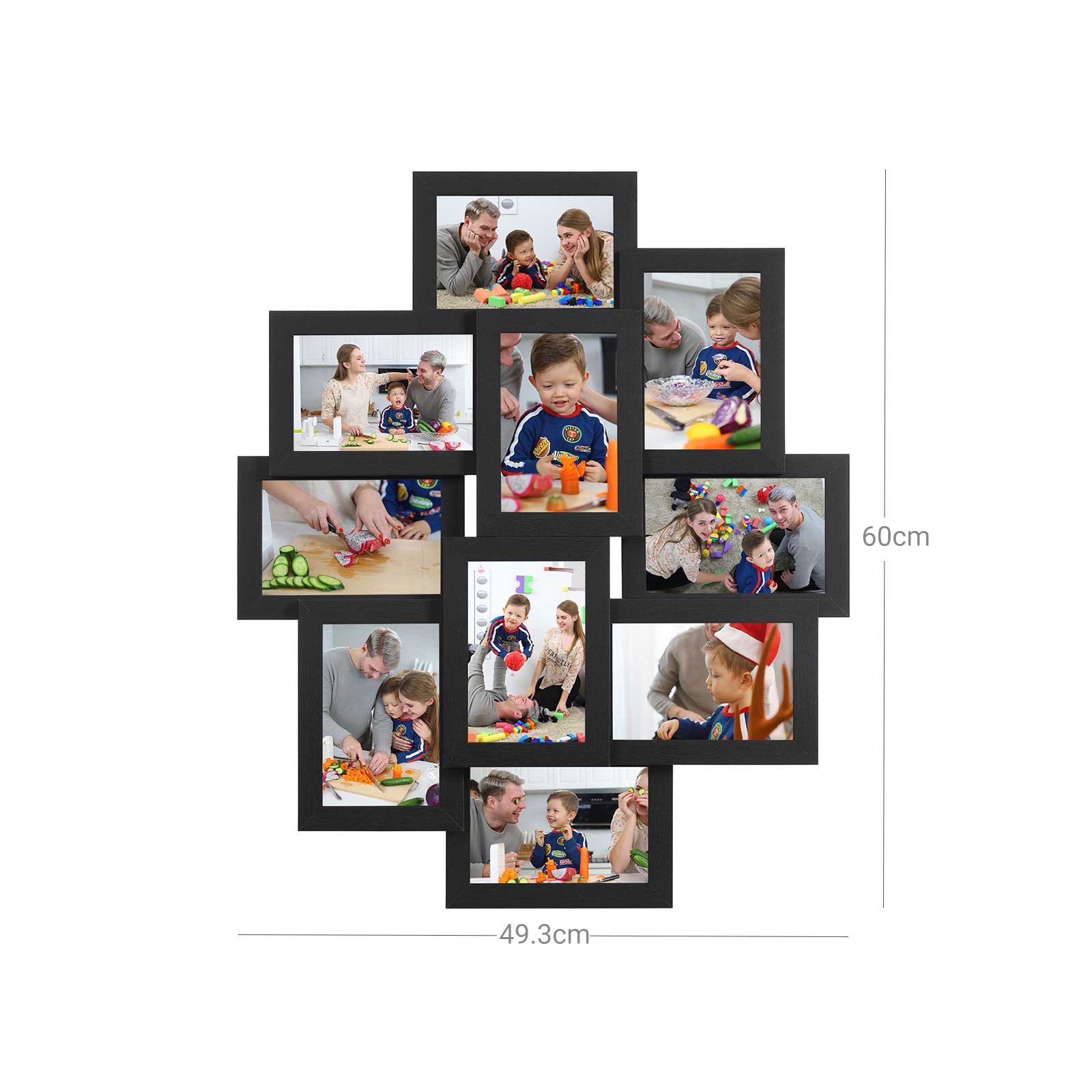 Fyld denne ramme med dine yndlingsfotos og h?ng den op. Billedrammen med tr?struktur vil dekorere din v?g og altid minde dig om de smukke ?jeblikke. Produktdetaljer: Samlede m?l: 60 x 49,3 x 3,6 cm (B x H x D) Fotoets m?l: 10 x 15 cm Rammefarve: sort Materiale: MDF, polystyren V?gt: 1,8 kg Leveringsomfang: 10 x billedrammer 1 x beslagspose 1 x pose med tr?dyvler SONGICs bem?rkninger: Luftbobler og d?rlig lysgennemtr?ngelighed i det gennemsigtige billedcover skyldes beskyttelsesfolien. Fjern venligst de to beskyttelsesfolier inden brug.Collagerammen best?r af flere billedrammer. Denne model skal samles og h?nges op p? v?ggen; billedrammerne kan ikke bruges separat.