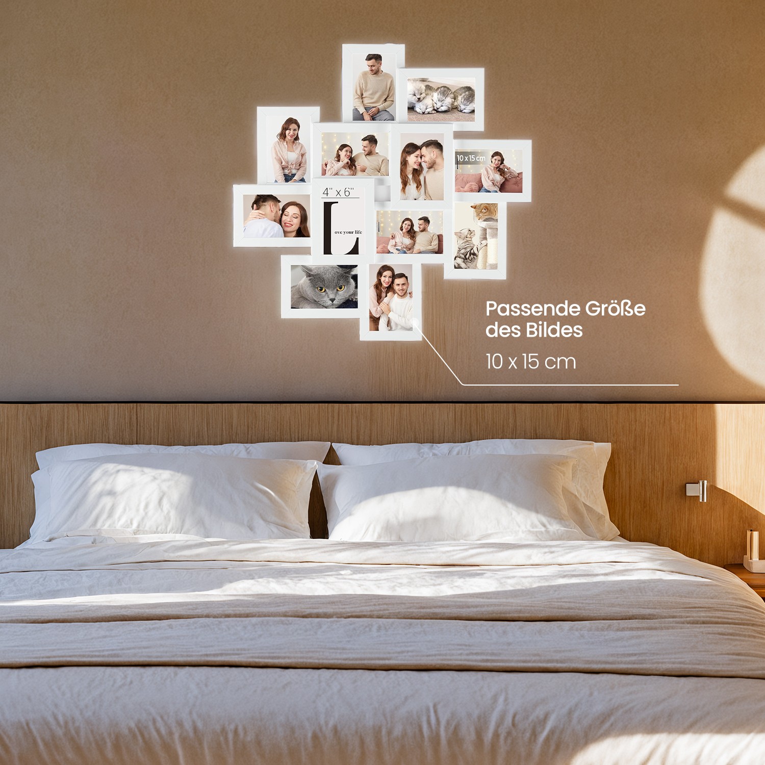 En fotoramme-collage fuld af minder Disse fotorammer i elegant hvidt pynter dit stue, kontor, arbejdsv?relse eller sovev?relse med dine smukkeste minder. S?t 12 fotos i disse fotorammer og h?ng dem op p? en tom v?g, s? du kan dele dine mest sp?ndende ?jeblikke med dine g?ster. Desuden er dine fotos godt beskyttet mellem tr?fiberpladen og glasset. Produktdetaljer: – Farve: Hvid – Materiale: MDF (medium densitet fiberplade), glas – St?rrelse: 63,3 x 3,6 x 63,3 cm (L x B x H) – V?gt: 2,2 kg Leveringsomfang:- 1 x billedramme-collage – 1 x beholder med tilbeh?r – 1 x vejledning (DE, EN, FR, ES, IT) SONGMICS Bem?rkninger: – Dette produkt best?r af flere billedrammer, som skal monteres p? v?ggen. Billedrammerne kan ikke bruges separat.
