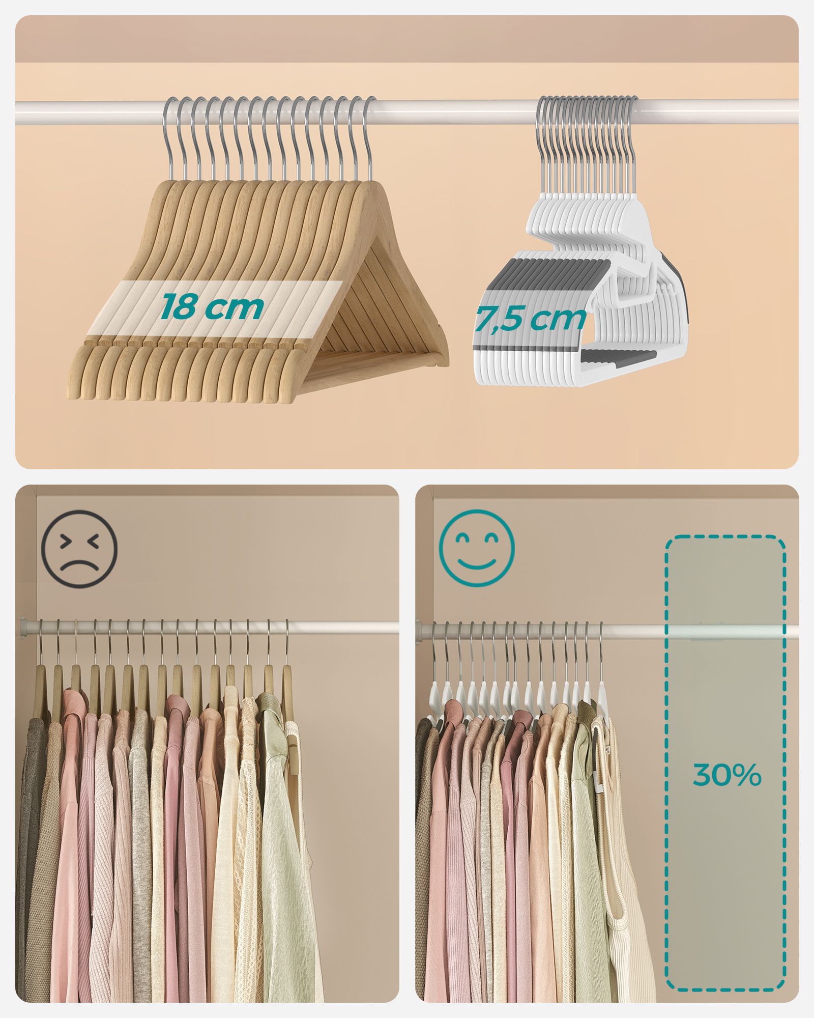 Skridsikkert og slankt design: Takket v?re gummi-p?s?tninger p? skulderomr?det og p? midterstangen kan jakker, veste og bukser h?nges sikkert op. B?jlerne er kun 0,5 cm tykke og tager derfor kun lidt plads i kl?deskabet. De er dog robuste, ikke let skr?belige og kan ogs? uden problemer b?re tunge bekl?dningsgenstande.