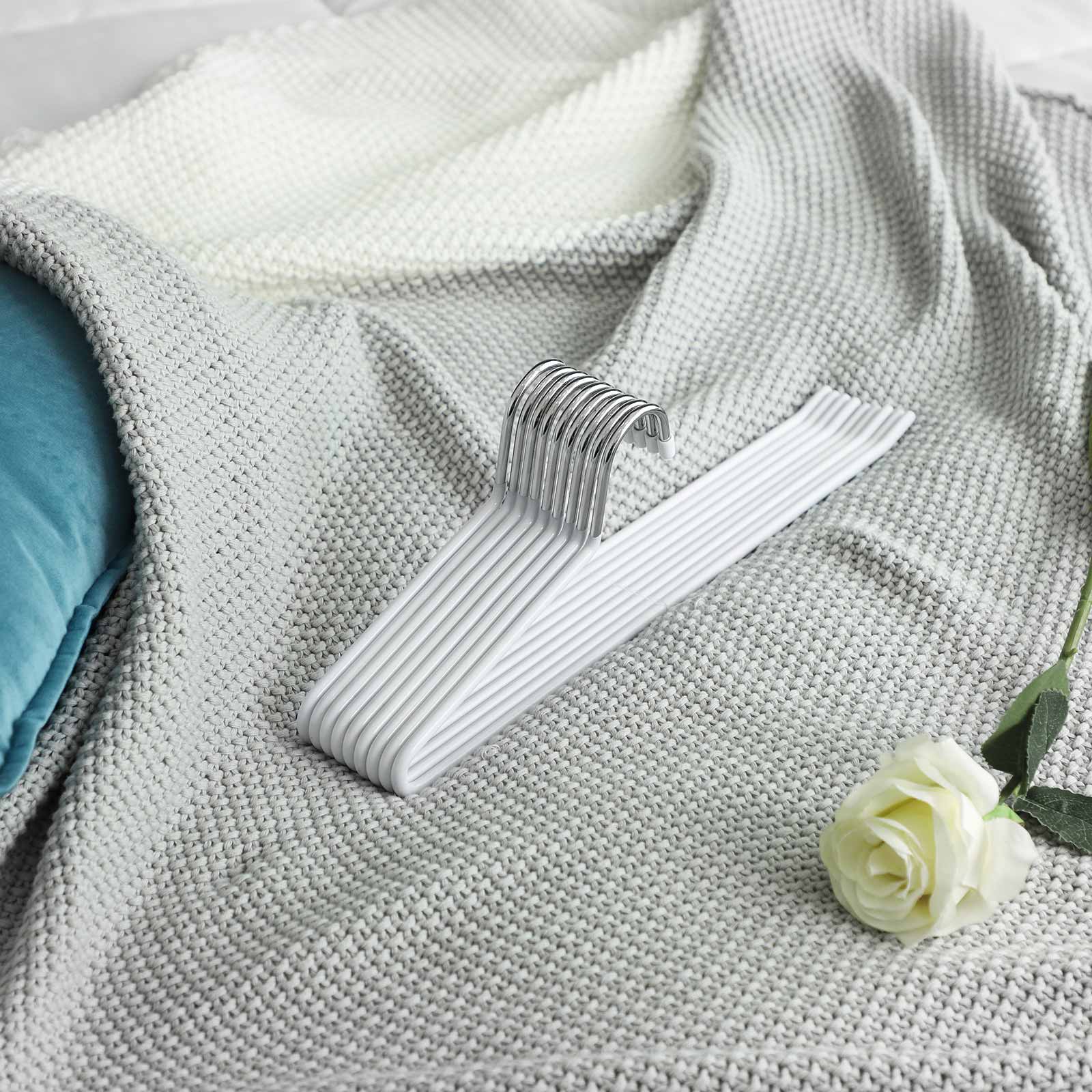 Design med ?ben ende Det smarte design g?r det nemmere at h?nge t?j op og tage det ned igen. Desuden udg?r b?jlens krop en helhed og er str?mlinet. Skridsikker Den belagte stang er let buet opad i enden for at forhindre, at dit t?j glider ned.Forkromet materiale Det forkromede materiale med blank overflade er robust, rust- og oxidationsbestandigt. Plastbel?gning Takket v?re den h?jkvalitative PVC-bel?gning kan dit t?j h?nges op uden at blive kr?llet og uden at glide. Slankt og pladsbesparende H?ng en lang r?kke t?jstykker op p? en overskuelig m?de og skab dermed orden i dit kl?deskab.Forst?rket tr?dMetaltr?den har en diameter p? 5 mm og er meget belastbar. Du beh?ver derfor ikke bekymre dig om, at b?jlen bliver deformeret.Produktdetaljer:Materiale: forkromet metal + PVC-bel?gningFarve p? krogen: HvidM?l: 38 x 13 cm (B x H)V?gt: 2,15 kgLeveringsomfang:20 x buksestativBem?rk:Undg? at opbevare stativerne i l?ngere tid i rum med h?j luftfugtighed og temperatur.Brug en let fugtet klud til reng?ring.