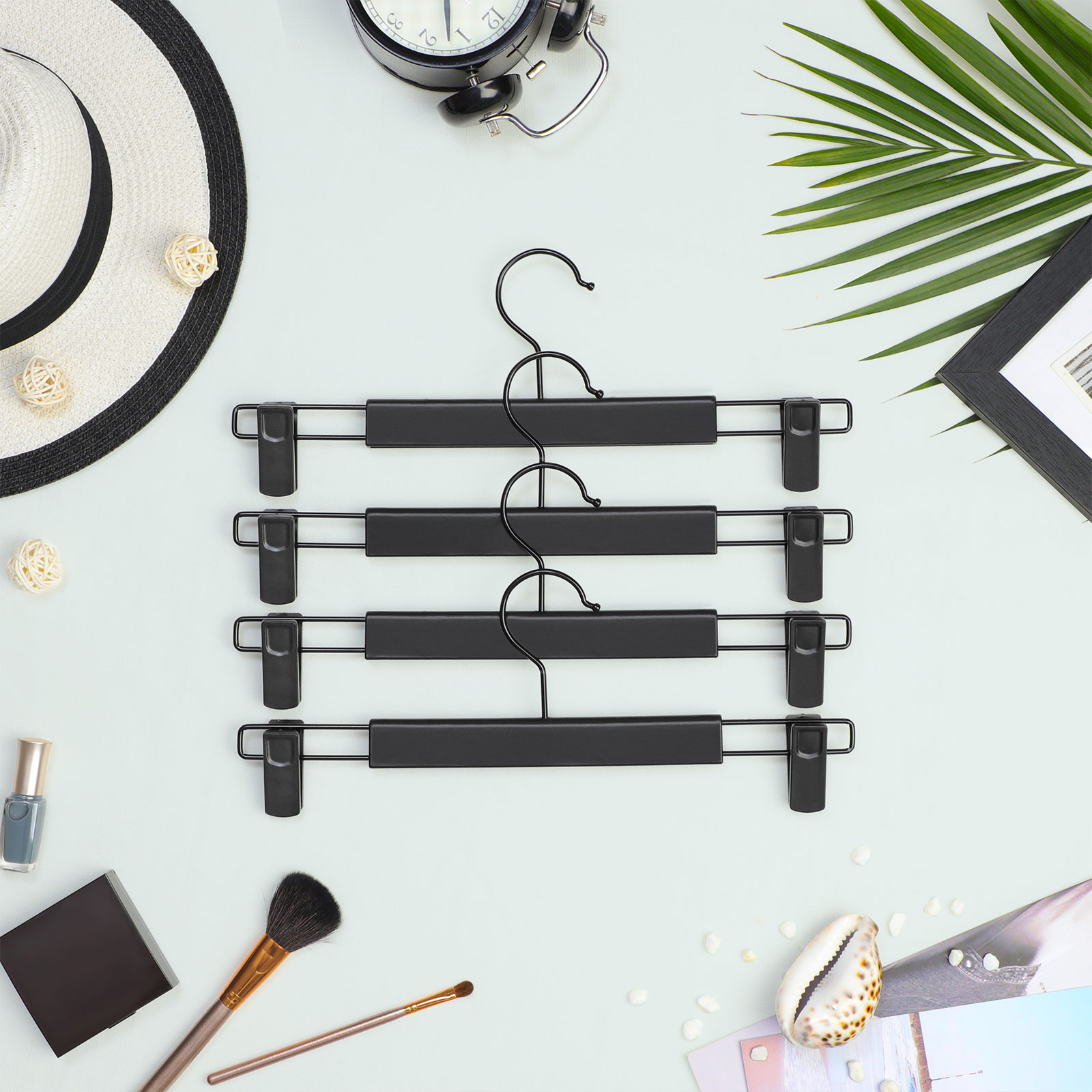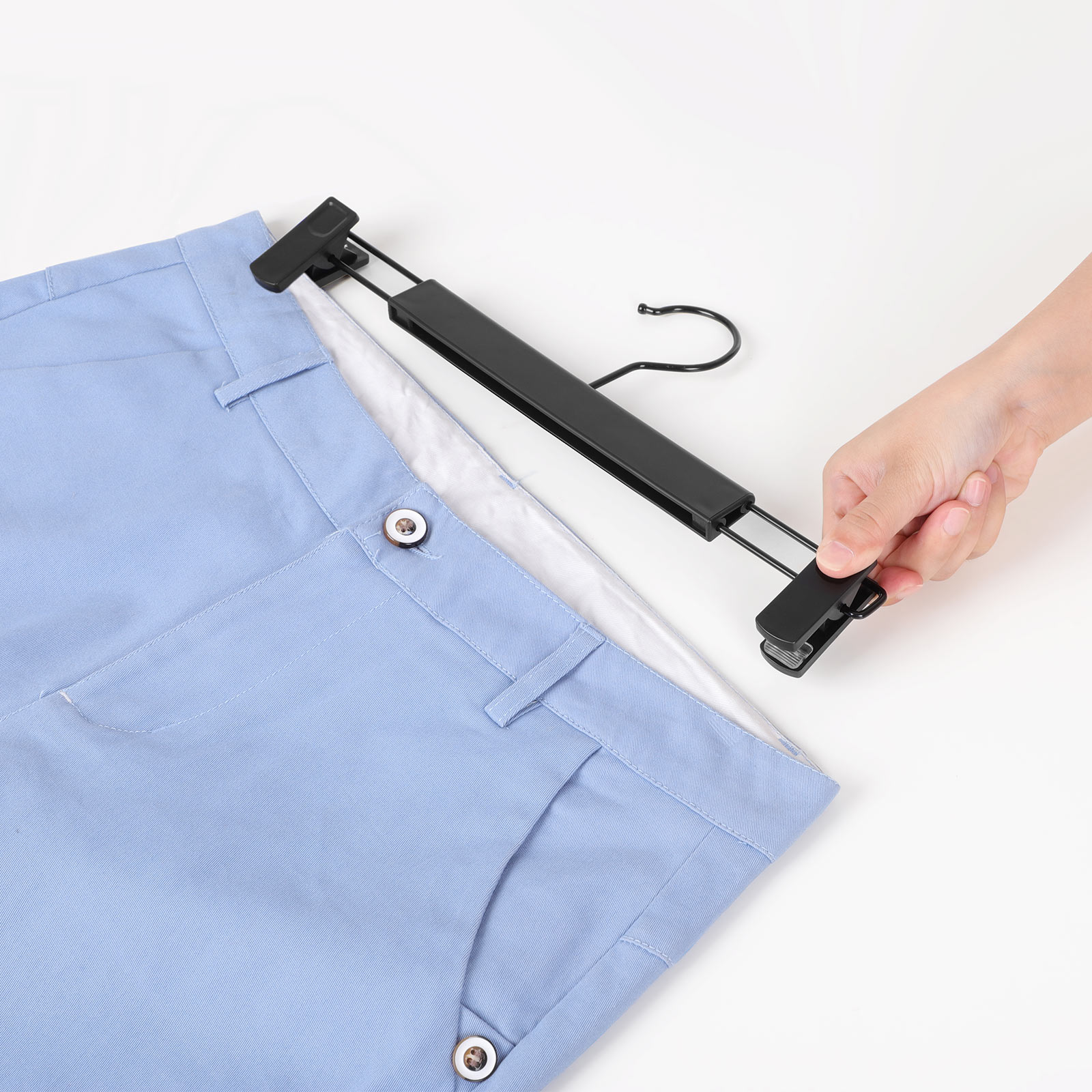 Endelig et ensartet look Sort krog, sorte st?nger, sorte klips ? disse buksestativ har et ensartet look. H?ng dem i dit kl?deskab og giv det ogs? et ensartet look. Alle t?jstykker h?nges p?nt op p? ensartede b?jler. En fryd for ?jet! Velegnet til alle former for t?j Uanset om det er bukser, nederdele, sokker, t?rkl?der, bh’er eller stroptops ? alle familiens t?jstykker passer p? disse plastikb?jler. Flyt klipsene til venstre eller h?jre for at tilpasse dem til st?rrelsen p? forskellige t?jstykker ? t?j til voksne eller b?rn? Intet problem! Hver b?jle kan desuden b?re v?gte p? op til 5 kg, s? du trygt kan h?nge selv tunge jeans p? dem. Produktdetaljer: – Farve: Sort – Materiale: ABS-plast, metal – St?rrelse pr. b?jle: 35,5 x 1 x 15 cm (L x B x H) – V?gt: 78 g – Maks. statisk belastning pr. b?jle: 5 kg Leveringsomfang: – 12 x buksb?jler SONGMICS Bem?rkninger: – Den maksimale belastning pr. b?jle er 5 kg. Overskrid ikke denne maksimale v?gt. – Brug ikke disse b?jler i t?rretumbleren eller vaskemaskinen.