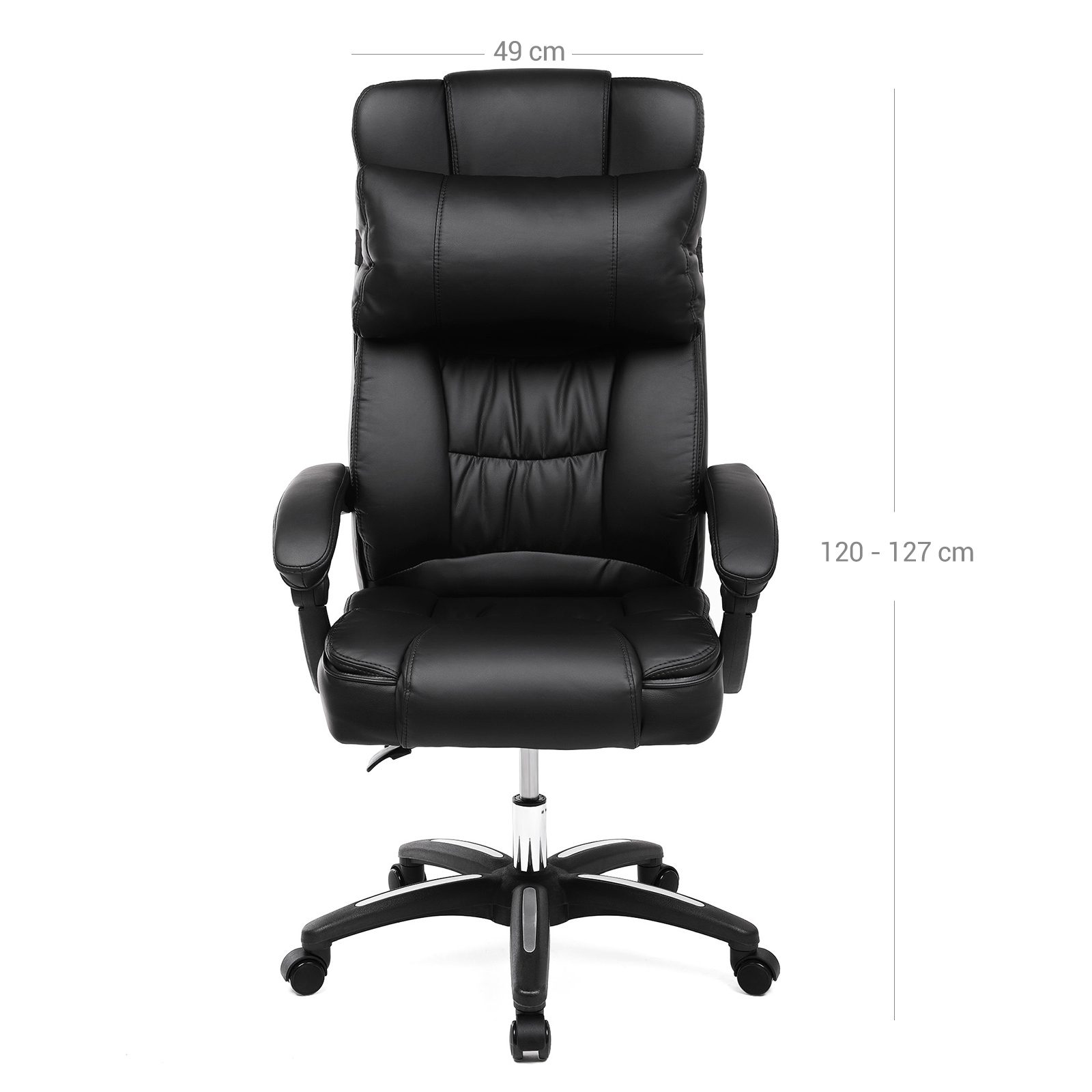 Produktdetaljer: Materiale: – Betr?k: PU – Polstring: h?jdensitets skum – Fodkryds: Nylon – Arml?n: Nylon – Arml?n: PU – Hjul: Nylonkerne med PU-bel?gning M?l: – H?jde (total): 120-127 cm – Bredde (total): 70 cm – Dybde (total): 70 cm – S?deh?jde: 47-55 cm – S?debredde (brugbar): 50 cm – S?dedybde (brugbar): 50 cm – H?jde p? arml?n (fra s?deflade): 22 cm – Rygl?nsh?jde: 75 cm – ? fodkryds: 70 cm – ? ruller: 50 mm – ? stift: 11 mm – Farve: sort – Nettov?gt: 19,7 kg – Bruttov?gt: 23,3 kg – Maks. belastbarhed: 150 kg Leveringsomfang: – 1 x kontorstol – 1 x beslagspose – 1 x vejledning (DE, EN, FR, IT, ES) Bem?rkninger: – Erstatningsruller kan ogs? bestilles separat hos os.