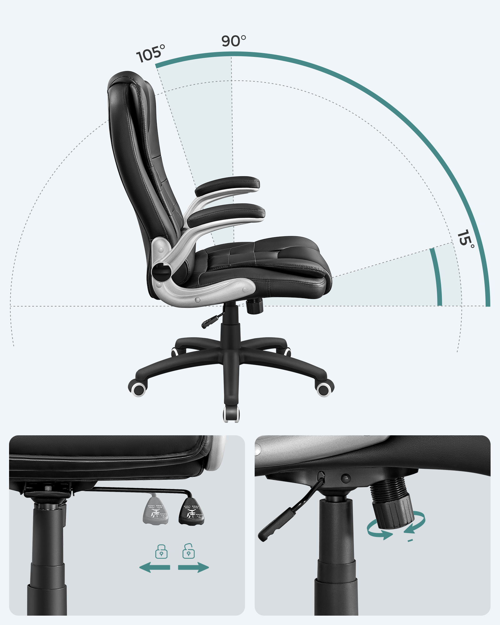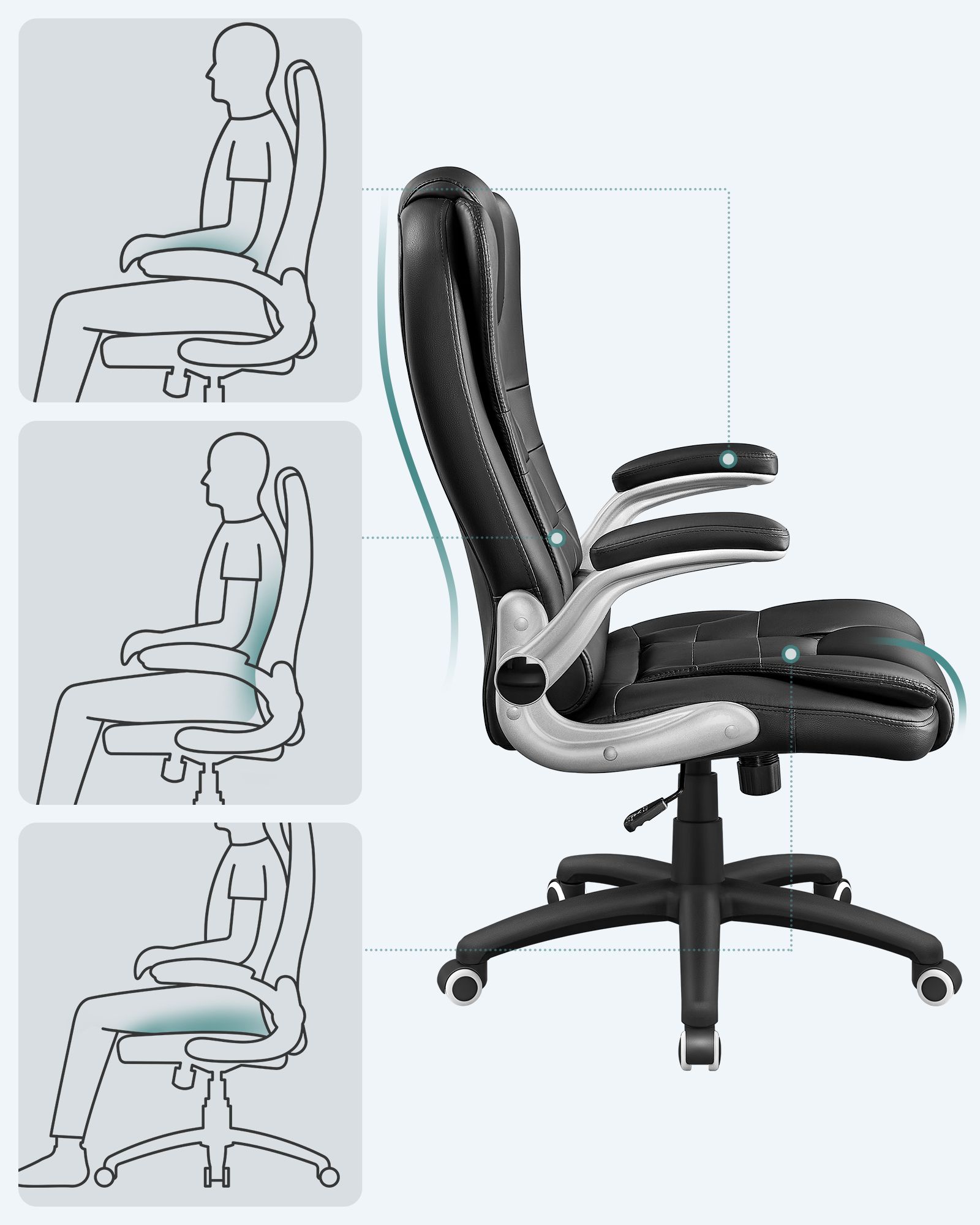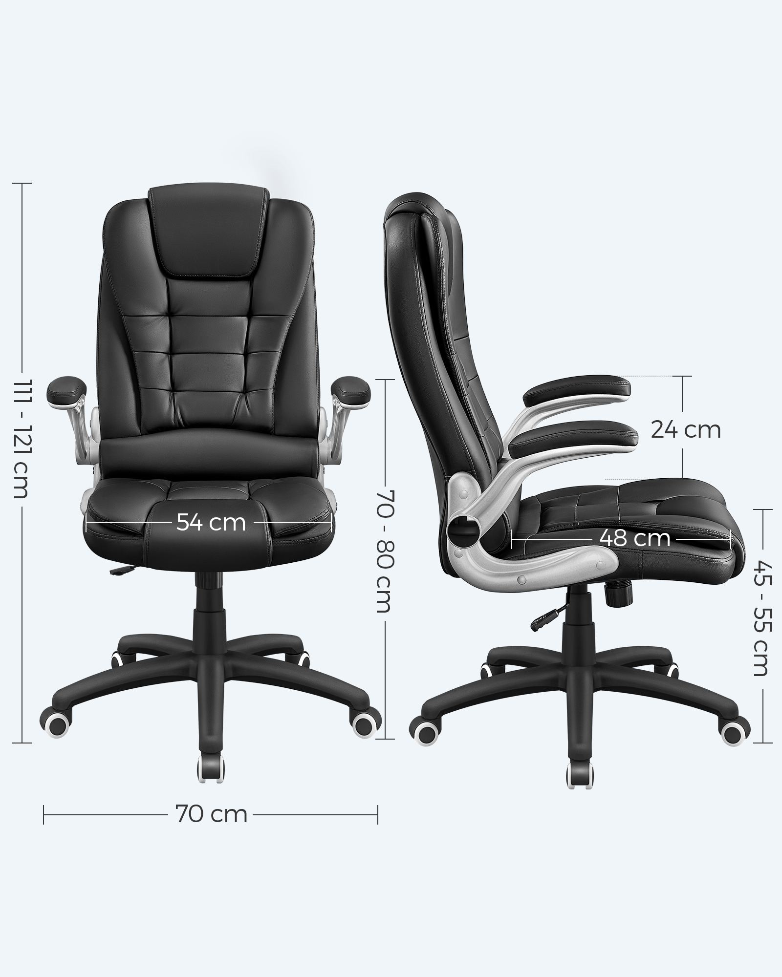 Produktdetaljer: – Total h?jde: 112 – 122 cm – Rygl?nsh?jde: 76 cm – S?deflade: 54 x 51 cm (B x D ) – S?deh?jde: 45 – 55 cm – Materiale: PU + skum + st?l + nylon Leveringsomfang: – 1 x kontorstol – 1 x tilbeh?rspakke – 1 x vejledning (tysk, engelsk, fransk, italiensk, spansk) SONGMICS BEM?RKNINGER: – Bem?rk, at p?skriften “Front” p? s?demekanismen skal vende fremad under montering.
