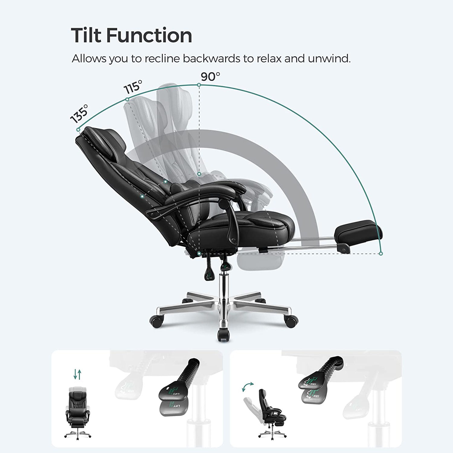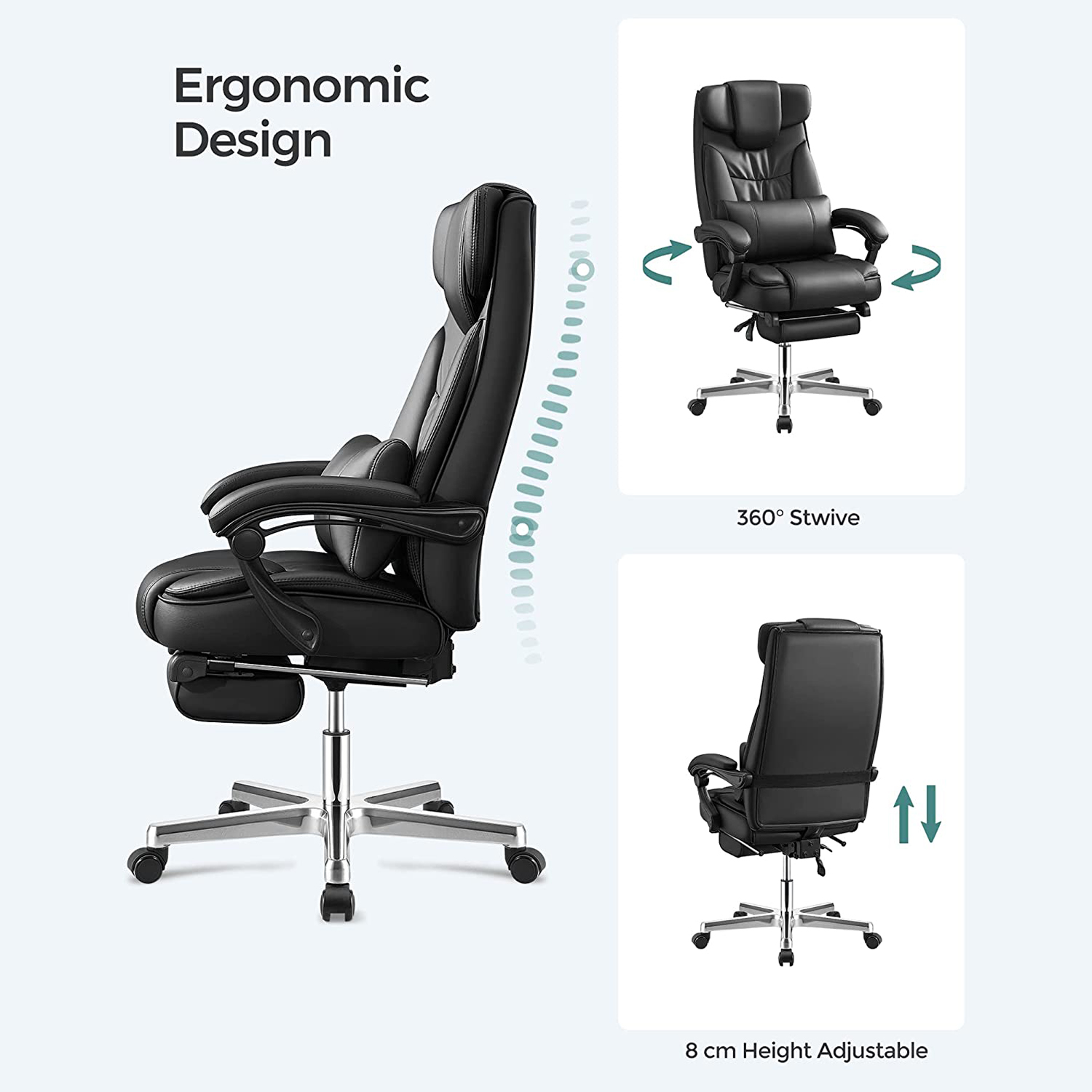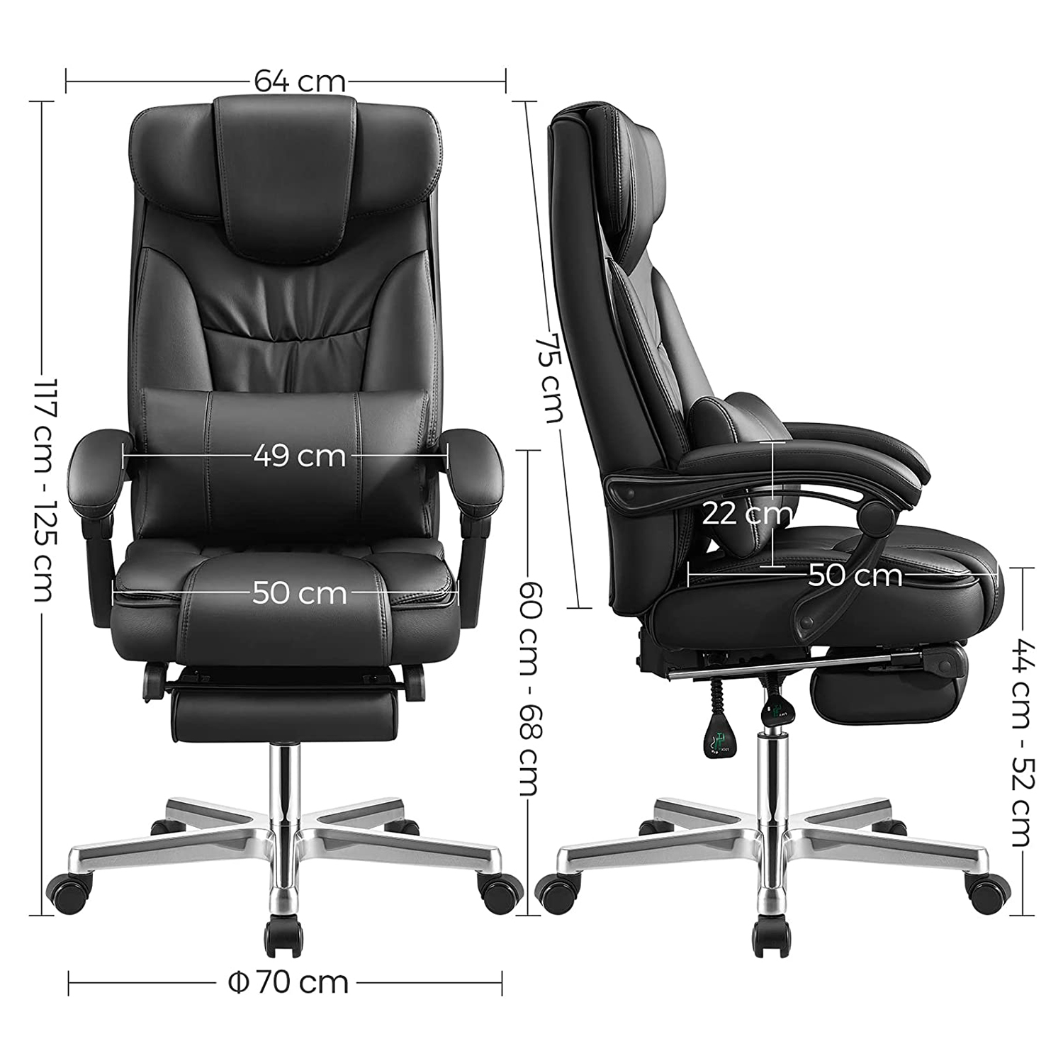 Den foldbare nakkest?tte er udviklet af Songmics. Songmics’ foldbare nakkest?tte, der kan justeres fra 0? til 90?, giver god st?tte til hovedet, n?r du ligger ned. N?r du sidder, kan du folde nakkest?tten ud, s? den smelter sammen med rygl?net og skaber en elegant atmosf?re.- Dobbelt forst?rket polstring sikrer behagelig fornemmelse, god kropsholdning og fremragende siddekomfort. Produktdetaljer: Materiale: – Betr?k: PU – Polstring: h?jdensitets skum – Fodkryds: Aluminium. – Arml?nsskaft: Nylon – Arml?n: PU – Hjul: Nylonkerne med PU-bel?gning M?l: – H?jde (samlet): 118-125 cm – Bredde (samlet): 70 cm – Dybde (samlet): 70 cm – S?deh?jde: 45-52 cm – S?debredde (anvendelig): 50 cm – S?dedybde (anvendelig): 50 cm – H?jde p? arml?n (fra s?deflade): 22 cm – Rygl?nsh?jde: 75 cm – ? fodkryds: 70 cm – ? ruller: 50 mm – ? stift: 11 mm – Farve: sort – Nettov?gt: 24 kg – Bruttov?gt: 26,7 kg – Maks. belastbarhed: 150 kg Leveringsomfang: – 1 x kontorstol – 1 x beslagspose – 1 x vejledning (DE, EN, FR, IT, ES) Bem?rkninger: – Erstatningsruller kan ogs? bestilles separat hos os.