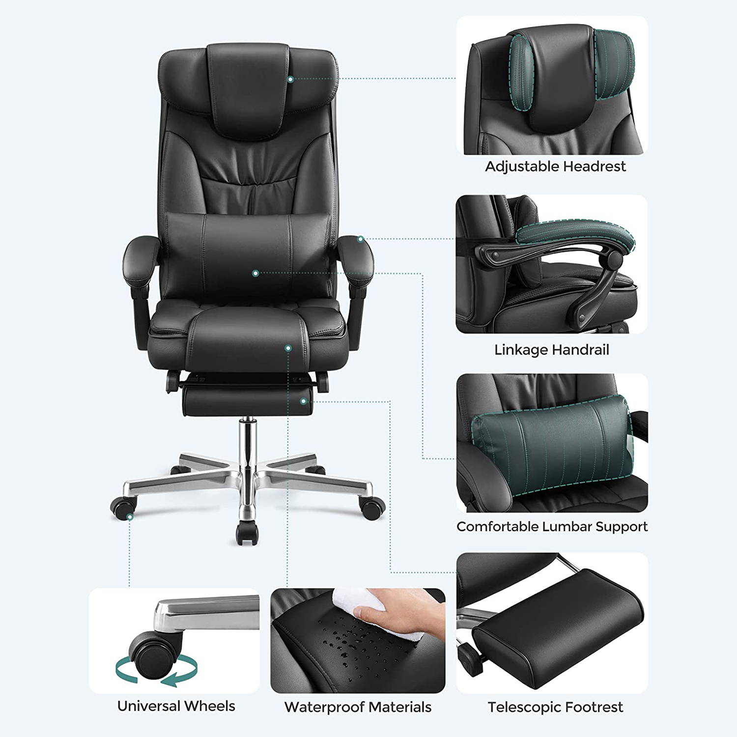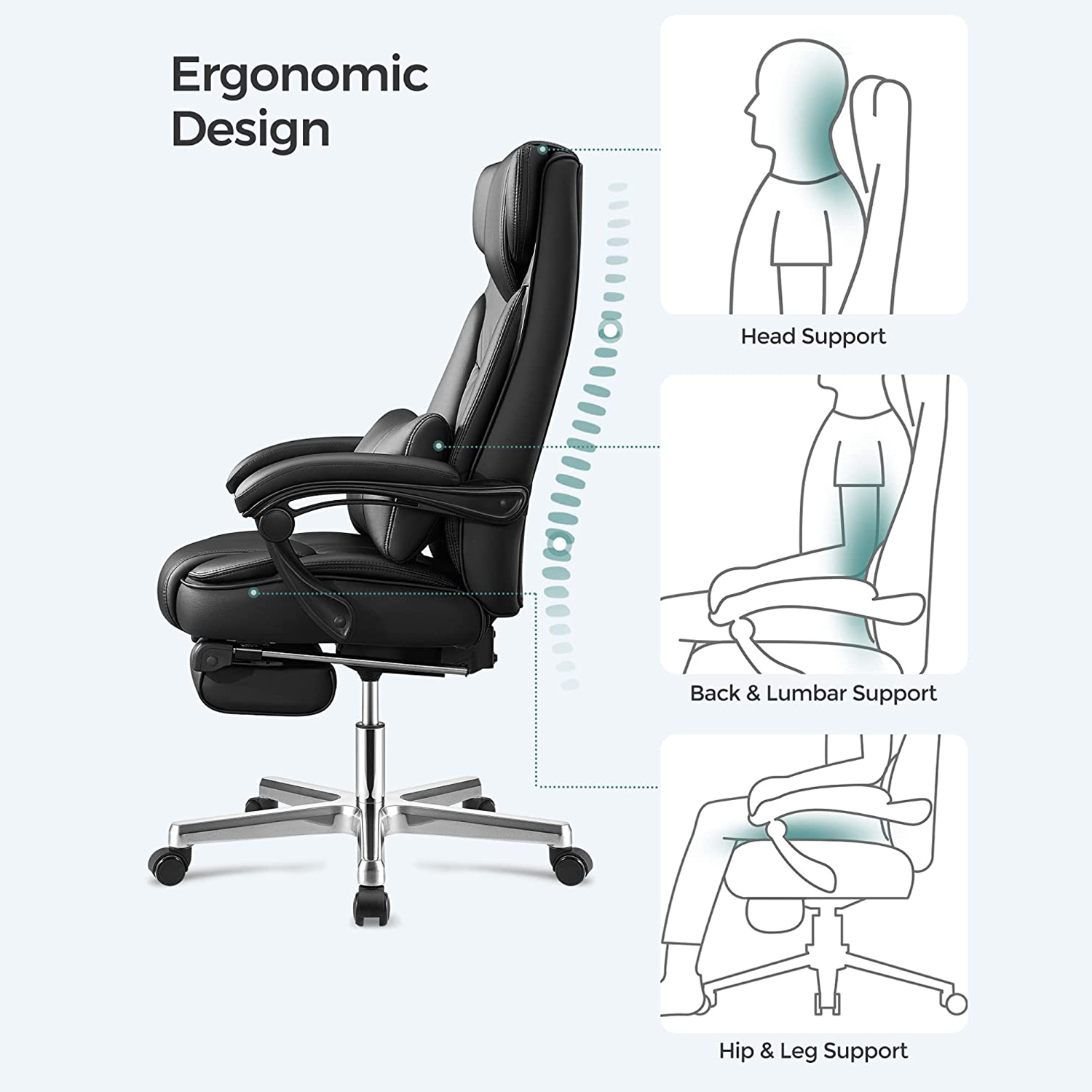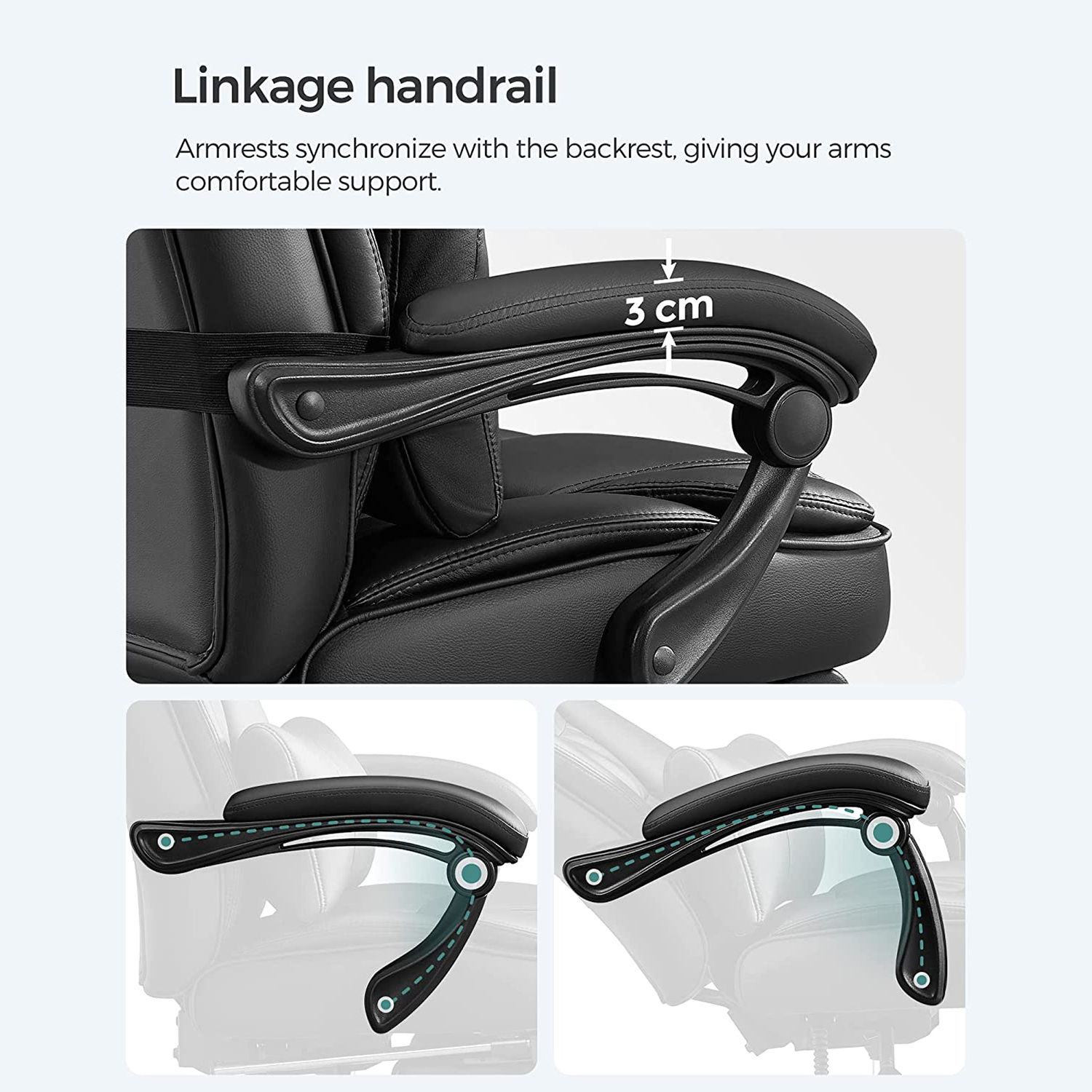 Den foldbare nakkest?tte er udviklet af Songmics. Songmics’ foldbare nakkest?tte, der kan justeres fra 0? til 90?, giver god st?tte til hovedet, n?r du ligger ned. N?r du sidder, kan du folde nakkest?tten ud, s? den smelter sammen med rygl?net og skaber en elegant atmosf?re.- Dobbelt forst?rket polstring sikrer behagelig fornemmelse, god kropsholdning og fremragende siddekomfort. Produktdetaljer: Materiale: – Betr?k: PU – Polstring: h?jdensitets skum – Fodkryds: Aluminium. – Arml?nsskaft: Nylon – Arml?n: PU – Hjul: Nylonkerne med PU-bel?gning M?l: – H?jde (samlet): 118-125 cm – Bredde (samlet): 70 cm – Dybde (samlet): 70 cm – S?deh?jde: 45-52 cm – S?debredde (anvendelig): 50 cm – S?dedybde (anvendelig): 50 cm – H?jde p? arml?n (fra s?deflade): 22 cm – Rygl?nsh?jde: 75 cm – ? fodkryds: 70 cm – ? ruller: 50 mm – ? stift: 11 mm – Farve: sort – Nettov?gt: 24 kg – Bruttov?gt: 26,7 kg – Maks. belastbarhed: 150 kg Leveringsomfang: – 1 x kontorstol – 1 x beslagspose – 1 x vejledning (DE, EN, FR, IT, ES) Bem?rkninger: – Erstatningsruller kan ogs? bestilles separat hos os.