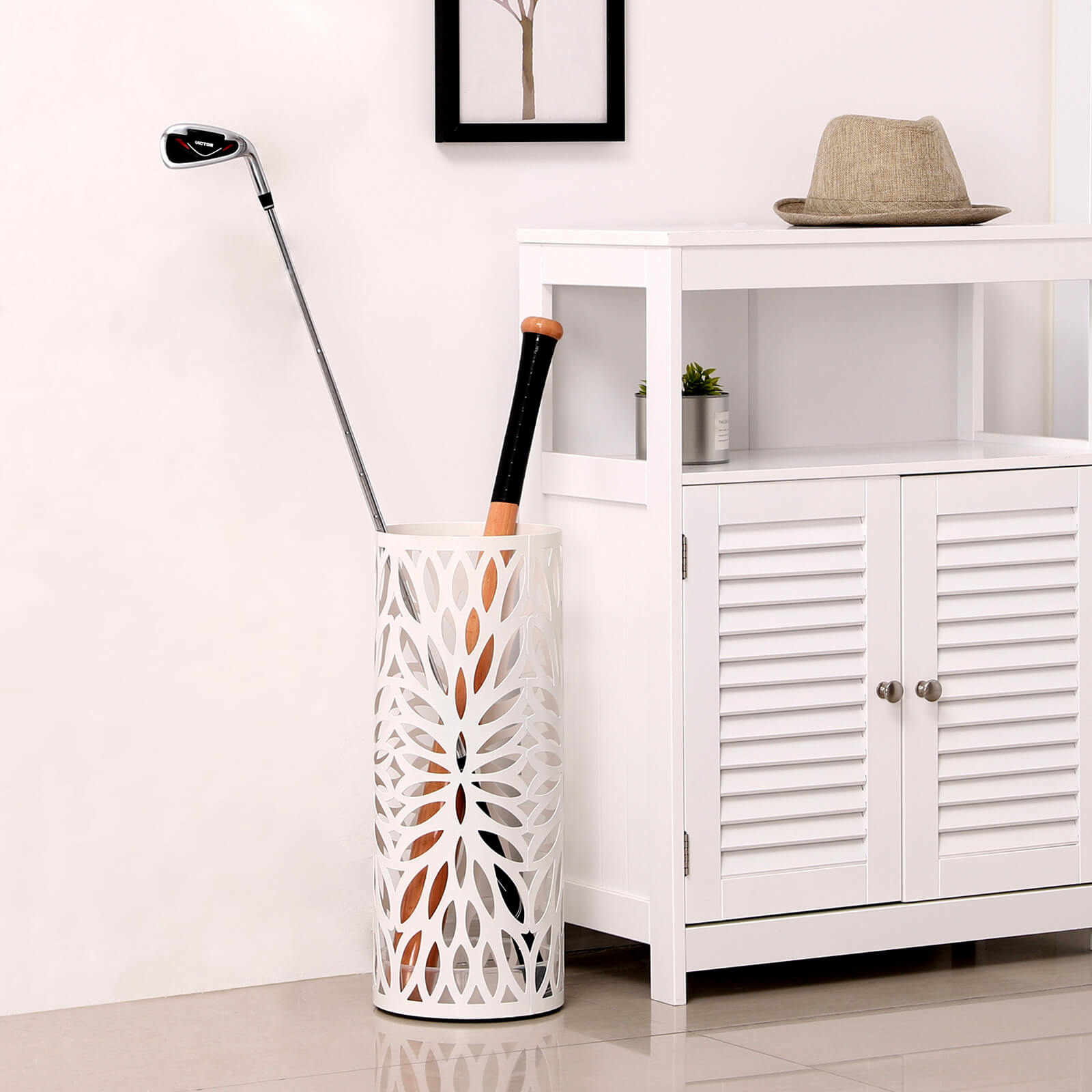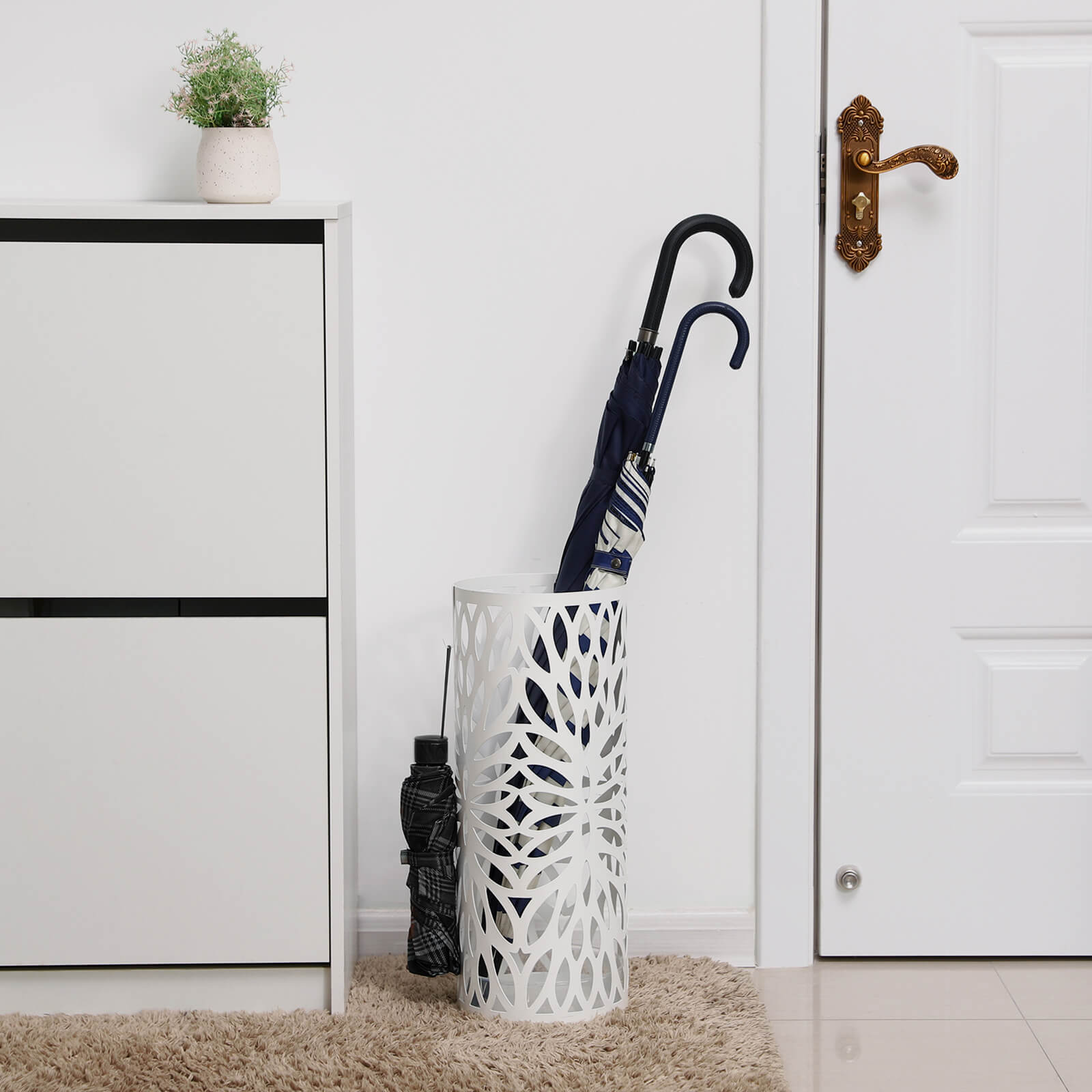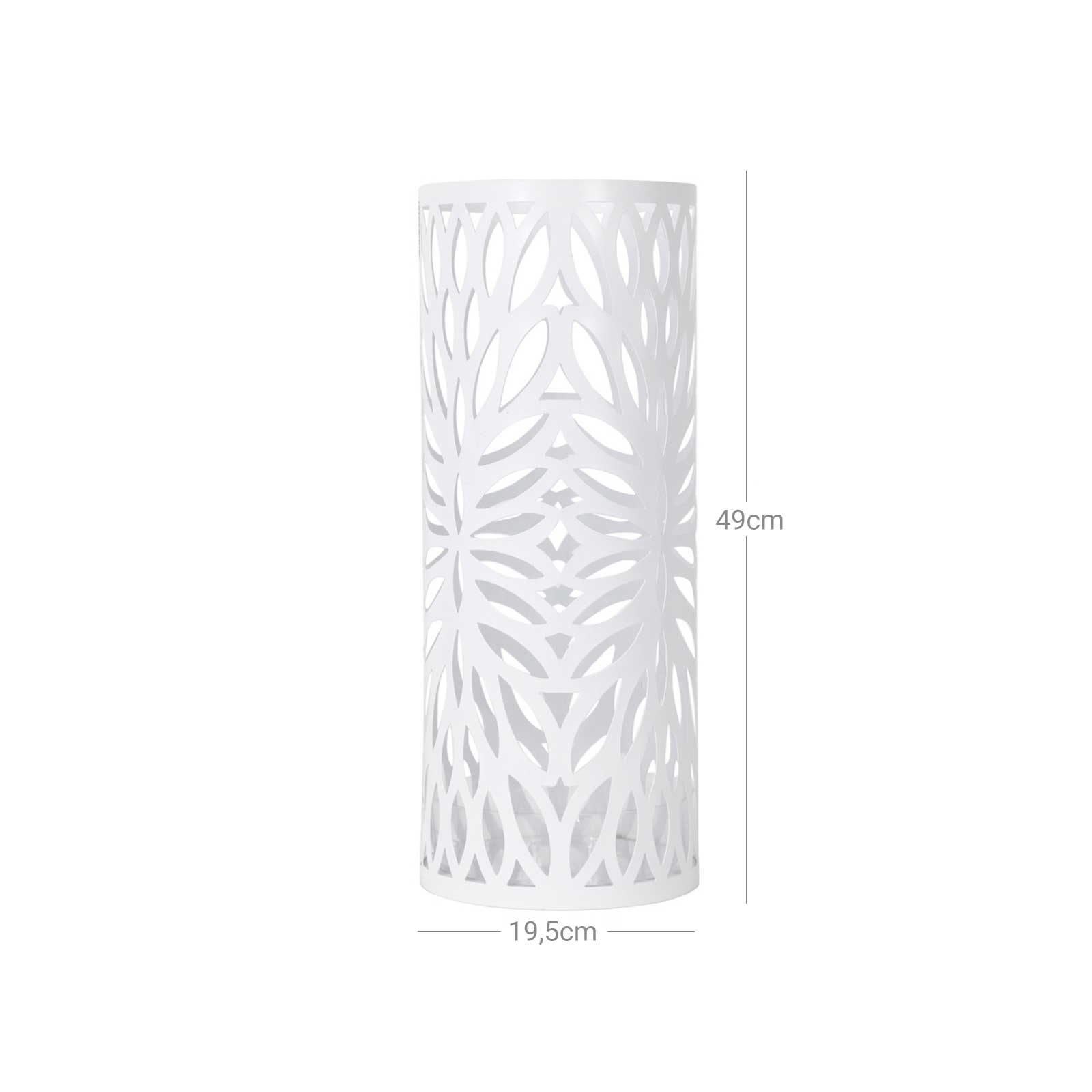 Denne paraplystativ i jern er b?de funktionel og stilfuld. Stativet giver dig ikke kun opbevaringsmuligheder, men dekorerer ogs? dit rum og bliver helt sikkert et blikfang i din entr?/indgang. Hvorfor skal du v?lge Songmics paraplystativ? Songmics er altid kundeorienteret og g?r sit yderste for at tilbyde produkter af h?j kvalitet til en god pris. Vi har en fremragende kundeservice og g?r alt for at l?se dine problemer. Perfekt emballage reducerer transportskader til et minimum. Vi tilbyder paraplystativet i forskellige udf?relser og arbejder l?bende p? at udvikle nye udf?relser. Vi h?ber, du vil vise os din opm?rksomhed. Produktdetaljer: – Materiale: Jernplade – M?l: 19,5 x 19,5 x 49 cm – Farve: Hvid – V?gt: 2 kg Leveringsomfang: – 1 x Paraplystativ – 1 x Vandopsamlingsbakke – 2 x Krog