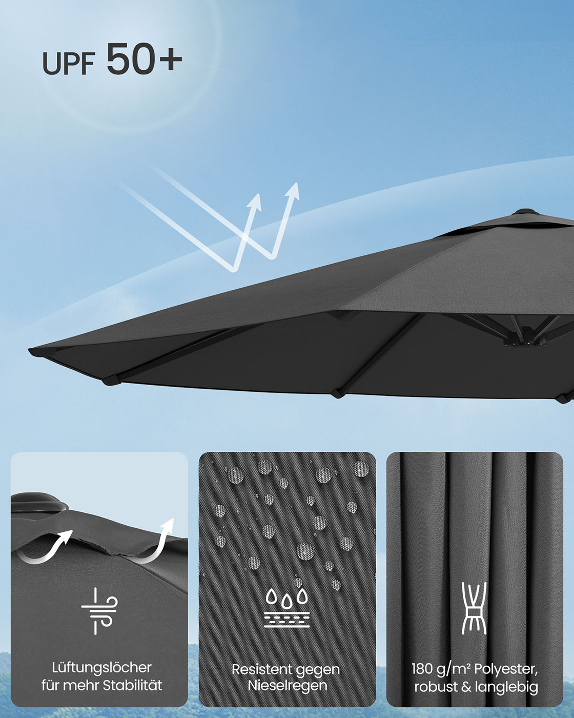 Materiale: Paraplystang og paraplyribber af metal, 180 g/m? polyester