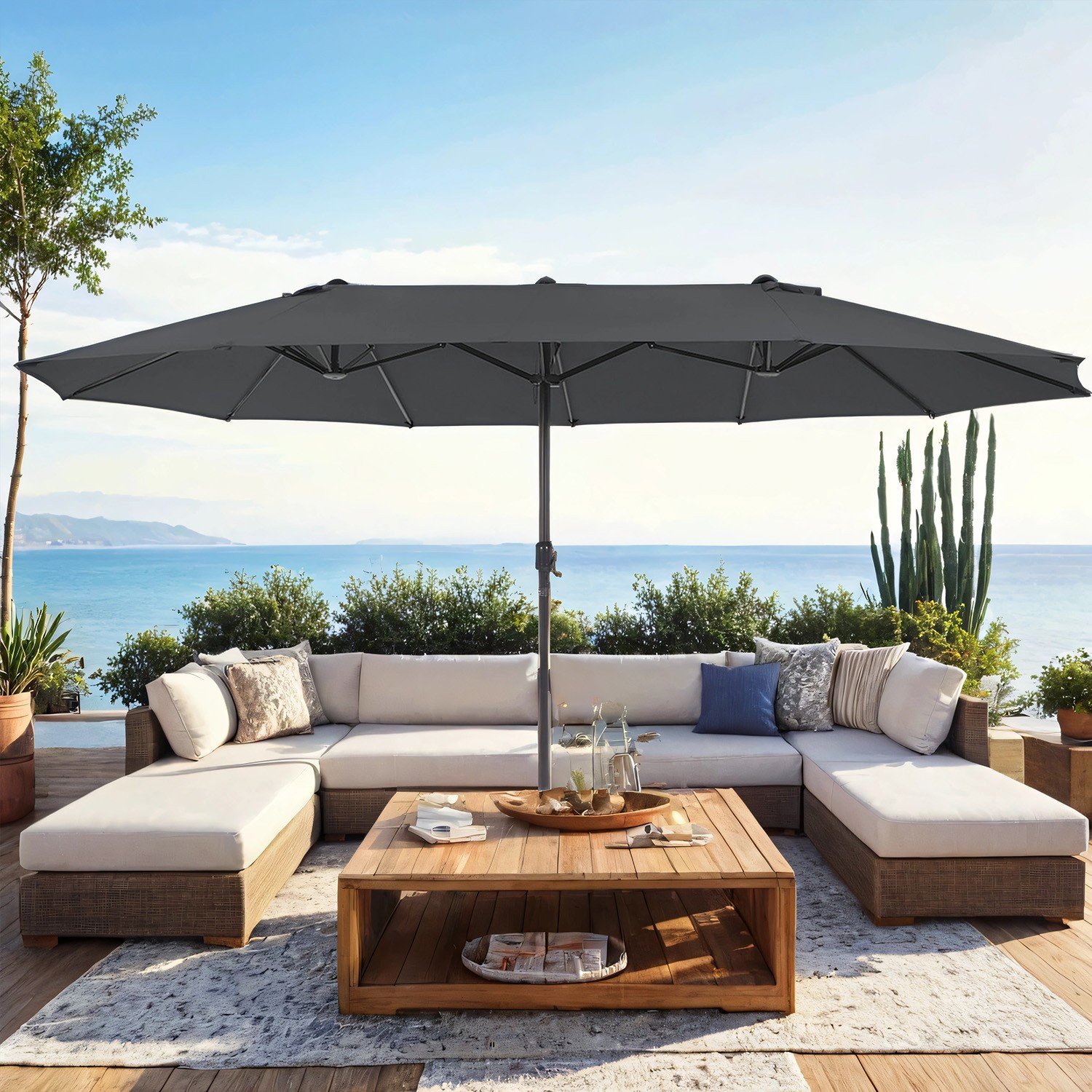 H?jdepunkterne ved denne dobbelte parasol fra SONGMICS: Ekstra stort parasolt?ppe (460 x 270 cm); giver stor skygge UV-beskyttelse op til UPF 50+; optimal beskyttelse mod UV-str?ler Robust parasolstang af ? 48 mm metalst?nger 12 parasolribber af metal; giver parasollen et st?rkt hold Parasolt?ppe af 180 g/m? polyester; lover lang levetid Nem ?bning og lukning af parasollen ved hj?lp af den praktiske h?ndsving Praktisk l?sefjeder; g?r det muligt at forbinde de 2 metalst?nger i parasolstangen nemt med hinanden Intet v?rkt?j n?dvendigt; opstillingen tager kun f? minutterProduktdetaljer:Farve: Gr?Materiale: Parasolstang og parasolribber af metal, 180 g/m? polyesterH?jde: 245 cmSt?rrelse parasoldug: 460 x 270 cm (L x B) ? parasolstang: 48 mm Nettov?gt: 15 kg Leveringsomfang: 1 x parasol 1 x vejledning (DE, EN, FR, ES, IT) SONGMICS Bem?rkninger: Parasolfod medf?lger ikke. Vi anbefaler at bruge en parasolfod, der vejer over 50 kg. ?bn ikke parasollen med magt, men forsigtigt og langsomt. Reng?r parasoldugen med en bl?d klud fugtet med et neutralt reng?ringsmiddel. Opbevar produktet p? et t?rt, godt ventileret sted, men f?rst n?r parasolduken er helt t?r. Luk parasollen p? bl?sende dage for at undg? skader. Hold produktet v?k fra ildkilder; beskyt det desuden mod ekstrem kulde eller varme og andre vejrforhold som f.eks. regn, vind, sne, hagl osv.
