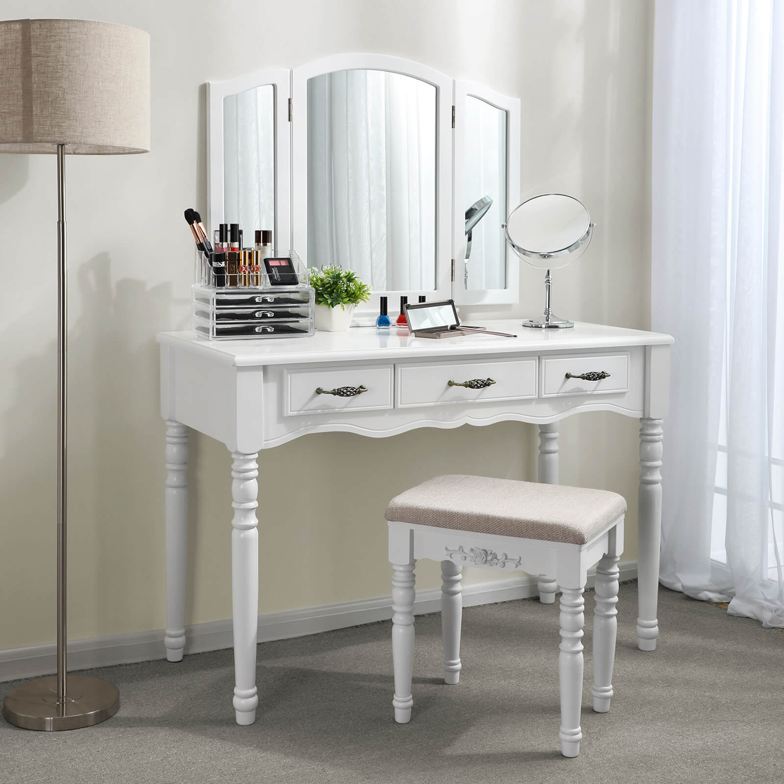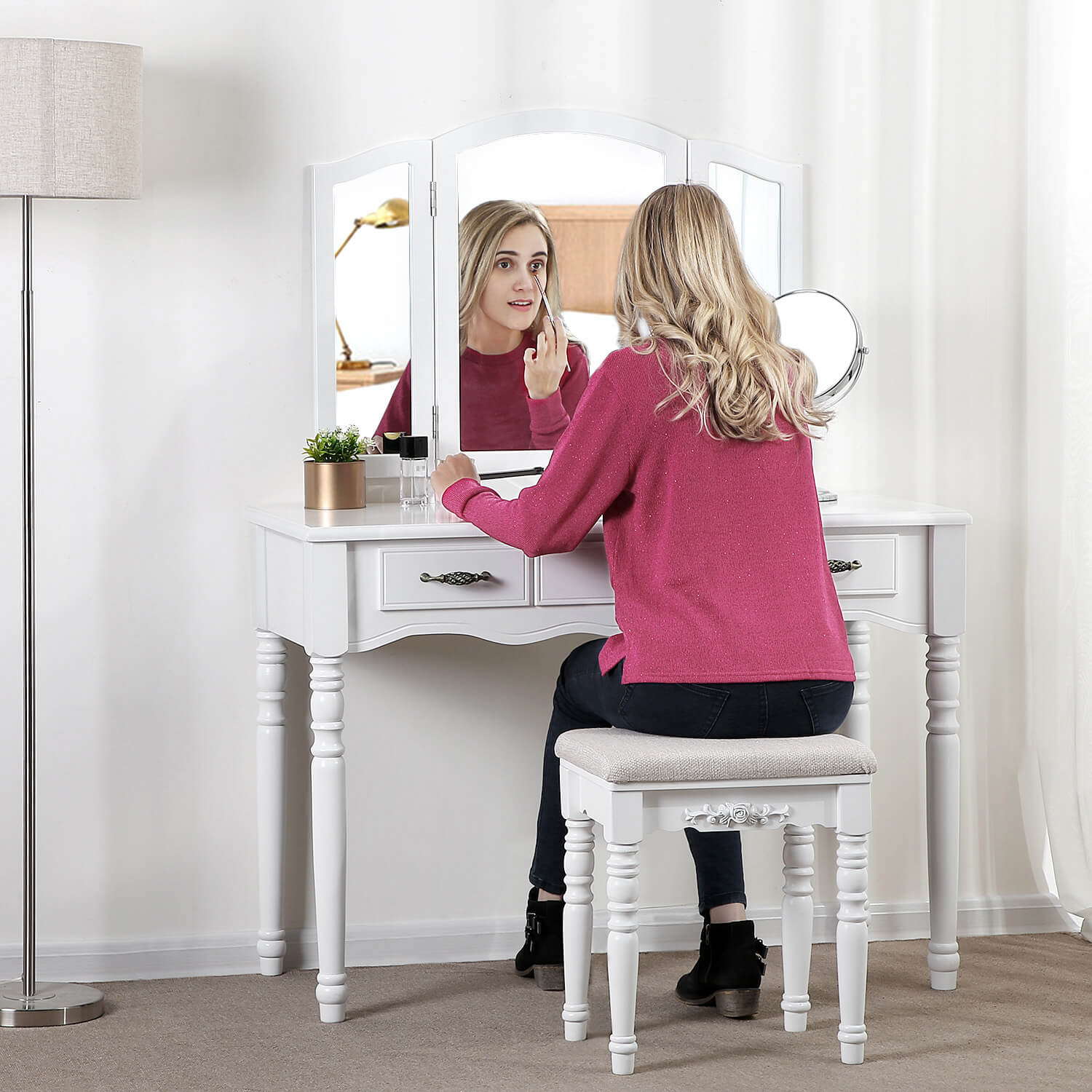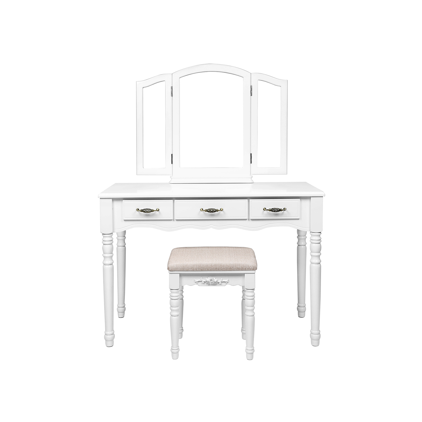 Produktdetaljer: – Farve: hvid – Materiale: MDF-plade, fyrretr? – M?l p? toiletbordet: 108 x 131,5 x 47 cm (B x H x D) – M?l p? toiletbordets skammel: 40,5 x 51 x 30,5 cm (B x H x D) – V?gt: 24,9 kg Leveringsomfang: – 2 x pakker -Pakke 1: 1 x bord, 1x spejls?t (3 dele/sider) og 1 x vejledning (DE, EN, FR, ES, IT) – Pakke 2: 1x skammel Denne vare pakkes i to separate pakker. Hvis du kun modtager ?n pakke, bedes du have lidt t?lmodighed.