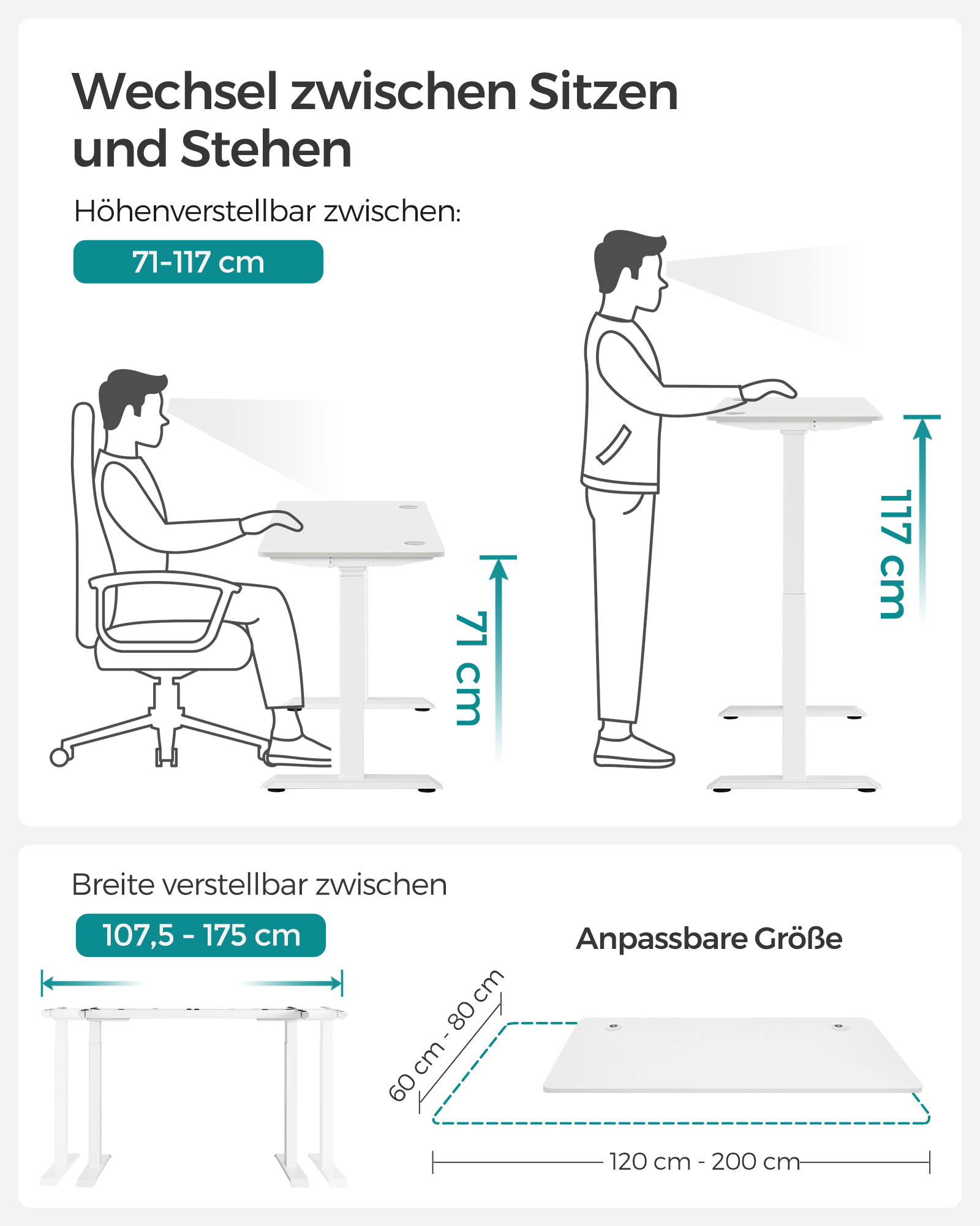 Fordele ved det elektriske skrivebord: H?jdejusterbart fra 71 til 117 cm for skiftende kropsholdninger Hurtig justeringshastighed 32 mm/s med lav st?j < 50 dB Kvalitetsmotor for j?vn justering Produktdetaljer:Farve: Hvid Materiale: Sp?nplade, st?l St?rrelse: 60 x 120 x (71-117) cm (D x B x H) H?jdejustering: 69-115 cm St?jniveau: < 50 dB Justeringshastighed: 32 mm/s Maks. statisk belastning: 120 kg V?gt: 33,4 kg Leveringsomfang: 1 x elektrisk bord 1 x hukommelse til h?jdejusteringer 1 x controller 2 x kroge 4 x ruller 1 x tilbeh?rspakke 1 x vejledning SONGMICS Bem?rkninger: Produktet leveres i 2 pakker. V?r t?lmodig, hvis du kun modtager ?n pakke i f?rste omgang. Den anden pakke leveres kort tid efter. S?rg for, at bordrammen ikke hindres under l?fte- og s?nkeprocessen. Placer ikke bordet direkte op ad en v?g for at undg? ridser p? v?ggen. Produktet er udelukkende beregnet til indend?rs brug. Hold alle elektriske komponenter v?k fra v?sker. Hvis bordet h?ves eller s?nkes i 2 minutter, aktiveres overophedningsbeskyttelsen automatisk, og du skal vente 18 minutter, f?r du kan bruge h?jdejusteringen igen. Opk?rselssikringen beskytter k?ledyr og b?rn mod st?d og ridser. Indstil f?lsomhedsniveauet efter behov i henhold til vejledningen. Placer ikke tunge genstande, der overstiger den maksimale belastning p? 120 kg, p? produktet. S?rg for, at controlleren er vandret, inden du tester h?jdejusteringen. Hold den ikke i h?nden under testen.