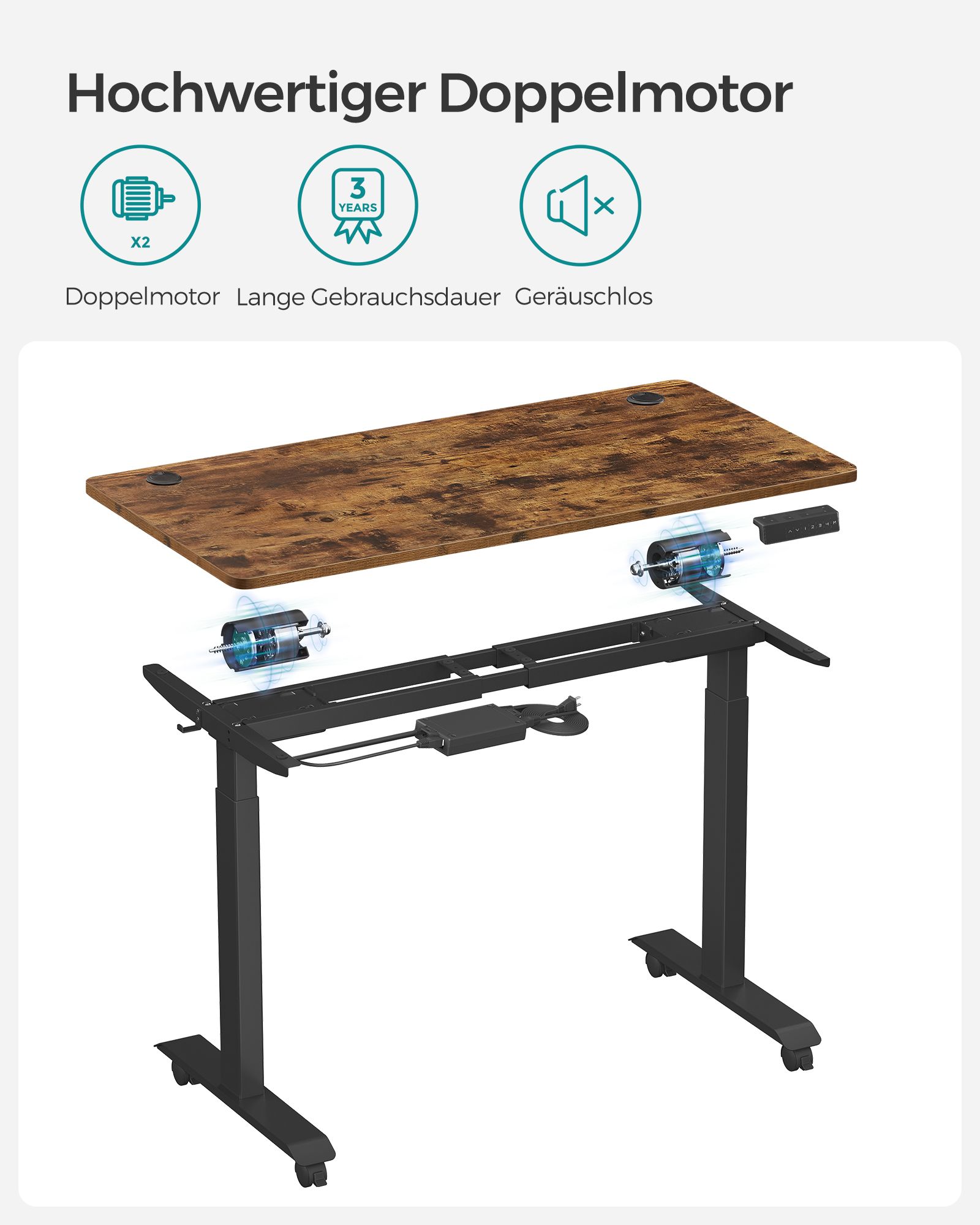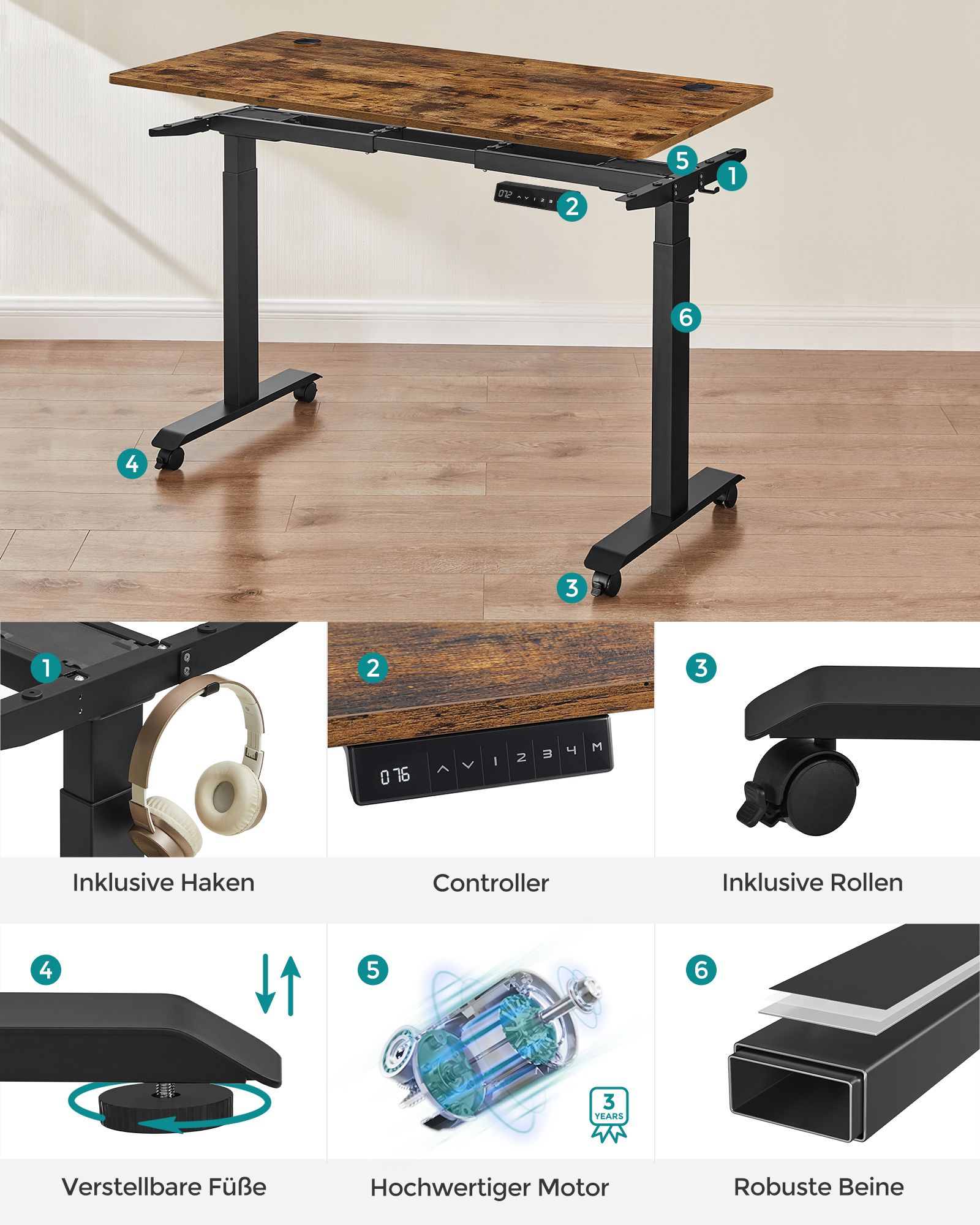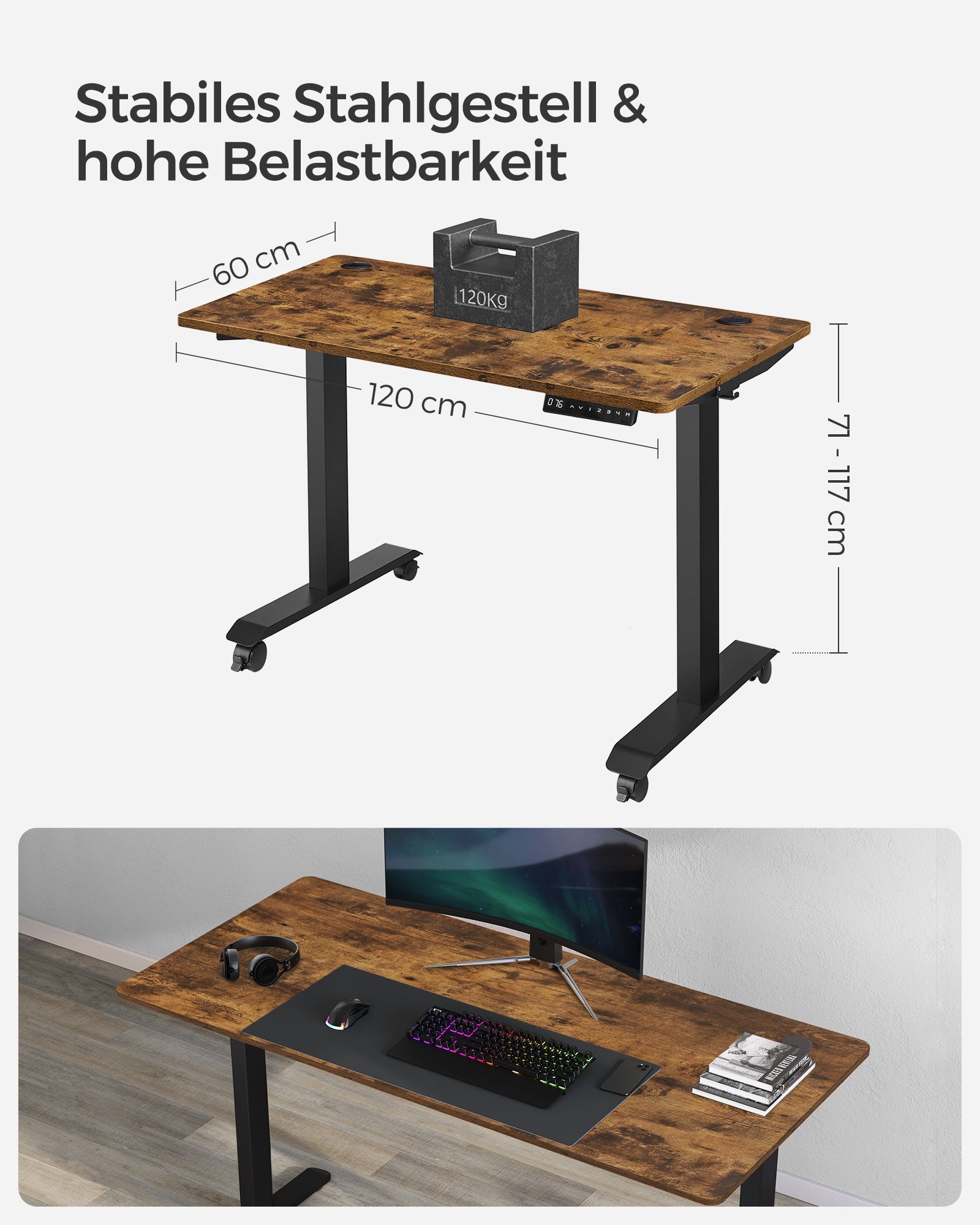 Fordele ved det elektriske skrivebord: H?jdejusterbart fra 71 til 117 cm for skiftende kropsholdninger Hurtig justeringshastighed 32 mm/s med lav st?j < 50 dBKvalitetsmotor for j?vn indstillingProduktdetaljer:Farve: VintagebrunSortMateriale: Sp?nplade, st?lSt?rrelse: 60 x 120 x (71-117) cm (D x B x H)H?jdejustering: 69-115 cmSt?jniveau: < 50 dB Justeringshastighed: 32 mm/s Maks. statisk belastning: 120 kg V?gt: 33,4 kg Leveringsomfang: 1 x elektrisk bord 1 x hukommelse til h?jdejusteringer 1 x controller 2 x kroge 4 x ruller 1 x tilbeh?rspakke 1 x vejledning SONGMICS Bem?rkninger: Produktet leveres i 2 pakker. V?r t?lmodig, hvis du kun modtager ?n pakke i f?rste omgang. Den anden pakke leveres kort tid efter. S?rg for, at bordrammen ikke hindres under l?fte- og s?nkeprocessen. Placer ikke bordet direkte op ad en v?g for at undg? ridser p? v?ggen. Produktet er udelukkende beregnet til indend?rs brug. Hold alle elektriske komponenter v?k fra v?sker. Hvis bordet h?ves eller s?nkes i 2 minutter, aktiveres overophedningsbeskyttelsen automatisk, og du skal vente 18 minutter, f?r du kan bruge h?jdejusteringen igen. Opk?rselssikringen beskytter k?ledyr og b?rn mod st?d og ridser. Indstil f?lsomhedsniveauet efter behov i henhold til vejledningen. Placer ikke tunge genstande, der overstiger den maksimale belastning p? 120 kg, p? produktet. S?rg for, at controlleren er vandret, inden du tester h?jdejusteringen. Hold den ikke i h?nden under testen.