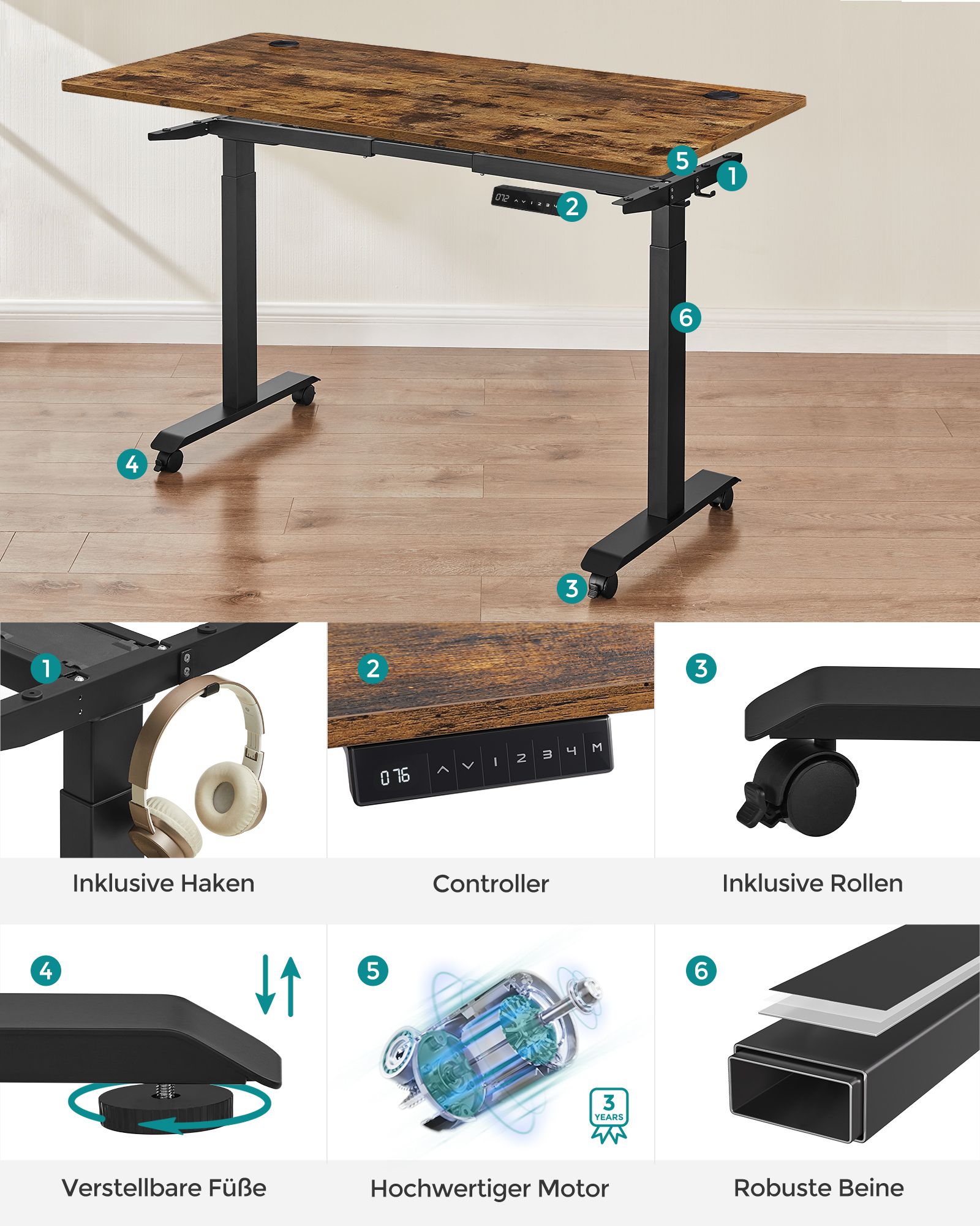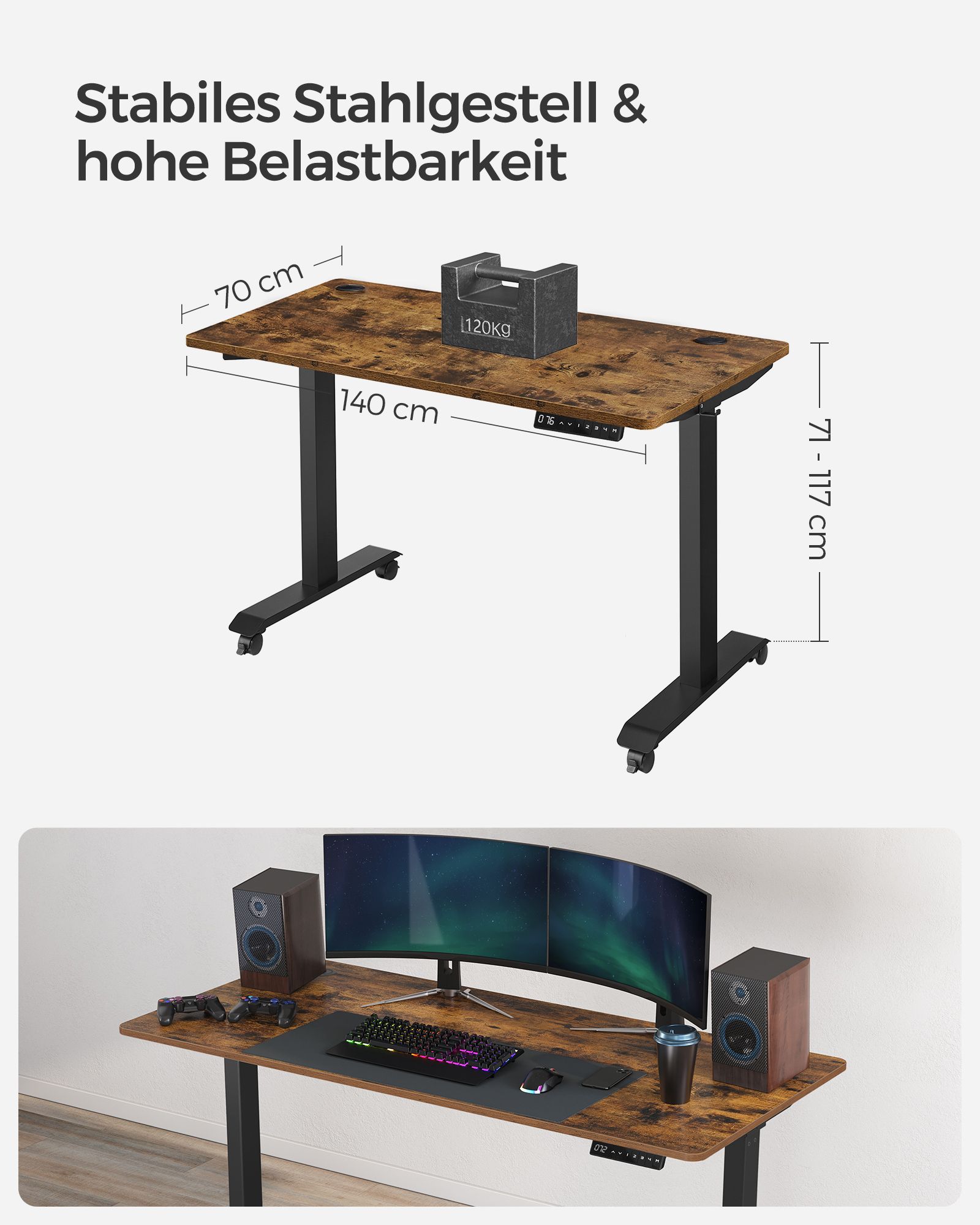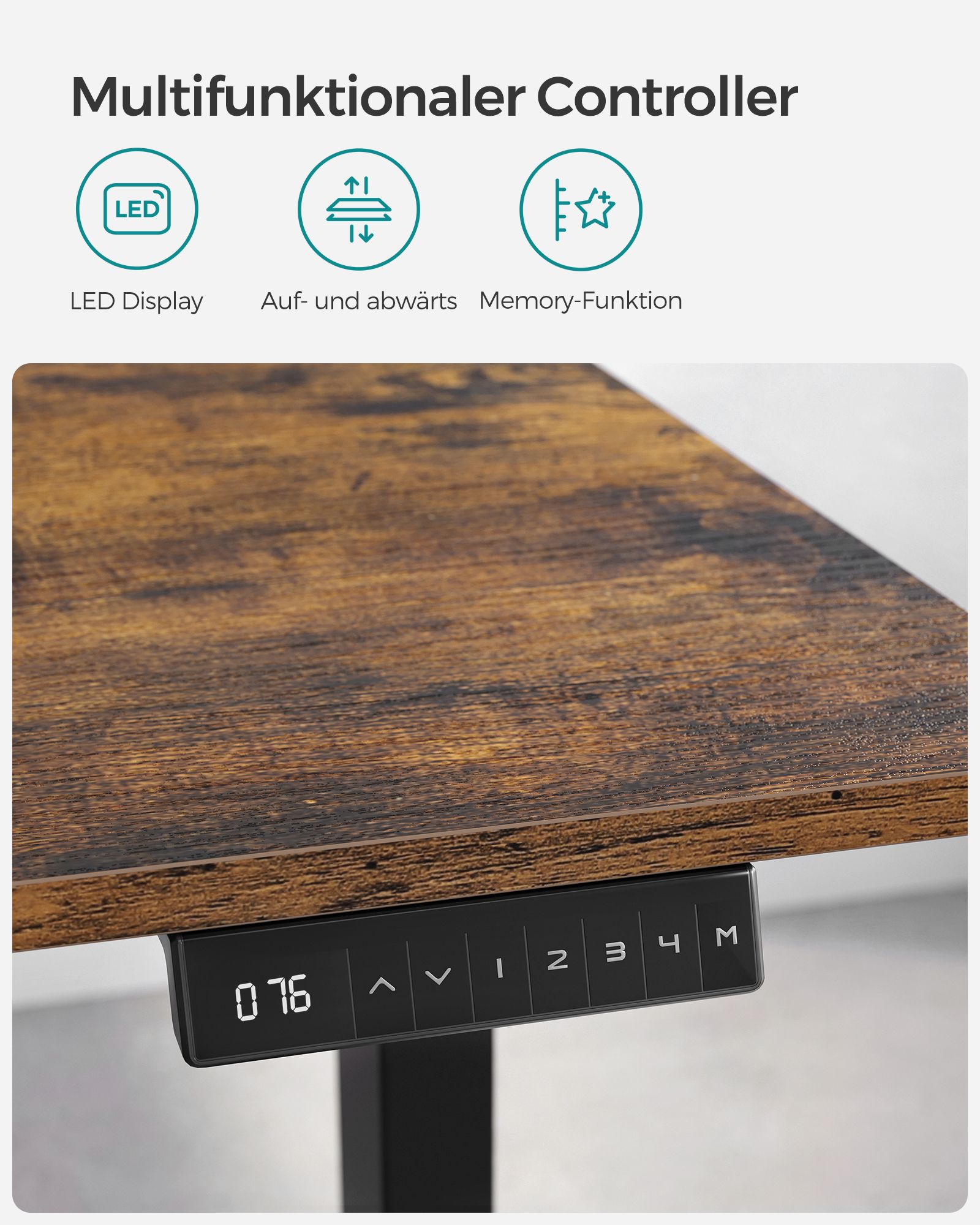 Fordele ved det elektriske skrivebord: H?jdejusterbart fra 71 til 117 cm for skiftende kropsholdninger Hurtig justeringshastighed 32 mm/s med lav st?j < 50 dB Kvalitetsmotor for j?vn justering Produktdetaljer:Farve: Vintagebrun-sort Materiale: Sp?nplade, st?l St?rrelse: 70 x 140 x (71-117) cm (D x B x H) H?jdejustering: 69-115 cm St?jniveau: < 50 dB Justeringshastighed: 32 mm/s Maks. statisk belastning: 120 kg V?gt: 35,8 kg Leveringsomfang: 1 x elektrisk bord 1 x hukommelse til h?jdejusteringer 1 x controller 2 x kroge 4 x ruller 1 x tilbeh?rspakke 1 x vejledning SONGMICS Bem?rkninger: Produktet leveres i 2 pakker. V?r t?lmodig, hvis du kun modtager ?n pakke i f?rste omgang. Den anden pakke leveres kort tid efter. S?rg for, at bordrammen ikke hindres under l?fte- og s?nkeprocessen. Placer ikke bordet direkte op ad en v?g for at undg? ridser p? v?ggen. Produktet er udelukkende beregnet til indend?rs brug. Hold alle elektriske komponenter v?k fra v?sker. Hvis bordet h?ves eller s?nkes i 2 minutter, aktiveres overophedningsbeskyttelsen automatisk, og du skal vente 18 minutter, f?r du kan bruge h?jdejusteringen igen. Opk?rselssikringen beskytter k?ledyr og b?rn mod st?d og ridser. Indstil f?lsomhedsniveauet efter behov i henhold til vejledningen. Placer ikke tunge genstande, der overstiger den maksimale belastning p? 120 kg, p? produktet. S?rg for, at controlleren er vandret, inden du tester h?jdejusteringen. Hold den ikke i h?nden under testen.