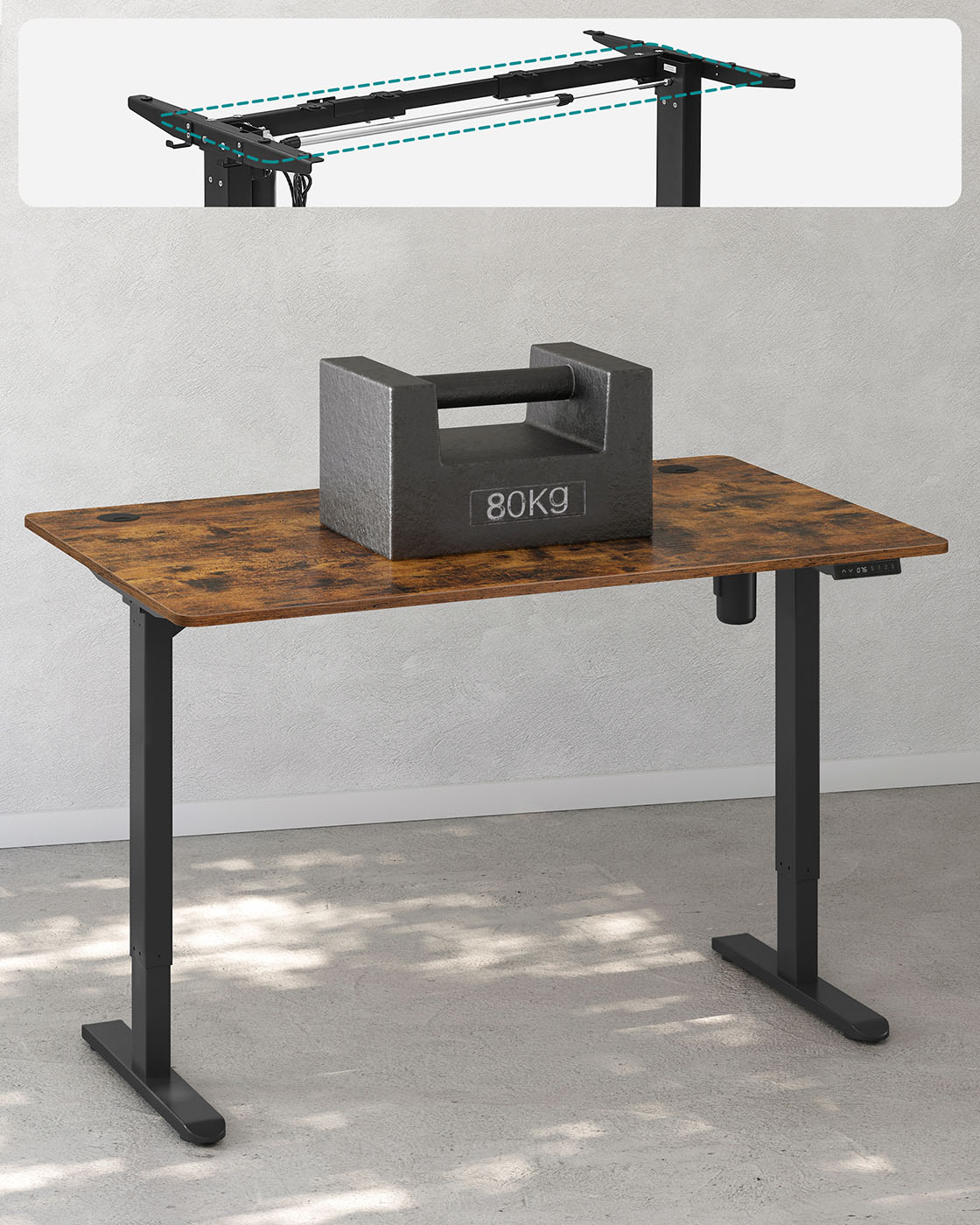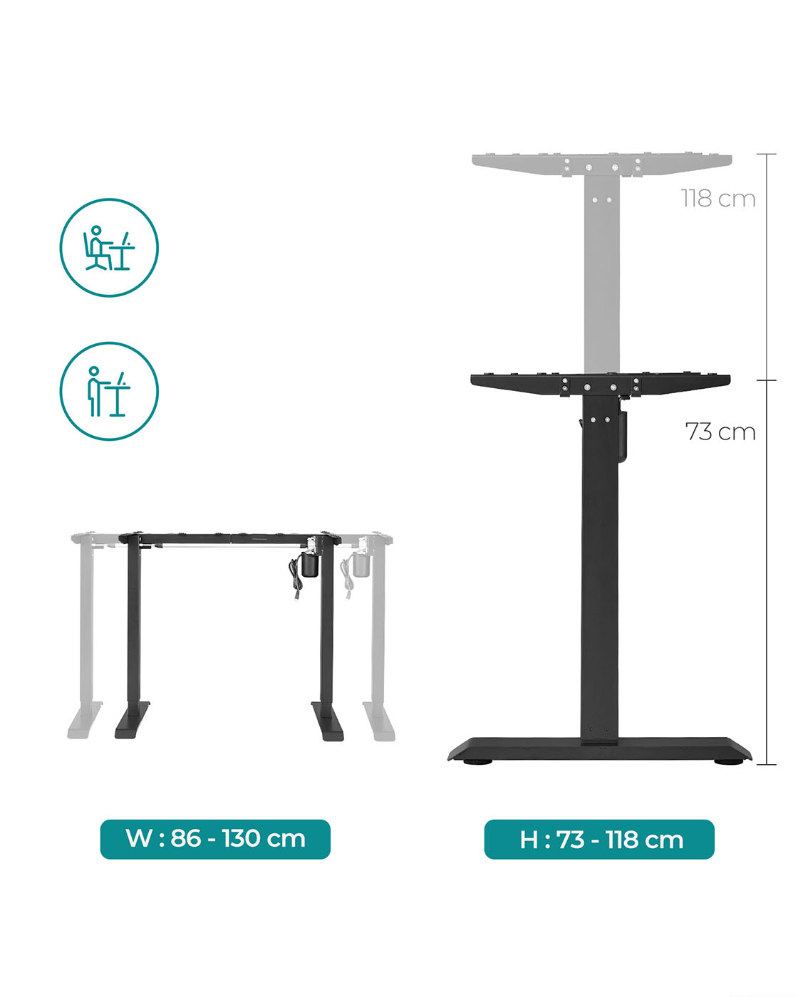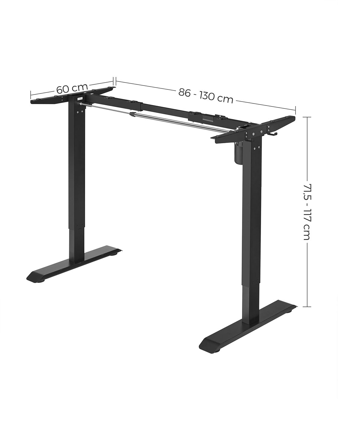 Dette elektriske bord er h?jdejusterbart, s? det passer til alle familiemedlemmer og kan bruges af b?de b?rn og voksne. Hvis du ikke ?nsker at sidde hele tiden, giver dette bord dig mulighed for at arbejde st?ende, hvilket aflaster rygs?jlen og forbr?nder flere kalorier. Ideel til alle, der skal sidde l?nge ved skrivebordet p? kontoret eller i arbejdsv?relset. Yderligere fordele ved dette elektriske bordstativ: H?jdejusterbart fra 73 til 118 cm for skiftende kropsholdninger Hurtig justeringshastighed 25 mm/s med lav st?j < 50 dB Kvalitetsmotor for j?vn justering Produktdetaljer:Farve: Sort Materiale: St?l St?rrelse: 60 x (86-135) x (73-118) cm (D x B x H) H?jdejustering: 73-118 cm St?jniveau: < 50 dB Justeringshastighed: 25 mm/s Maks. statisk belastning: 80 kg V?gt: 22,3 kg Leveringsomfang: 1 x elektrisk skrivebordsstativ 1 x adapter 1 x controller 2 x kroge 4 x ruller 1 x tilbeh?rspakke 1 x vejledning SONGMICS Bem?rkninger:S?rg for, at bordrammen ikke hindres under l?fte- og s?nkeprocessen. Placer ikke bordet direkte op ad en v?g. Dette produkt er udelukkende beregnet til indend?rs brug. Hold alle elektriske komponenter v?k fra v?sker. Brug kun produktet i maksimalt 2 minutter ad gangen. Efter denne periode b?r bordrammen ikke bev?ges i 18 minutter for at undg? beskadigelse af motoren. Placer ikke genstande med en h?jde p? over 50 cm under bordet for at undg? beskadigelse under s?nkningen.