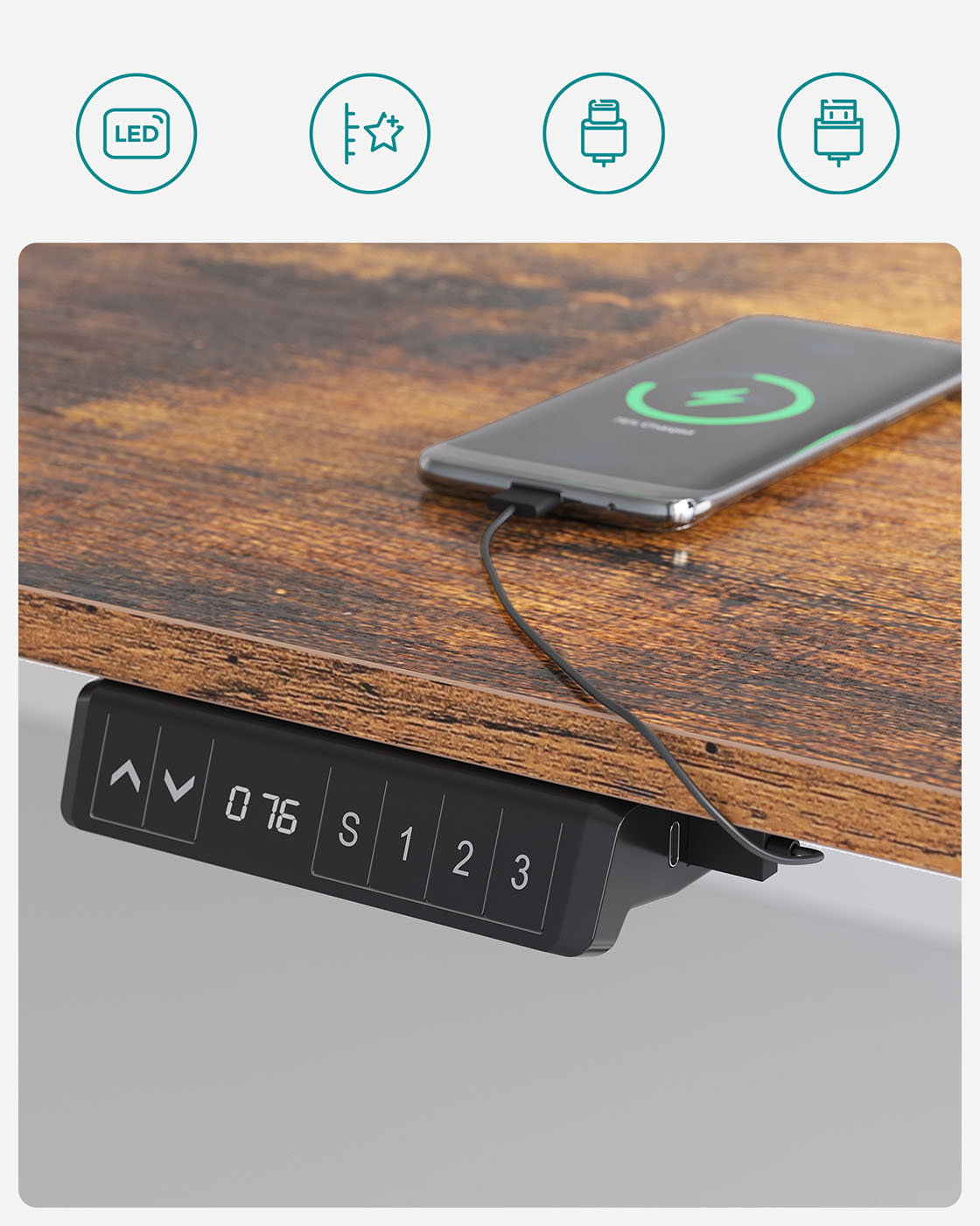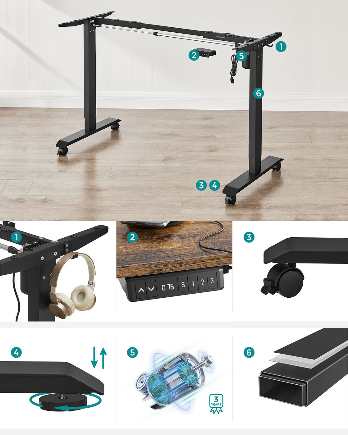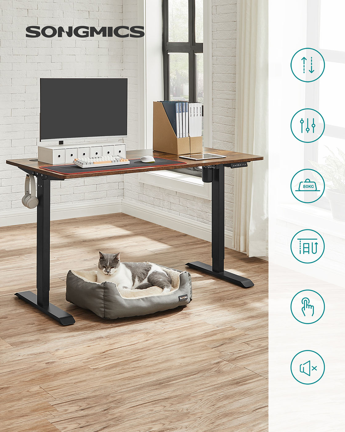 Dette elektriske bord er h?jdejusterbart, s? det passer til alle familiemedlemmer og kan bruges af b?de b?rn og voksne. Hvis du ikke ?nsker at sidde hele tiden, giver dette bord dig mulighed for at arbejde st?ende, hvilket aflaster rygs?jlen og forbr?nder flere kalorier. Ideel til alle, der skal sidde l?nge ved skrivebordet p? kontoret eller i arbejdsv?relset. Yderligere fordele ved dette elektriske bordstativ: H?jdejusterbart fra 73 til 118 cm for skiftende kropsholdninger Hurtig justeringshastighed 25 mm/s med lav st?j < 50 dB Kvalitetsmotor for j?vn justering Produktdetaljer:Farve: Sort Materiale: St?l St?rrelse: 60 x (86-135) x (73-118) cm (D x B x H) H?jdejustering: 73-118 cm St?jniveau: < 50 dB Justeringshastighed: 25 mm/s Maks. statisk belastning: 80 kg V?gt: 22,3 kg Leveringsomfang: 1 x elektrisk skrivebordsstativ 1 x adapter 1 x controller 2 x kroge 4 x ruller 1 x tilbeh?rspakke 1 x vejledning SONGMICS Bem?rkninger:S?rg for, at bordrammen ikke hindres under l?fte- og s?nkeprocessen. Placer ikke bordet direkte op ad en v?g. Dette produkt er udelukkende beregnet til indend?rs brug. Hold alle elektriske komponenter v?k fra v?sker. Brug kun produktet i maksimalt 2 minutter ad gangen. Efter denne periode b?r bordrammen ikke bev?ges i 18 minutter for at undg? beskadigelse af motoren. Placer ikke genstande med en h?jde p? over 50 cm under bordet for at undg? beskadigelse under s?nkningen.