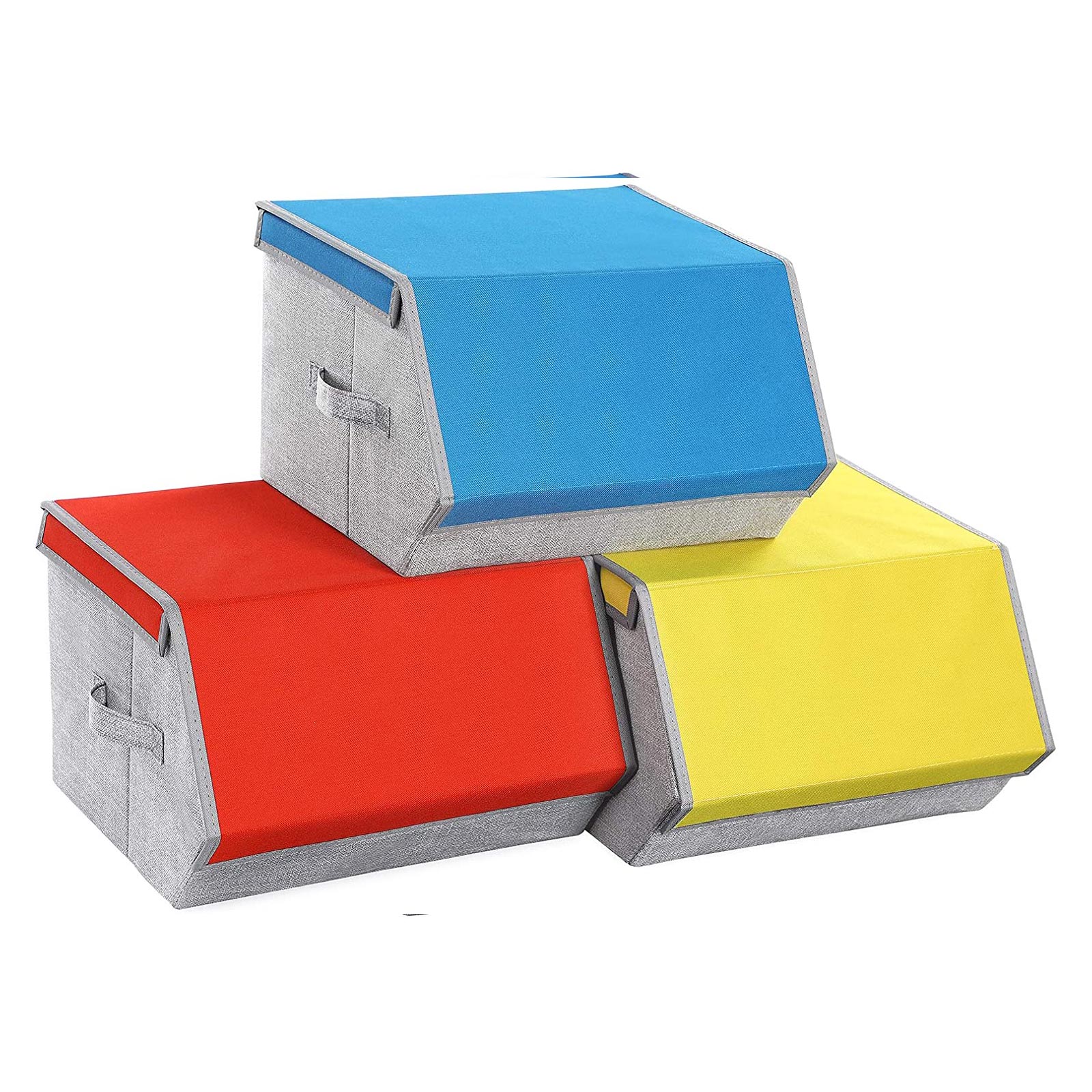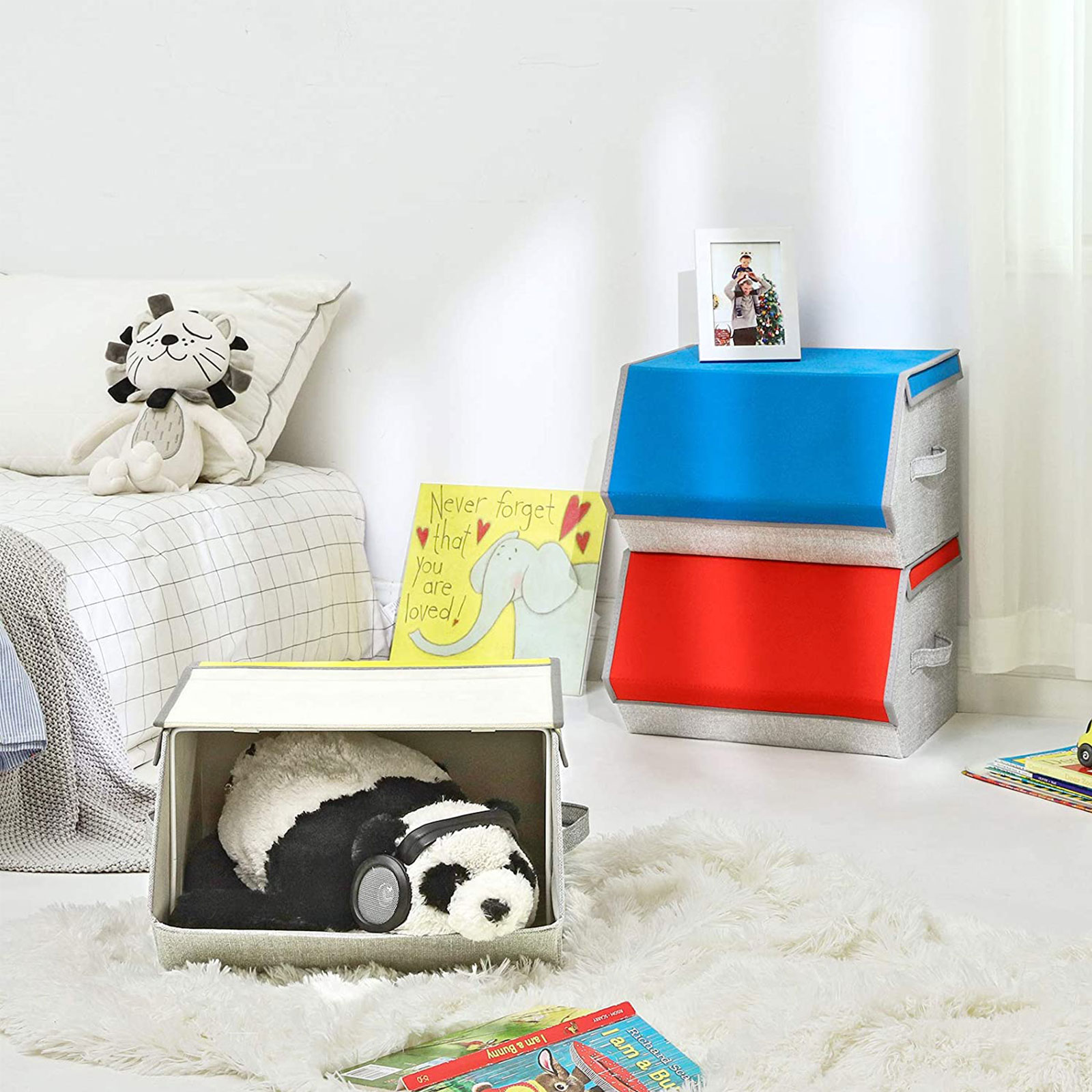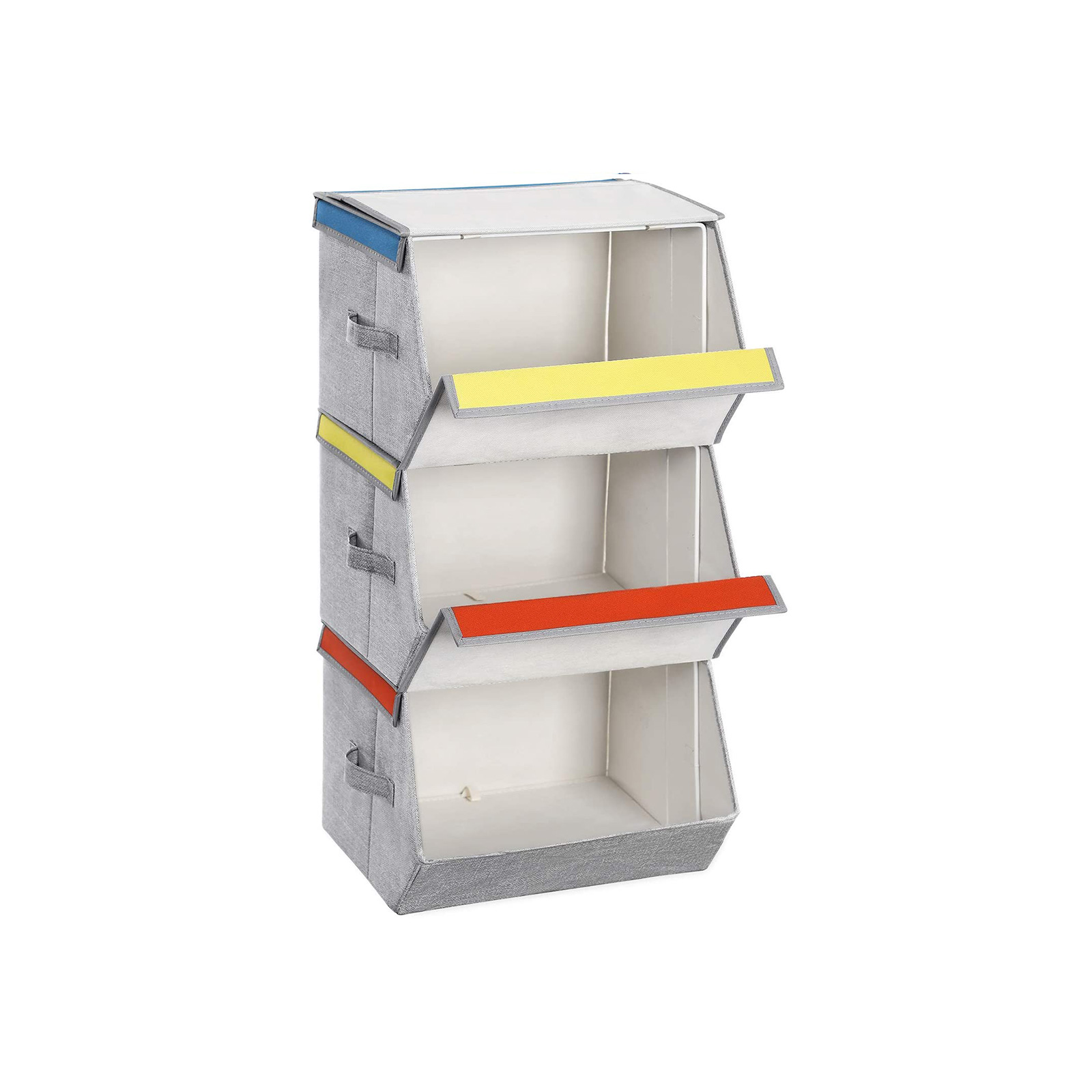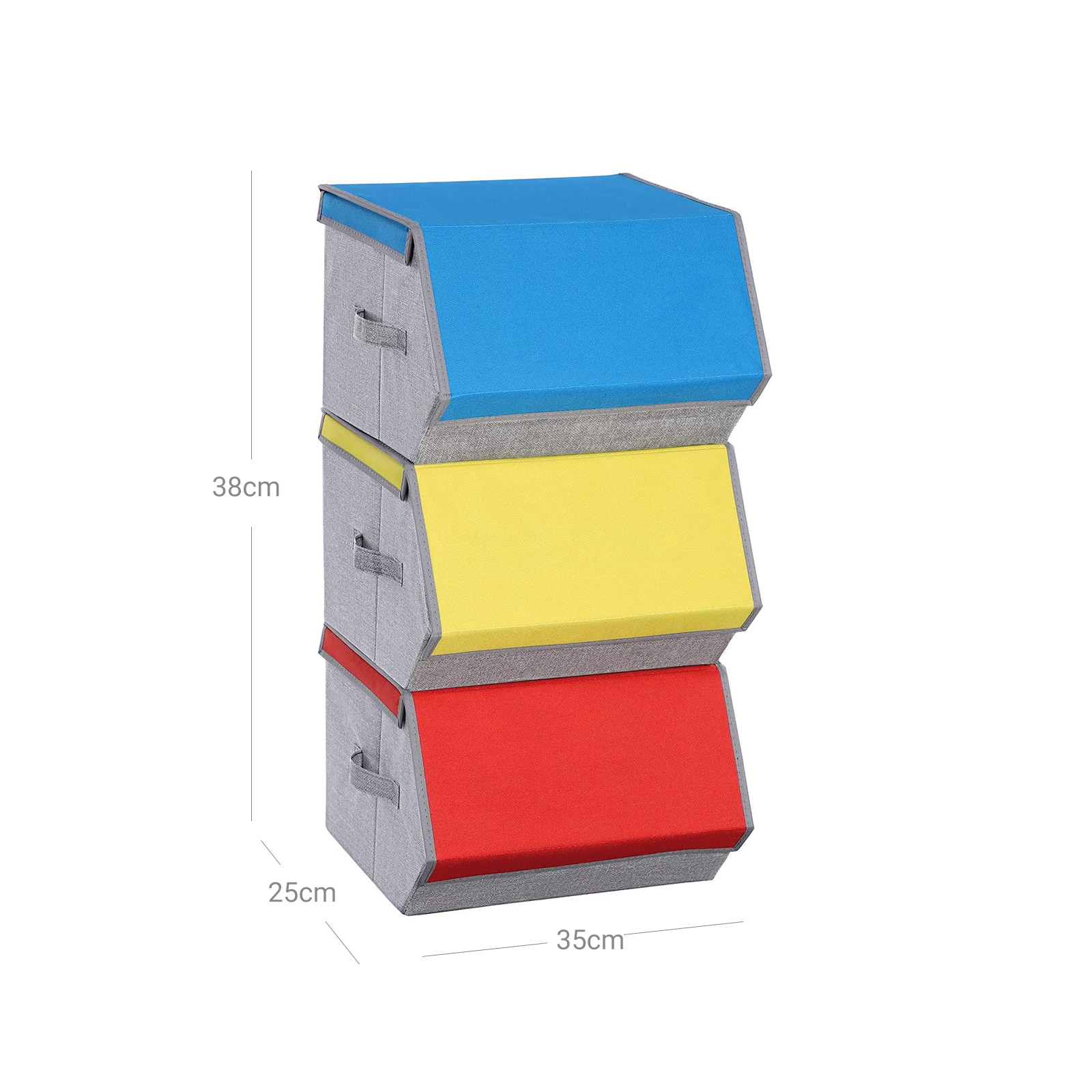 I forskellige farver: Mangler du opbevaringsplads p? b?rnev?relset? Pr?v disse 3 farverige opbevaringskasser fra SONGMICS! Levende farver, praktisk design ? disse kasser hj?lper dine b?rn med at holde orden p? deres ting og motiverer dem samtidig til at rydde op. Stabelbare: Disse kasser kan stables oven p? hinanden for at spare plads i din bolig. Placer dem i skabet, ved siden af sofaen eller sengen for at opbevare t?j, leget?j, b?ger, sko eller tasker p?nt. Stabilt stabelbart: Hver kasse er udstyret med en robust metalramme indvendigt, der sikrer god stabilitet, n?r de stables oven p? hinanden. Desuden er oversiden udstyret med velcrolukninger, der forhindrer utilsigtet glidning.Sammenklappelig: N?r de ikke er i brug, kan du nemt klappe disse kasser sammen og skubbe dem ind under sengen. Produktdetaljer: Farve: Bl?, orange, gul Materiale: Vliesstof med linnedlignende struktur, jernramme, pap, 600D Oxford-stof St?rrelse: 38 x 35 x 25 cm (L x B x H)V?gt pr. kasse: 3 kgMaks. statisk belastning pr. kasse: 10 kgLeveringsomfang:3 x opbevaringskasser (1 i bl?, 1 i orange, 1 i gul)1 x vejledning (DE, EN, FR, ES, IT)SONGMICS Bem?rkninger:Vask ikke produktet direkte med vand. Du b?r t?rre det af med en fugtig klud for at fjerne snavs. Det kan v?re, at produktet har en svag lugt, n?r det pakkes ud. I s? fald skal du placere det p? et godt ventileret sted. Lugten forsvinder efter kort tid.