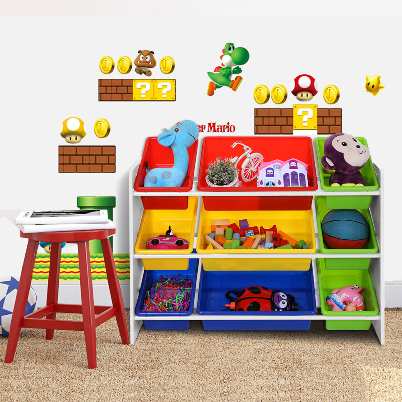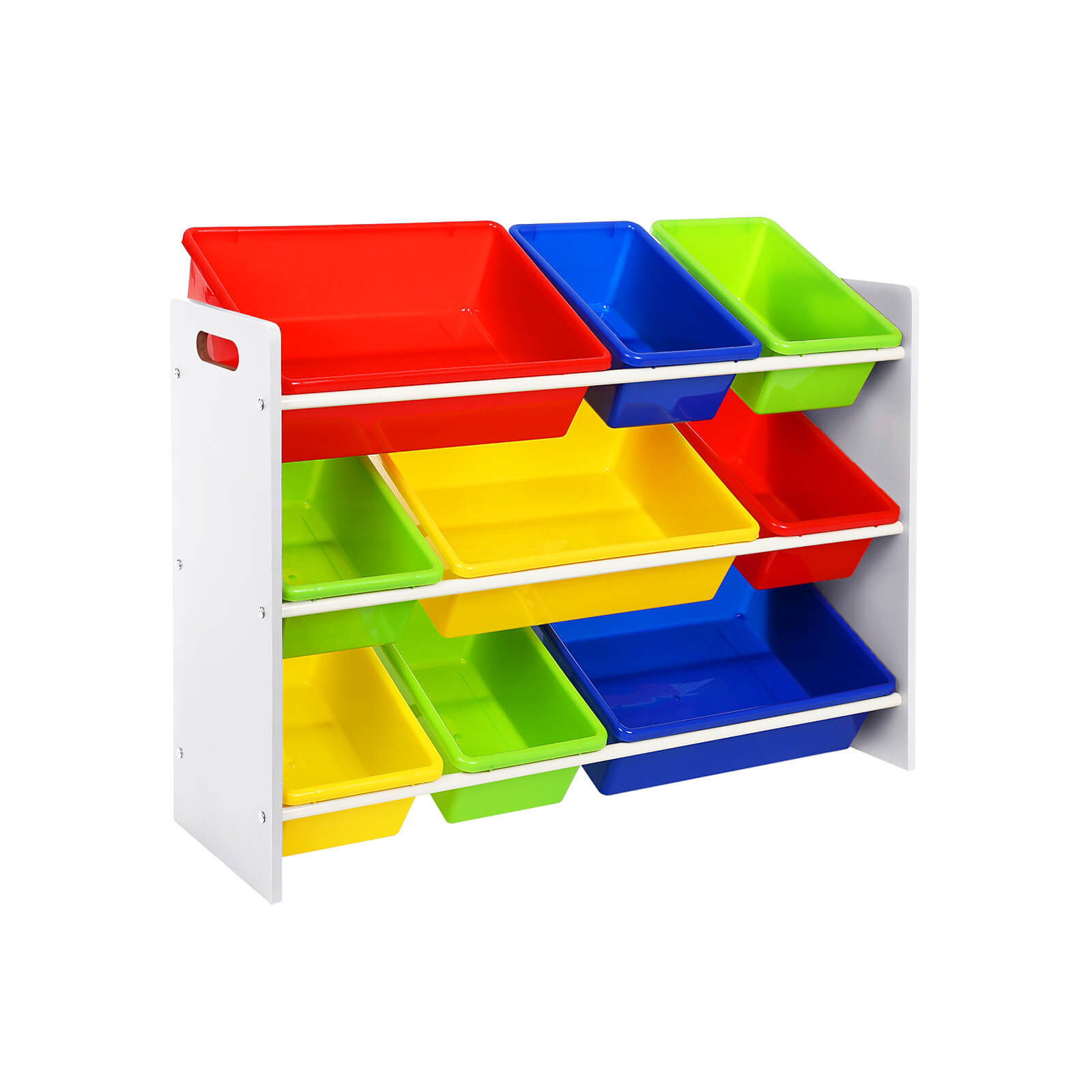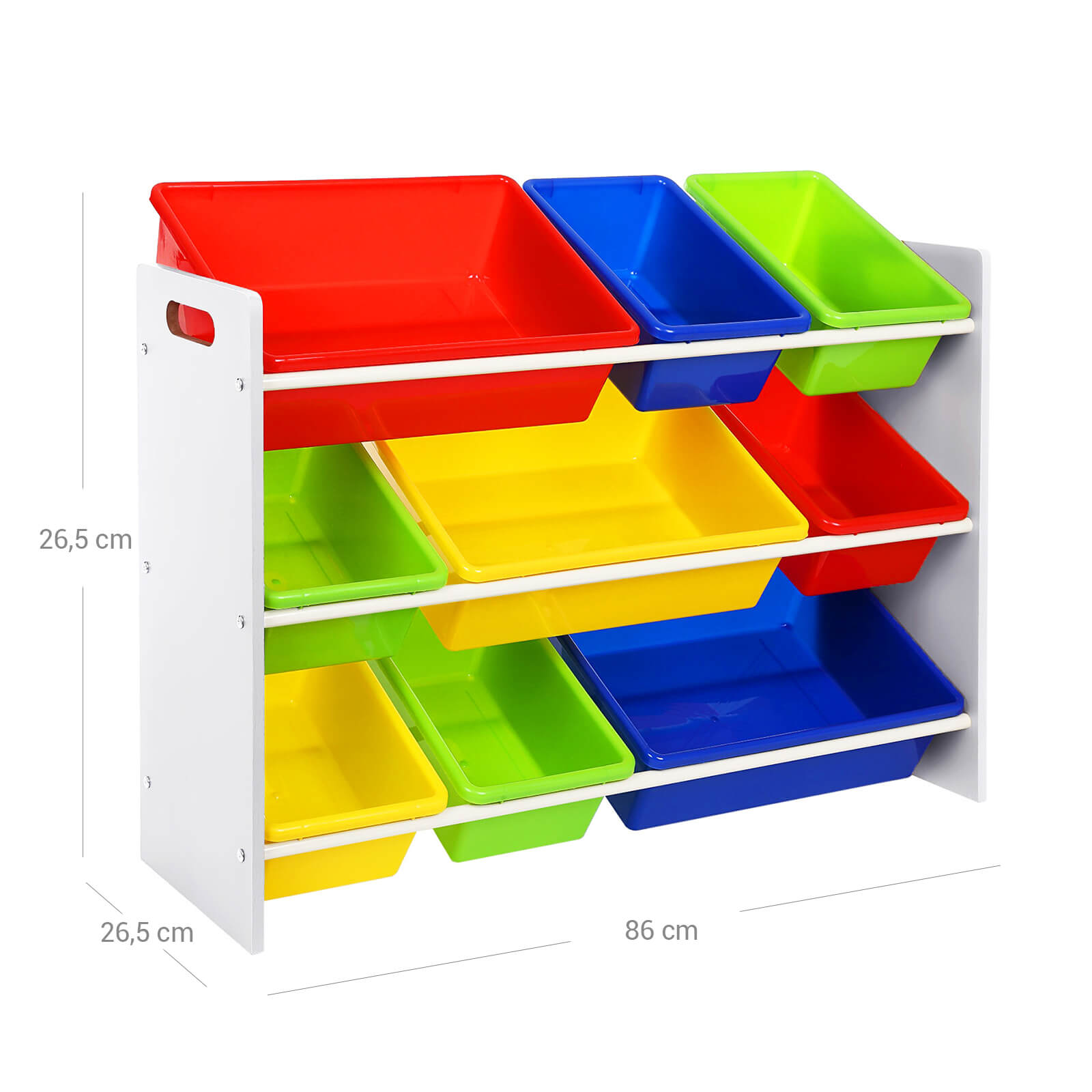 Songmics b?rneopbevaringsreol er et praktisk m?bel til ethvert b?rnev?relse. Reolen har den helt rigtige st?rrelse til b?rn, og kasserne kan ogs? let tages ud af sm? b?rn. P? den m?de v?nner b?rn sig fra en tidlig alder til at rydde op p? deres v?relser.Sammenlignet med stofkasser er PP-kasser mere robuste, holdbare og nemmere at reng?re. Med Songmics b?rneopbevaringsreol kan leget?j, bamser, b?ger og meget mere opbevares, s? der er orden i b?rnev?relset.Produktdetaljer: Materiale stel: milj?venlig MDF-plade Farve stel: hvid M?l: 86 x 60 x 27 cm (B x H x D) Materiale kasser: milj?venlig PP-plast Farve kasser: r?d, gul, bl?, gr?n M?l kasser (store): hver 41 x 12 x 29,5 cm (B x H x D) M?l kasser (sm?): hver 30,5 x 12 x 20 cm (B x H x D) Leveringsomfang: 1 x opbevaringsreol til b?rn 1 x vejledning (DE, EN, FR, IT, ES) 1 x beslagspose (mellem kasserne)