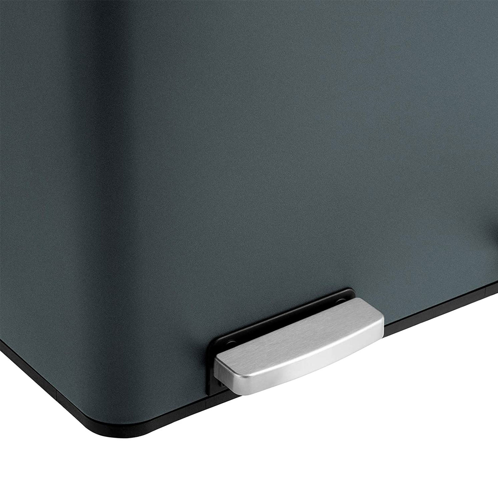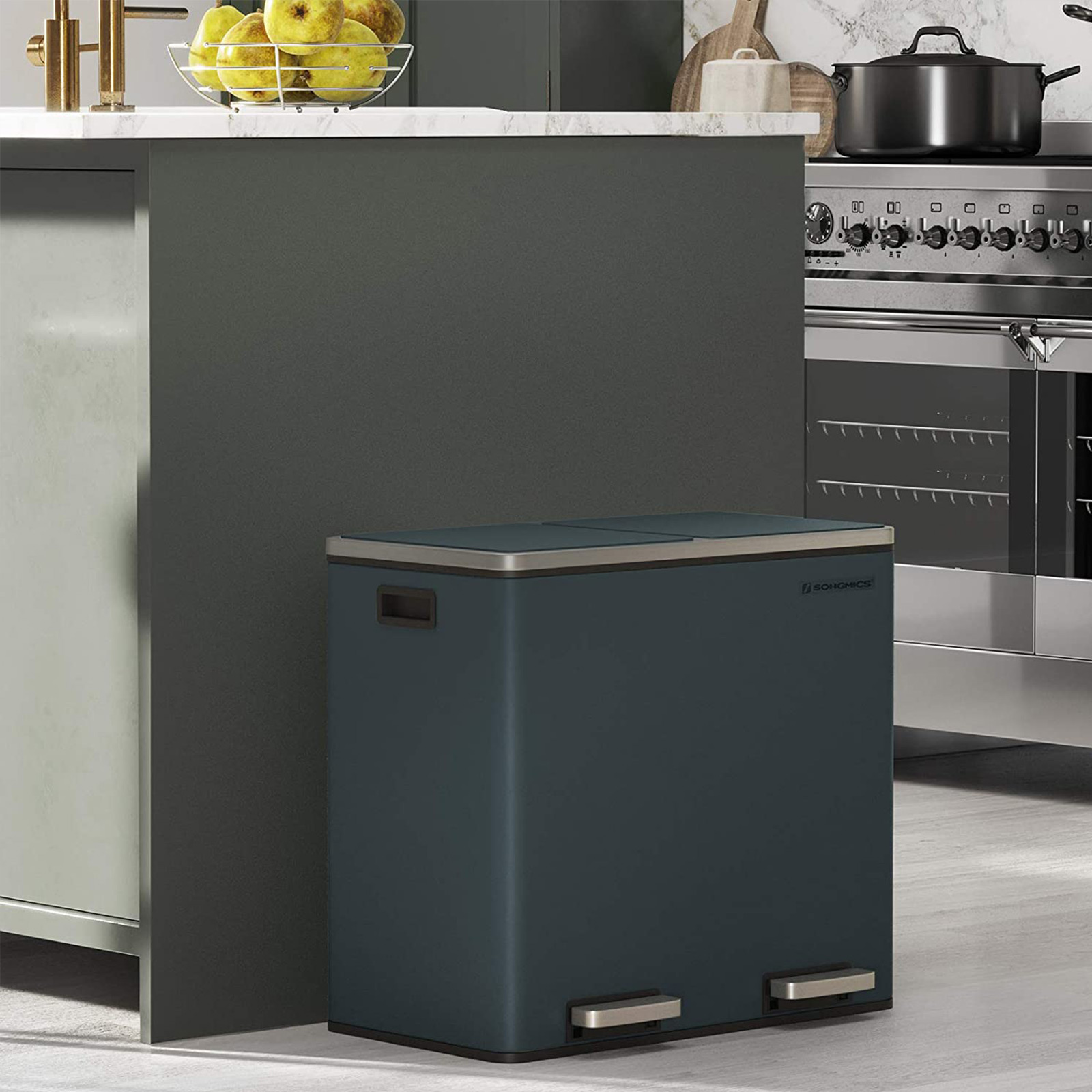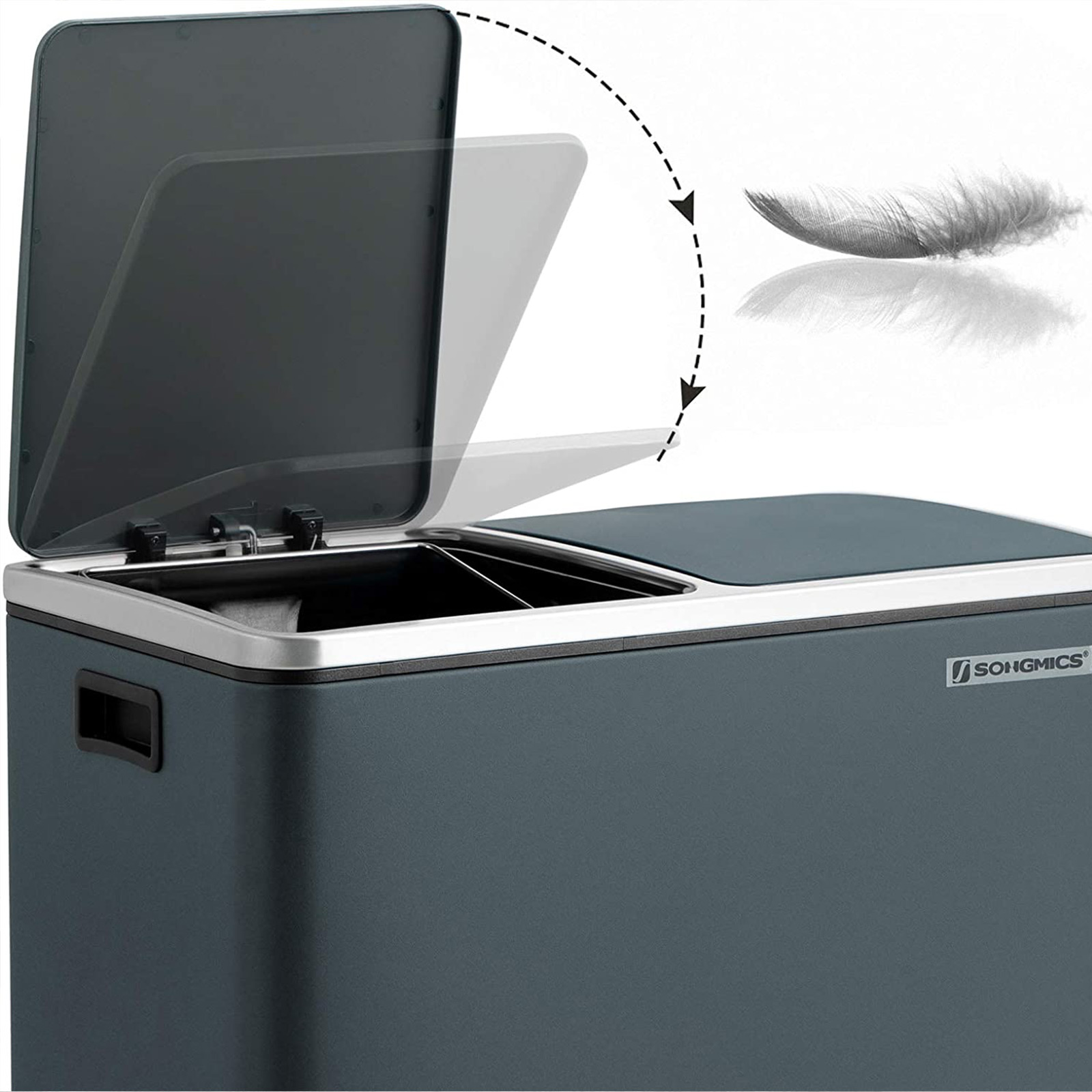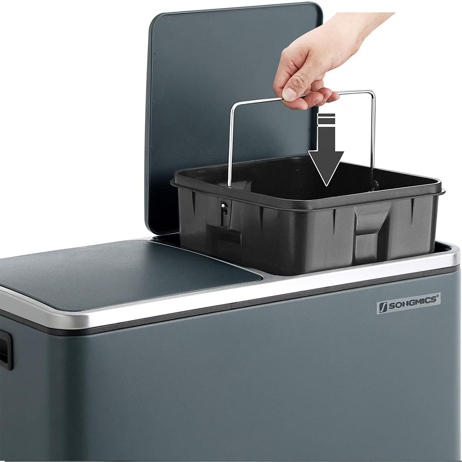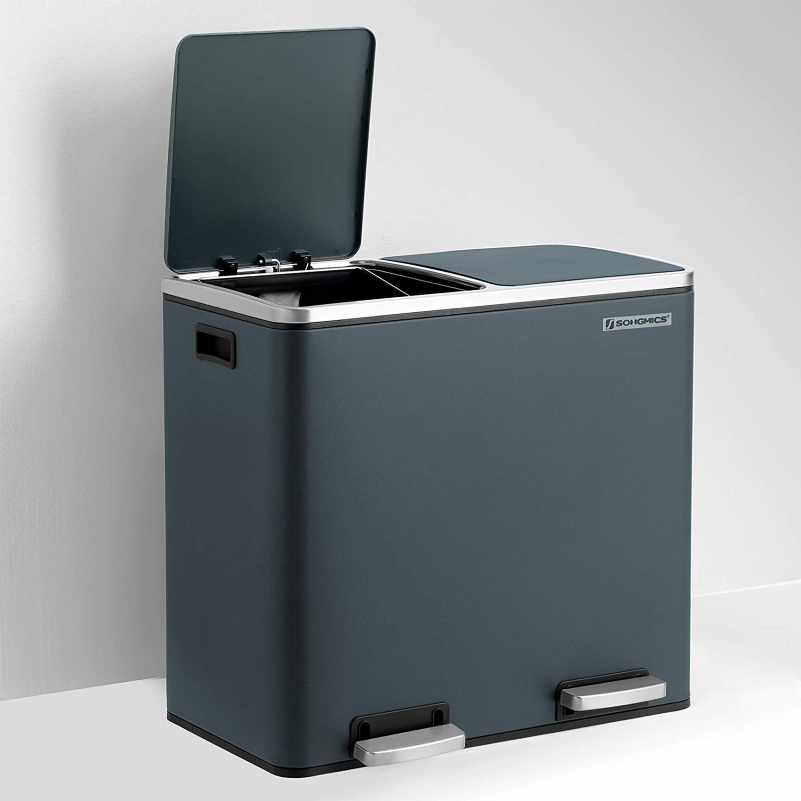 Hvorfor v?lge denne skraldespand fra SONGMICS? Moderne og stilfuld Robust, fremstillet af premium-materialer Gennemt?nkt, praktisk design Genbrug kan ogs? v?re nemt: Med denne skraldespand med 2 separate rum kan du nemt sortere dit affald, f.eks. restaffald og bioaffald. Alt, du skal g?re, er at tr?de p? pedalen og smide affaldet i den indvendige spand. Du beh?ver ikke engang at r?re skraldespanden med h?nden, hvilket sikrer god hygiejne. En “hvalpe- og b?rnesikker” skraldespand: Roder din hund ofte i skraldespanden? Stikker dine sm? ofte h?nderne ned i den ?bne beholder? Hvis ja, vil du sikkert gerne s?tte en stopper for det. Her kommer vores pedalsandkasse ind i billedet! F?rst n?r du tr?der p? pedalen, ?bnes l?get. Produktdetaljer: Farve: R?ggr? Materiale: St?l, PP-plast (indvendig spand), ABS-plast (l?g) Samlet st?rrelse: 58,5 x 32 x 54,5 cm (L x B x H) St?rrelse pr. indre spand: 27,5 x 26,5 x 48 cm (L x B x H) Samlet h?jde (med ?bent l?g): 83 cm V?gt: 7,5 kg Leveringsomfang: 1 x skraldespand 1 x vejledning (DE, EN, FR, ES, IT) SONGMICS Bem?rkninger:T?r produktet af med en fugtig klud og t?r det derefter af.