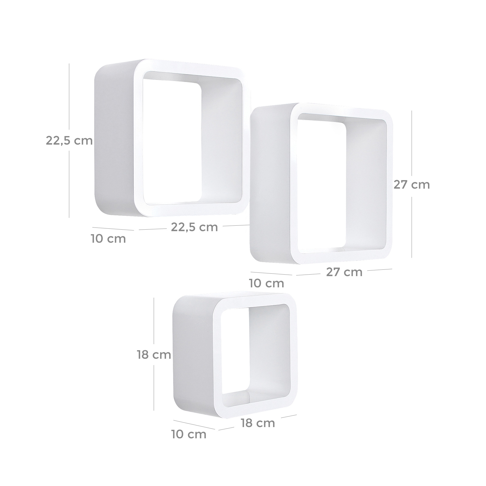 Disse smukke v?ghylder i elegant retrostil er praktiske og dekorative genstande i enhver bolig! Songmics hyldes?ttet best?r af MDF-plader, der er fremstillet i overensstemmelse med emissionsklasse E1. Det er fugtbestandigt, vrider sig ikke let og har en h?j b?reevne. Efter forarbejde med omhyggelig slibning/spartling er lakken omhyggeligt p?f?rt flere gange i h?nden, og farven er holdbar, j?vn og blank. Hylderne kan samles p? et ?jeblik og kan monteres b?de vandret og lodret. Med sit nye design og moderne stil er hyldes?ttet den ideelle opbevaringsplads til b?ger, cd’er og andre sm?ting. Som v?ghylde eller blot som fritst?ende dekoration ? det 3-i-1-kubes?t er et absolut blikfang! Produktdetaljer: – Materiale: MDF-plader (klasse E1) med en pladetykkelse p? 1,8 cm – Udvendige m?l: lille hylde: 18 x 18 x 10 cm (B x H x D); mellemhylde: 22,5 x 22,5 x 10 cm (B x H x D); stor hylde: 27 x 27 x 10 cm (B x H x D) – Indvendige m?l: lille hylde: 14,4 x 14,4 x 10 cm (B x H x D); Mellemste hylde: 19 x 19 x 10 cm (B x H x D); Stor hylde: 23,4 x 23,4 x 10 cm (B x H x D) – Emballagem?l: 39 x 39 x 23 cm – V?gt: 3,8 kg? Leveringsomfang: – 1 x s?t v?ghylde (3 kubehylder) – 1 x s?t skruer og dyvler til montering – 1 x vejledning (DE, FR, EN, IT, ES) SONGMICS Bem?rk: – Til montering kr?ves en akku-skruemaskine, et vaterpas og en hammer. – Fastg?r produktet til en betonv?g, letbetonv?g eller murstensv?g. Hvis du ?nsker at fastg?re produktet til en gipsplade, skal du f?rst anskaffe passende skruer i en specialforretning.