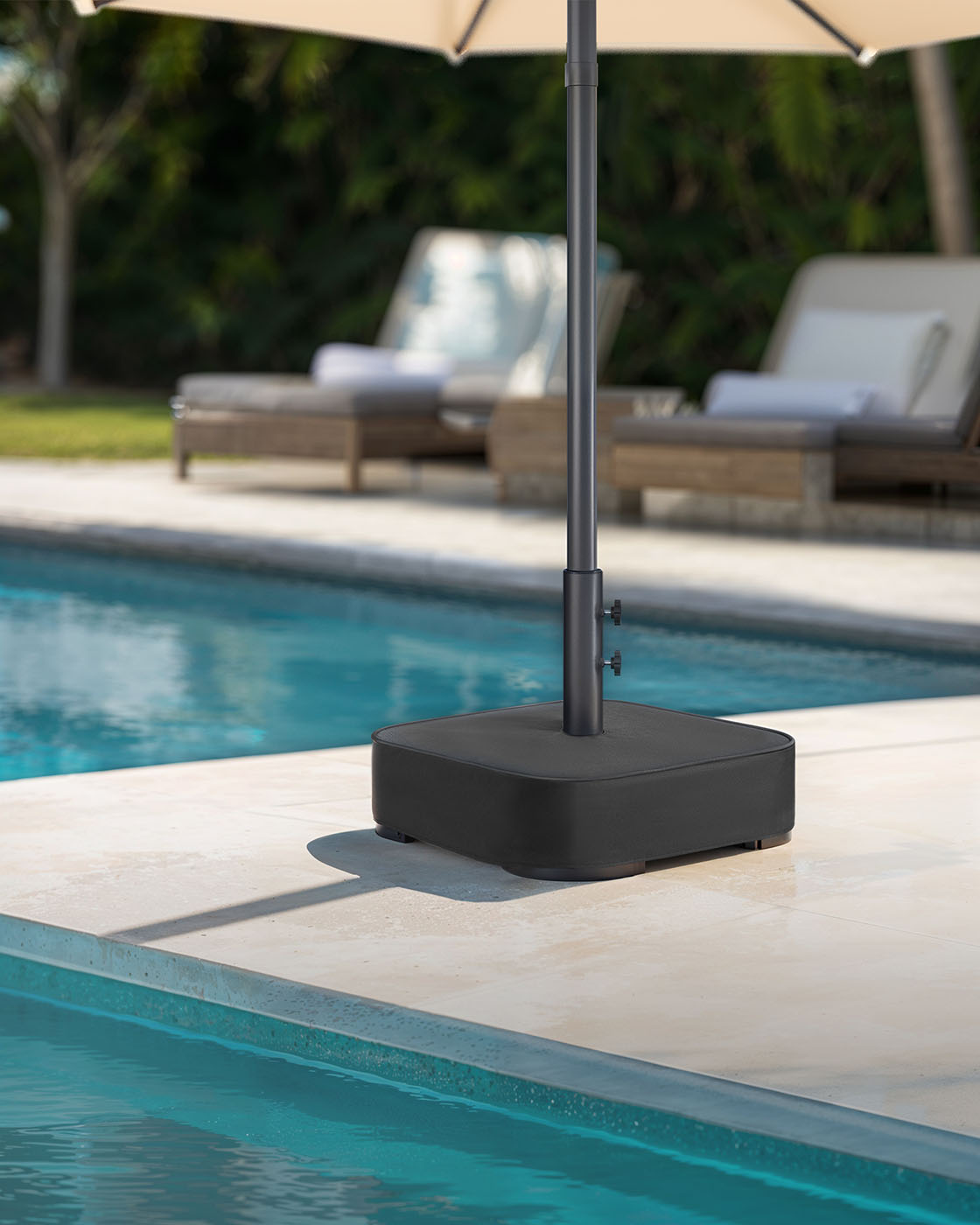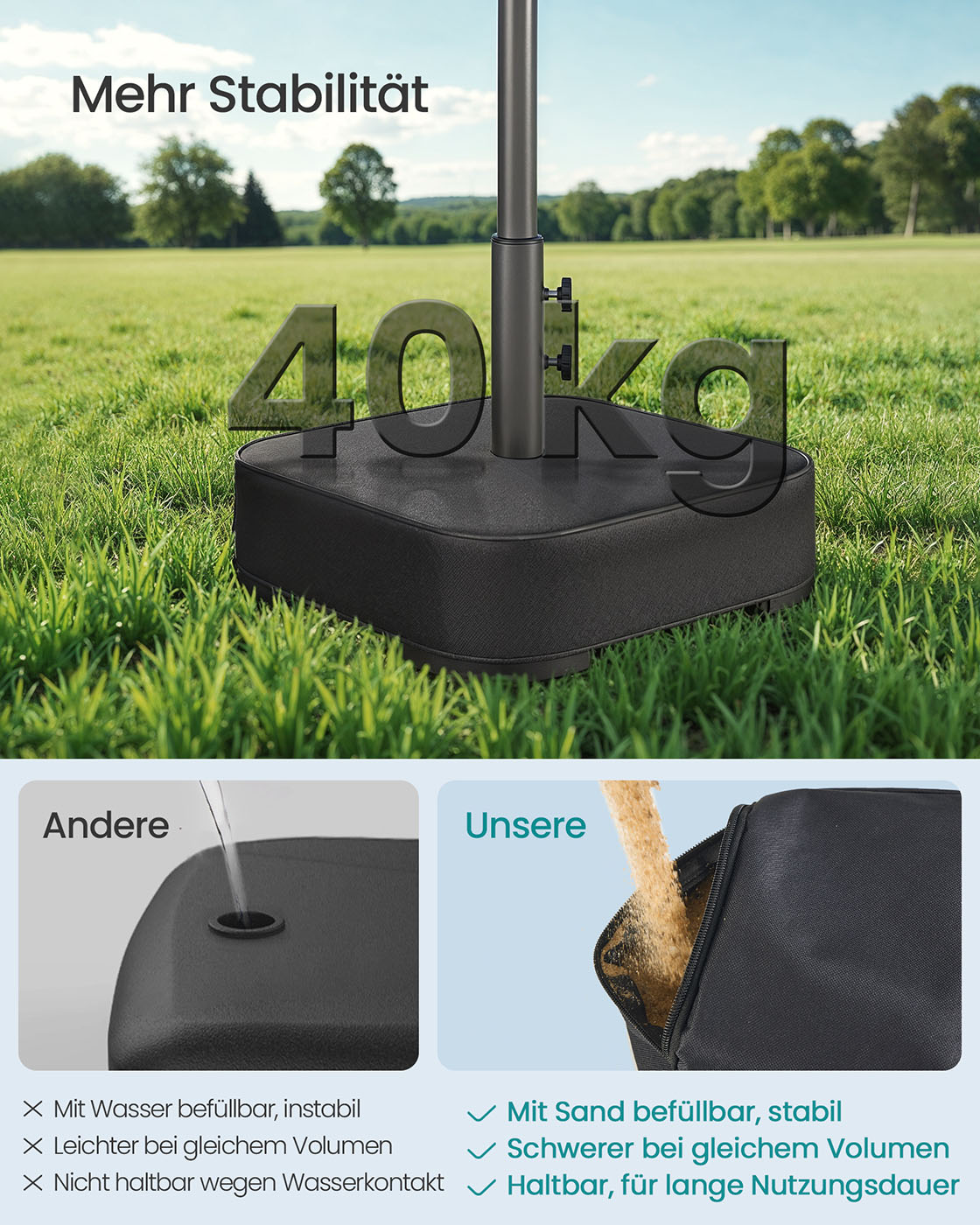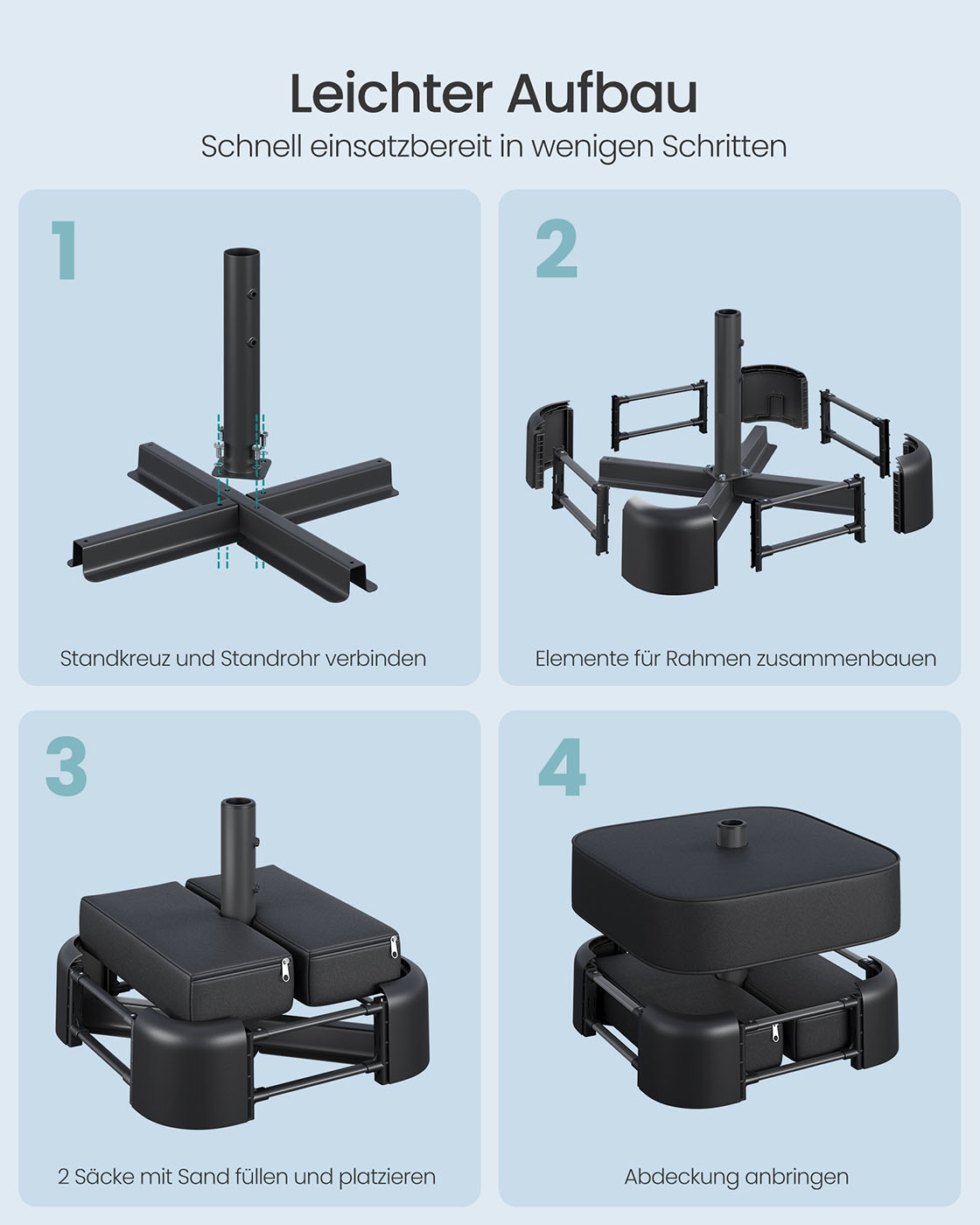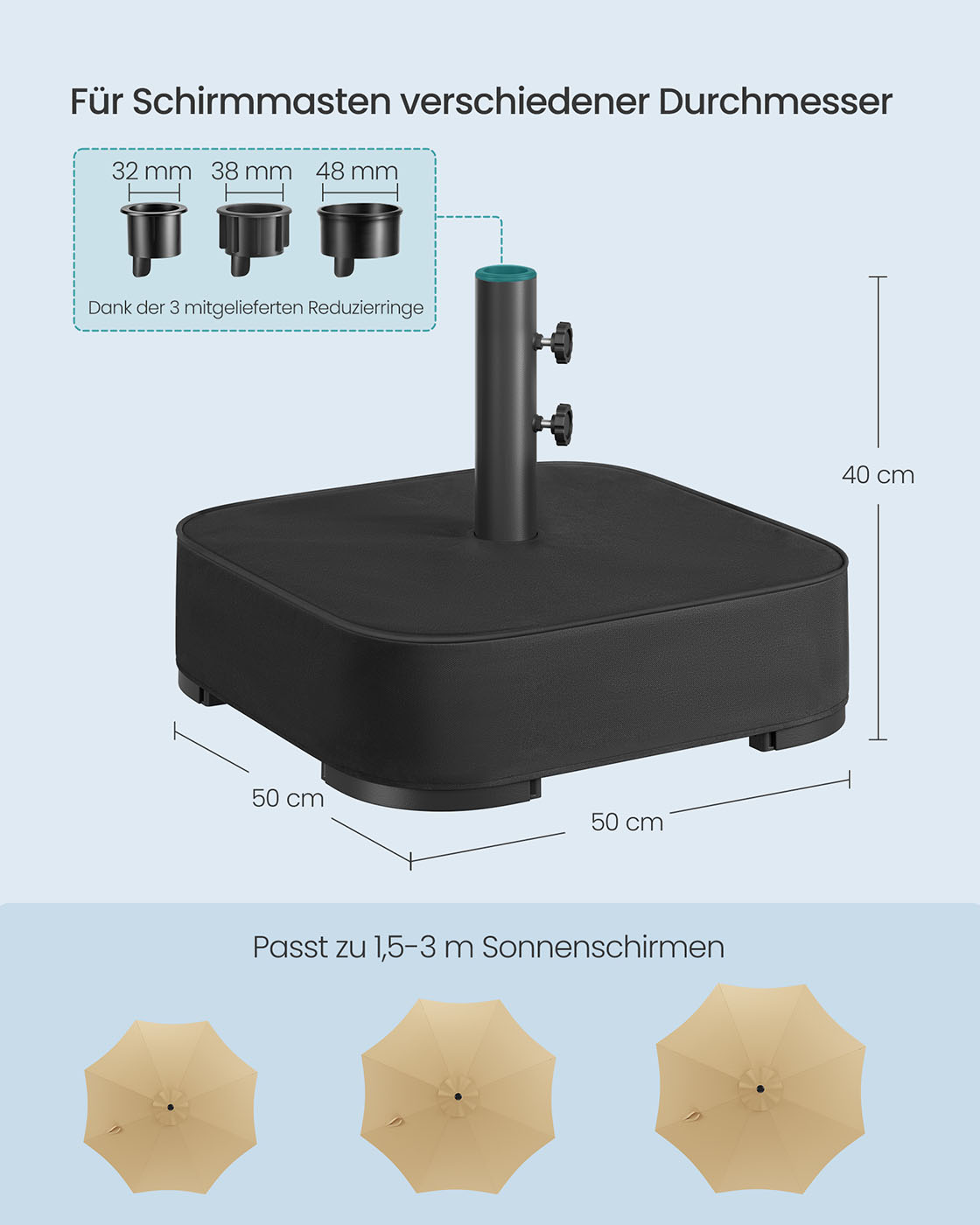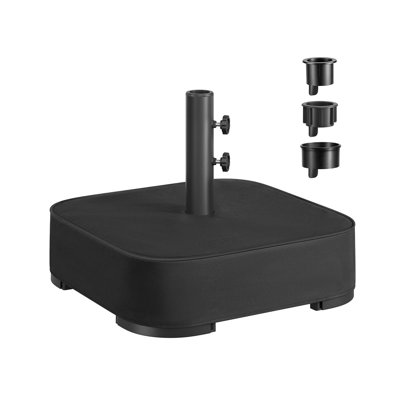 SONGMICS Parasolstativ, parasolholder, kan fyldes med sand, parasolholder, til 1,5-3 m parasol, parasolfod, med 3 reduktionsringe, sort GUB0041B01