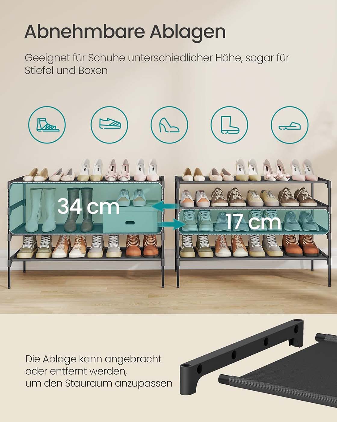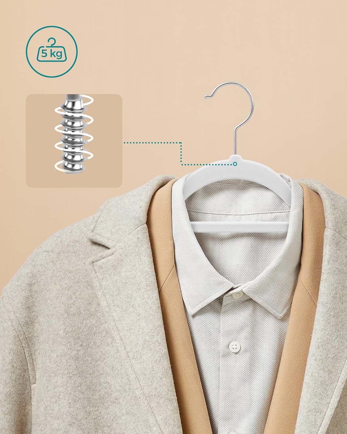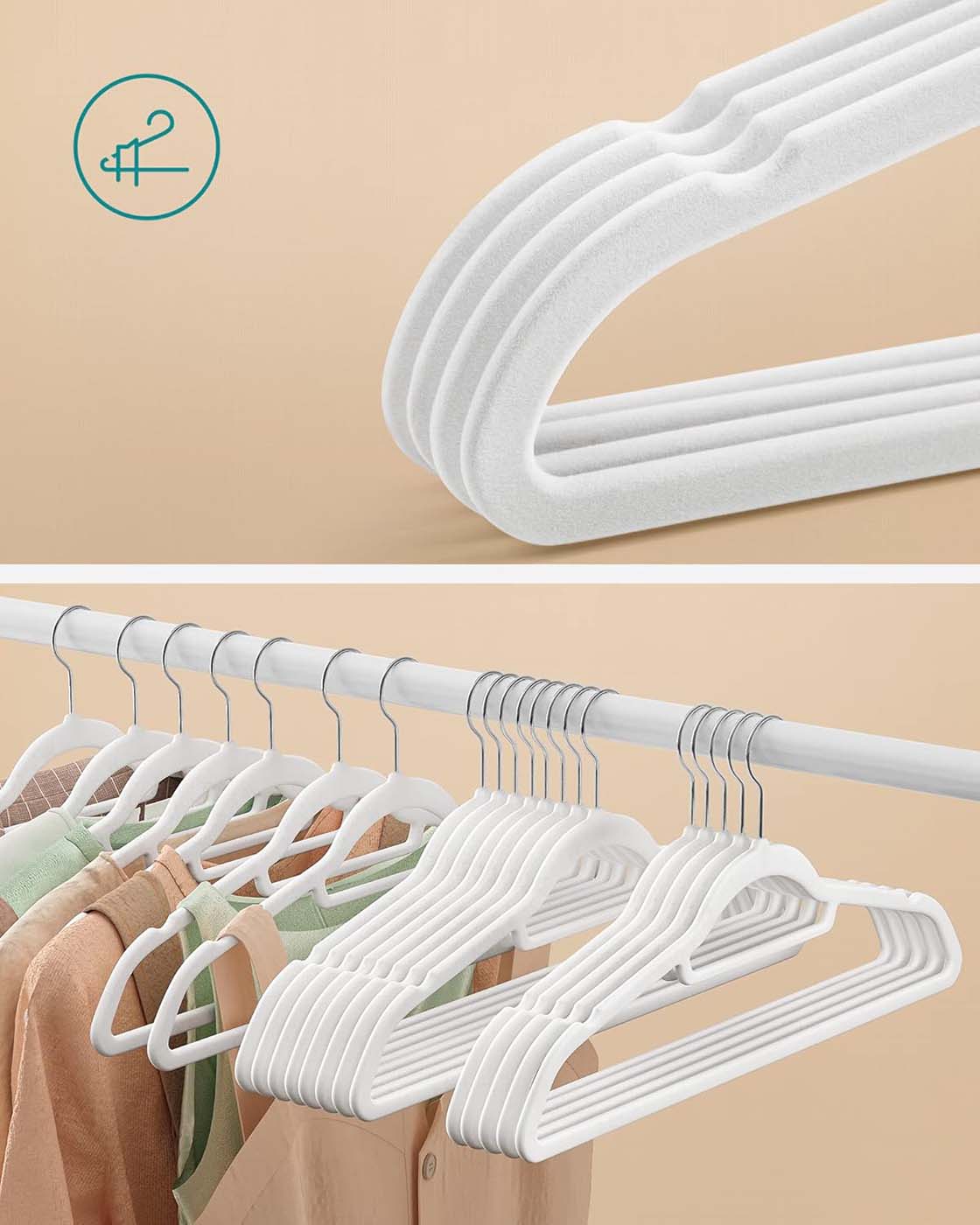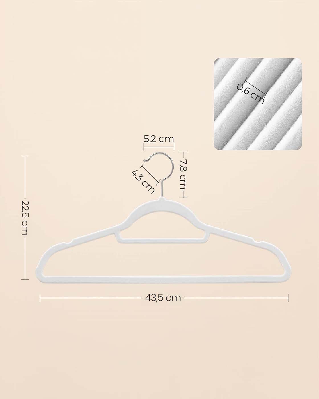 Fordobl pladsen i dit skab Sammenlignet med r?rb?jler tager disse 0,6 cm tynde velourb?jler mindre plads, s? du kan f? dobbelt s? meget t?j i dit kl?deskab. En perfekt l?sning til begr?nsede garderobeskabe! S? st?rke, men ogs? s? bl?deDisse jakkeb?jler er st?rke nok til at kunne b?re selv dine tunge vinterjakker. Men de har ogs? bl?de sider ? takket v?re deres behageligt bl?de overflade kan selv dine fineste t?j h?nges op uden at blive kr?llede. Disse farverige b?jler ser ikke kun godt ud, men fungerer ogs? som en praktisk hj?lp i hverdagen. Her er plads til hele outfittet P? disse b?jler kan du ikke kun h?nge jakker, skjorter eller tr?jer, men takket v?re den lille midterstang ogs? slips, b?lter og t?rkl?der. L?g bukserne blot over den stabile tv?rstang. Produktdetaljer: – Farve: Hvid – Materiale: Fl?jl, ABS-plast, metalhage – St?rrelse pr. b?jle: 45 x 0,6 x 23,5 cm (L x B x H) – V?gt pr. b?jle: 78 g – Maks. statisk belastning pr. b?jle: 5 kg Leveringsomfang: – 20 x fl?jlsb?jler SONGMICS Bem?rkninger:- H?ng ikke v?dt t?j p? b?jlerne. – Hold b?jlerne v?k fra varme- og ant?ndelseskilder. – Brug ikke b?jlerne i omgivelser med h?j temperatur eller h?j luftfugtighed.