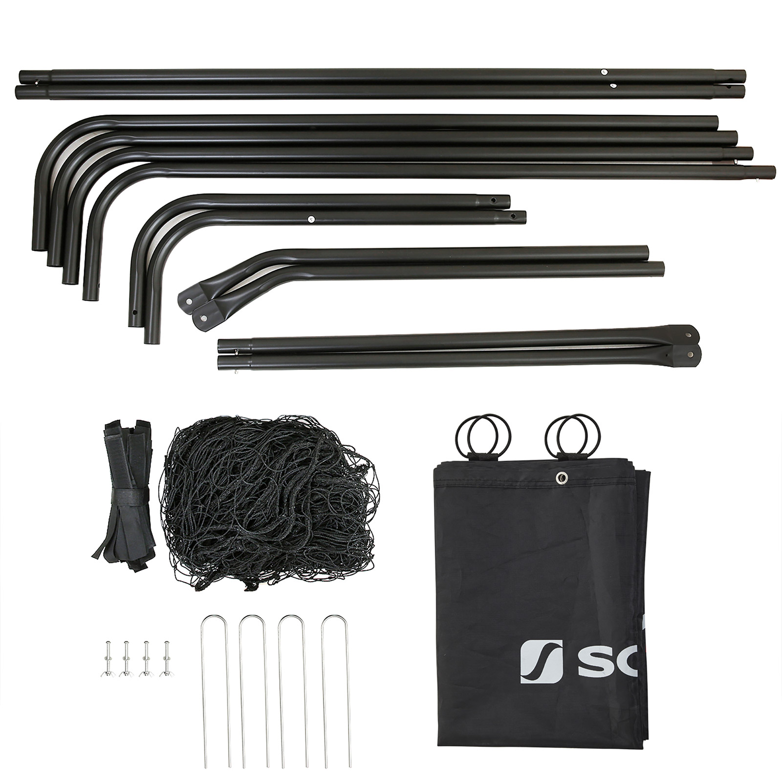 Produktdetaljer: Farve: Sort Materiale: Pulverlakerede jernr?r, PE-net, Oxford-stof St?rrelse p? fodboldm?let: 215 x 76 x 150 cm (L x B x H), M?lhuller: ? 40 cm St?rrelse p? m?lv?g: 204 ? 145 cm Maskevidde: 10 x 10 cmV?gt: 5,6 kgLeveringsomfang:1 x fodboldm?l1 x net4 x skrue1 x m?lv?g18 x elastisk l?kke8 x jordanker24 x velcrob?nd1 x vejledning (DE, EN, FR, ES, IT)SONGMICS Bem?rkninger:Dette produkt skal opstilles udend?rs ved hj?lp af det medf?lgende fastg?relsestilbeh?r. S?rg for, at det er fastgjort stabilt til underlaget. Ikke egnet til b?rn under 3 ?r. B?rn over 3 ?r m? kun bruge produktet under opsyn af en voksen.