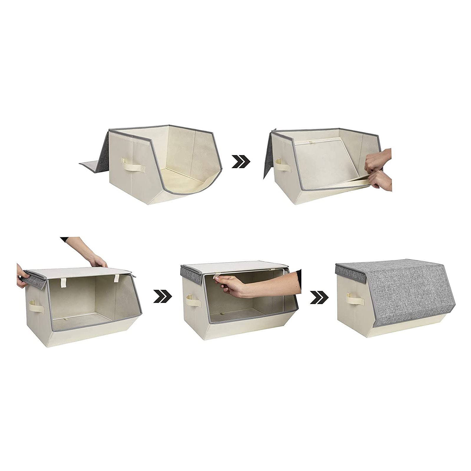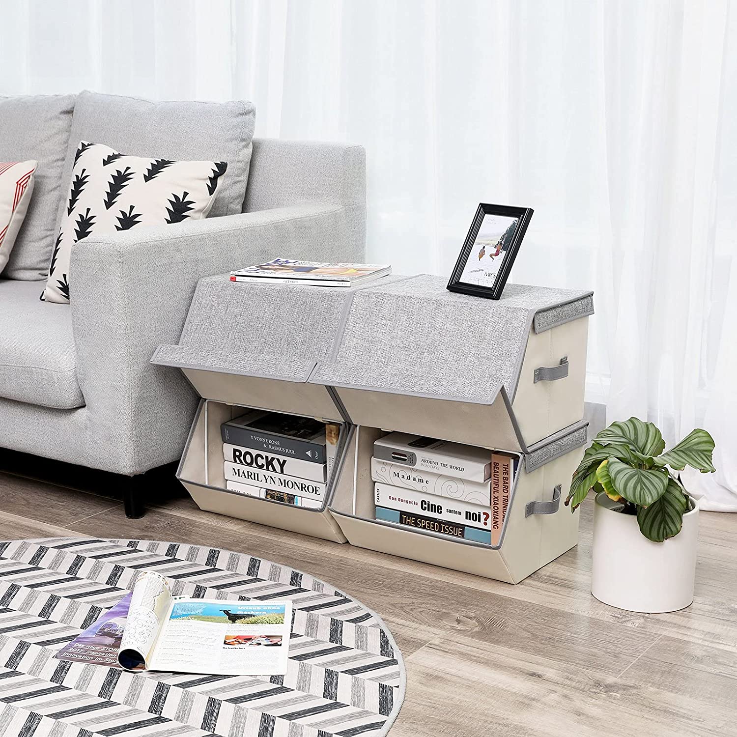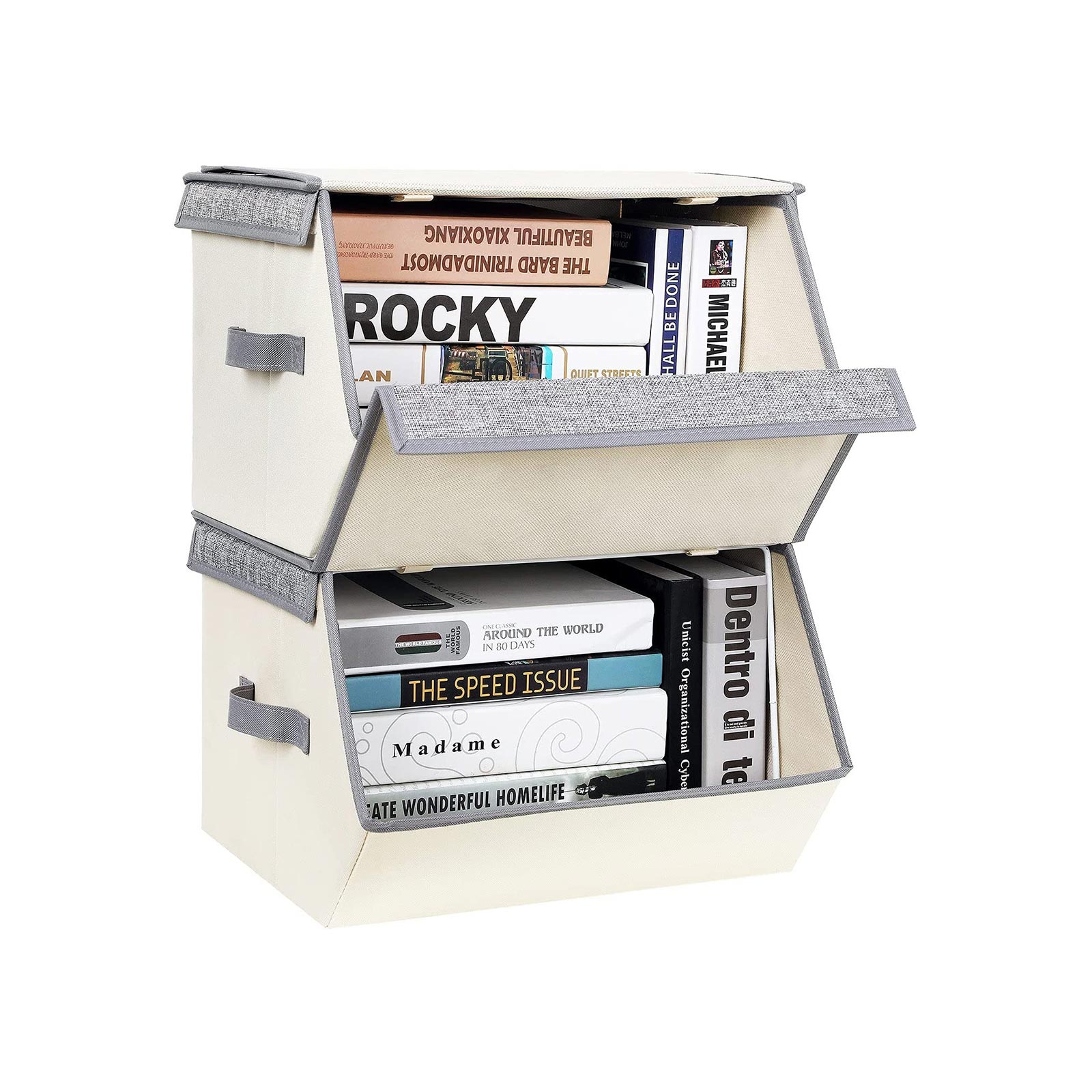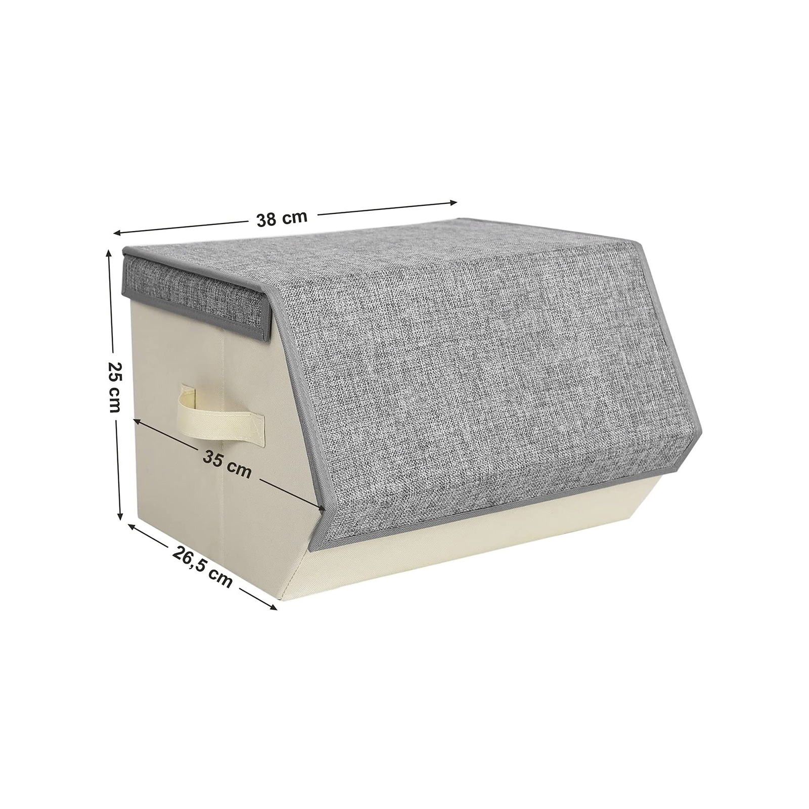 SONGMICS opbevaringsbokse tilbyder dig smarte opbevaringsl?sninger, s? du kan skabe mere opbevaringsplads p? lidt plads, f.eks. i kl?deskabet, p? hylden osv. Med metalringen og velcrolukningen p? bagsiden deformeres opbevaringsboksene ikke, n?r de stables, selv under stor belastning. Det opklappelige l?g med magnetlukning g?r det nemt at tage tingene ud. Farvekombinationen af gr? og beige passer til b?de unge og gamle. Med kasserne kan du opbevare dine daglige forn?denheder perfekt og have dem hurtigt ved h?nden. Hvad venter du p?? Du vil ikke fortryde dit k?b. Produktdetaljer: – Farve: beige, gr? – Materiale: imiteret linned, pap, MDF-plade, metalring – M?l: 38 x 25 x 26,5/35 cm (B x H x D) – V?gt: 2,8 kg / s?t Leveringsomfang: – 2 x opbevaringsboks SONGMICS Bem?rkning: – M? ikke skylles med vand. Ved pletter og snavs t?rres overfladen af med en let fugtig klud og derefter t?rres p? et ventileret sted.